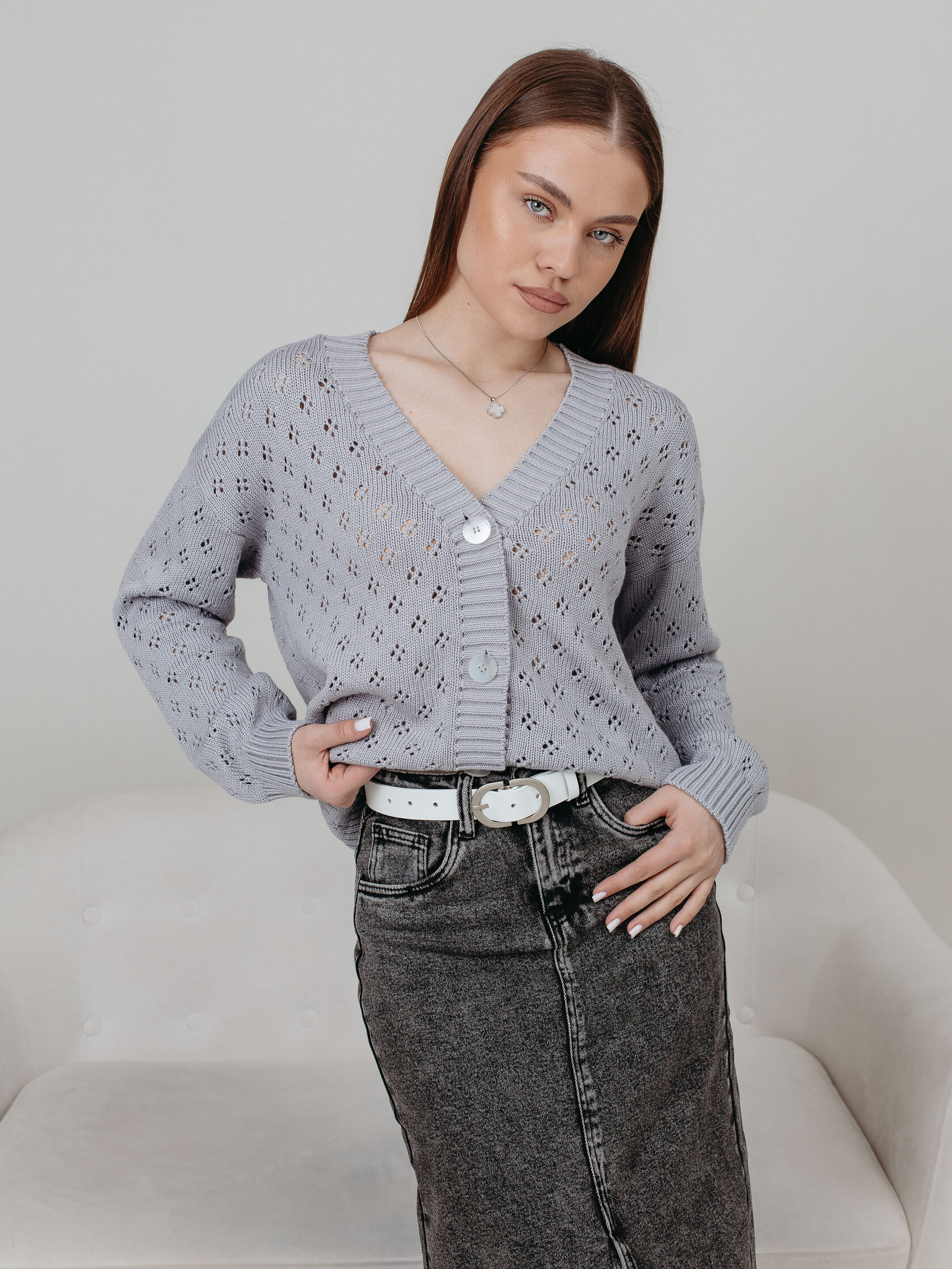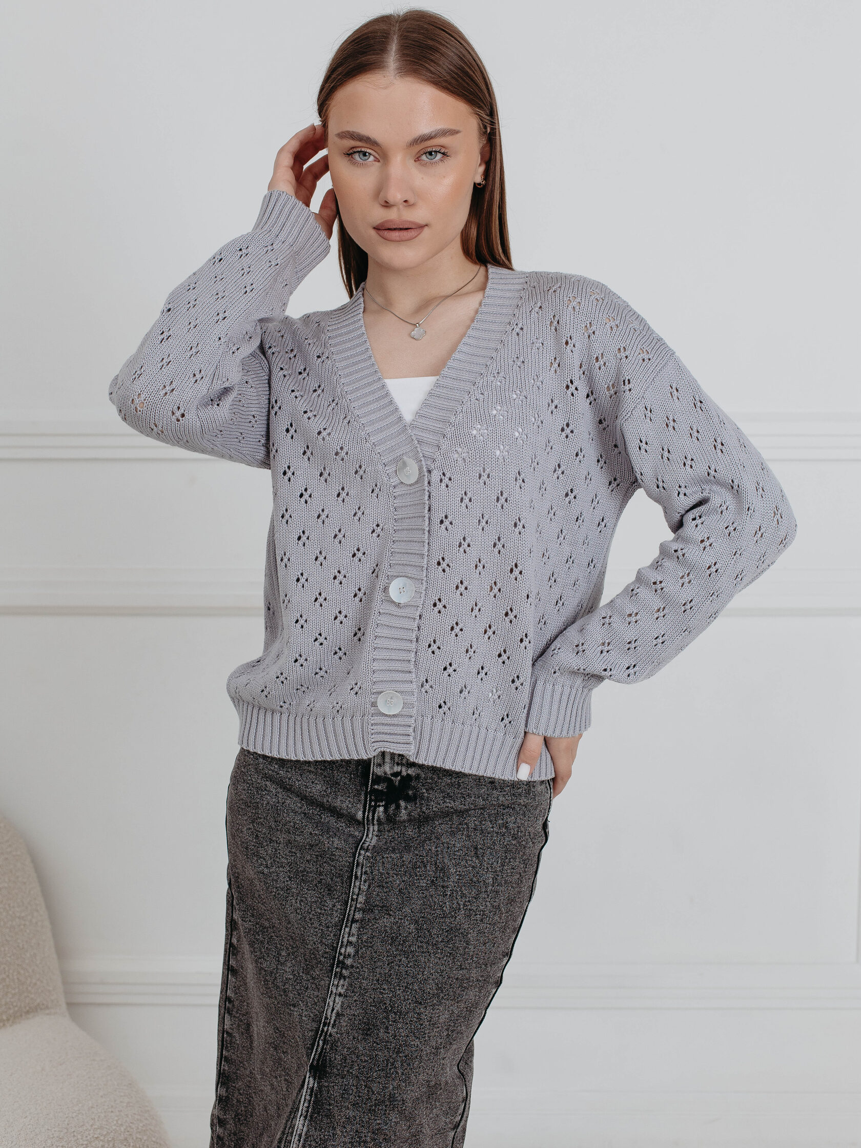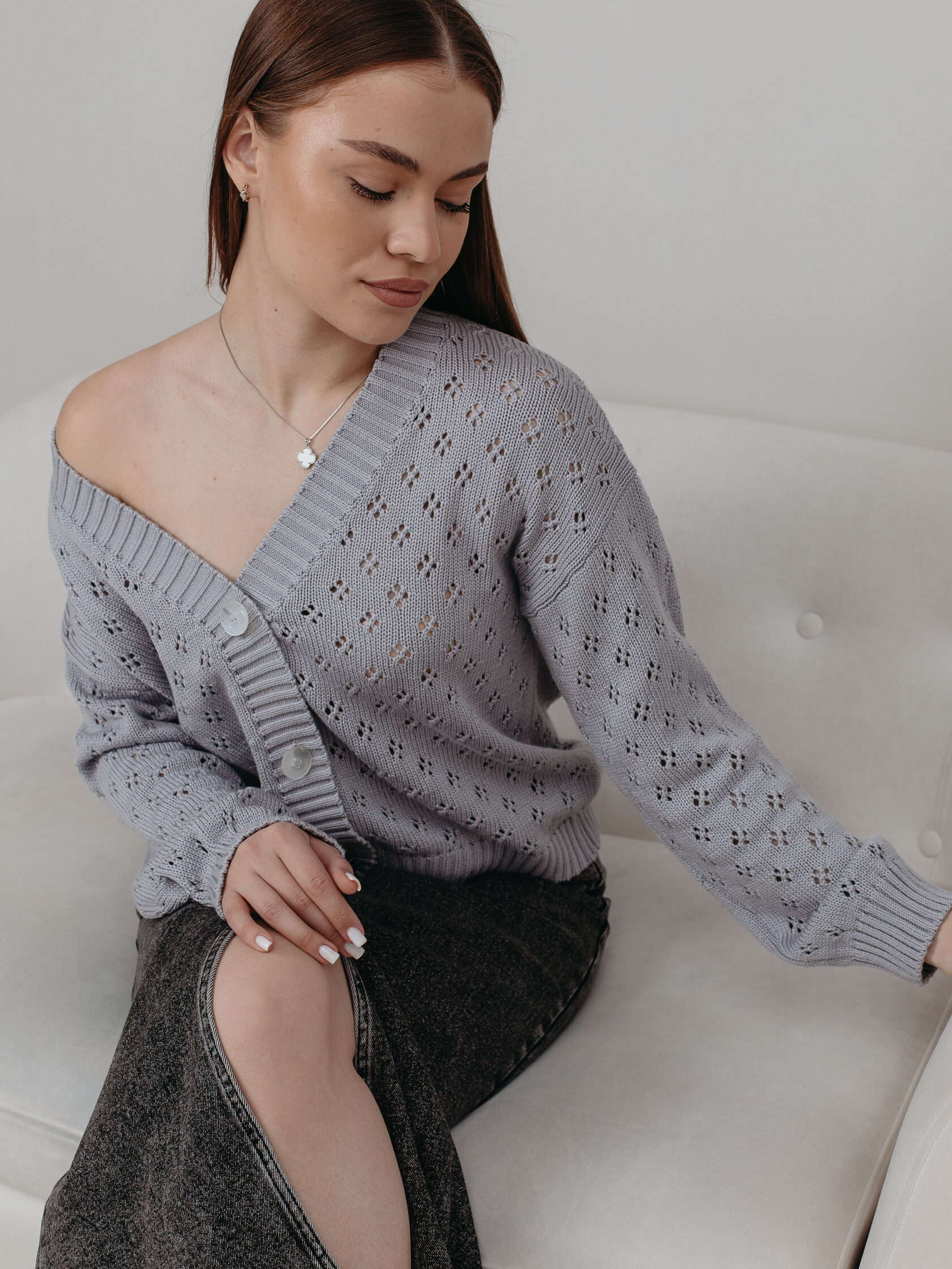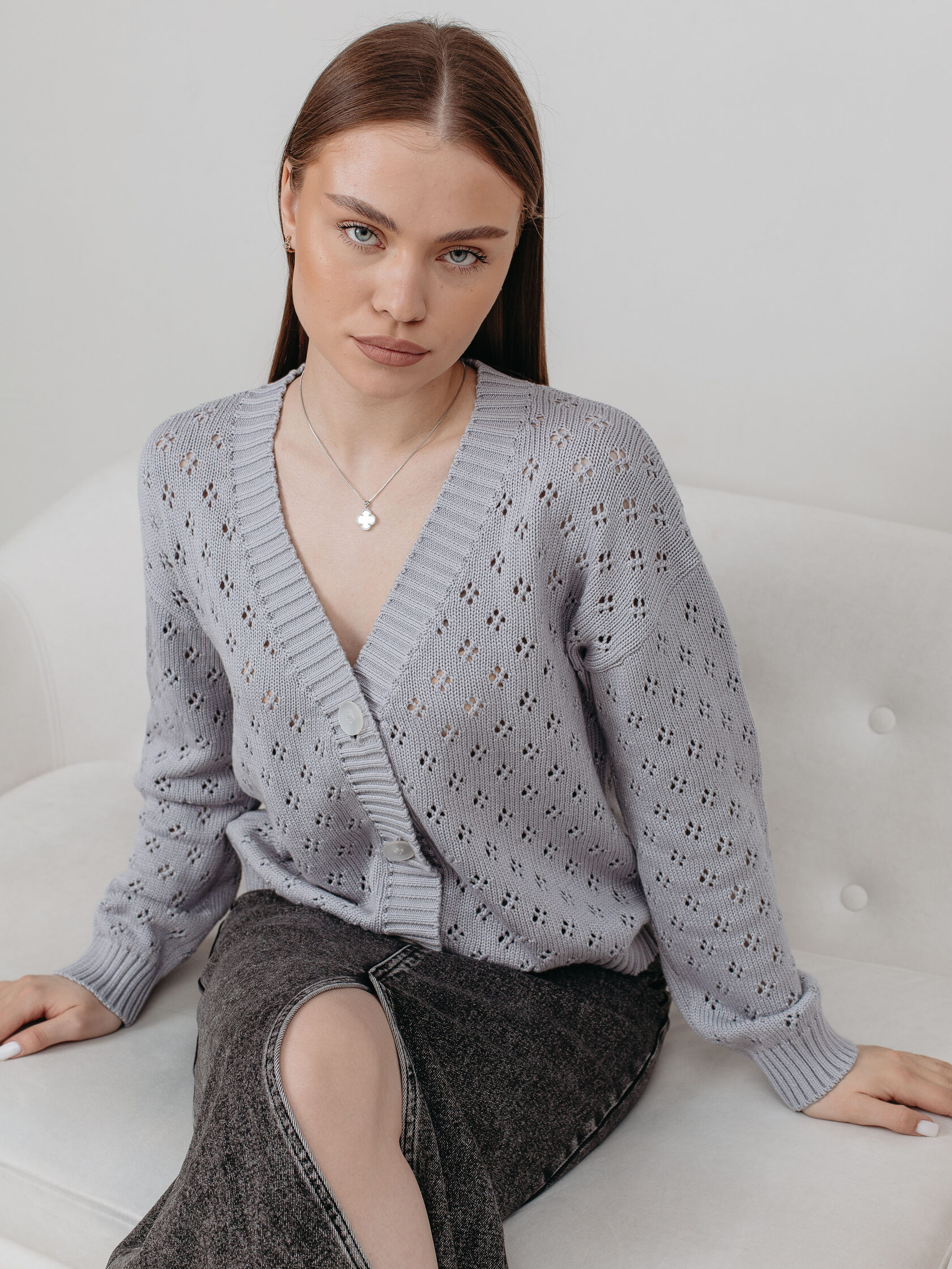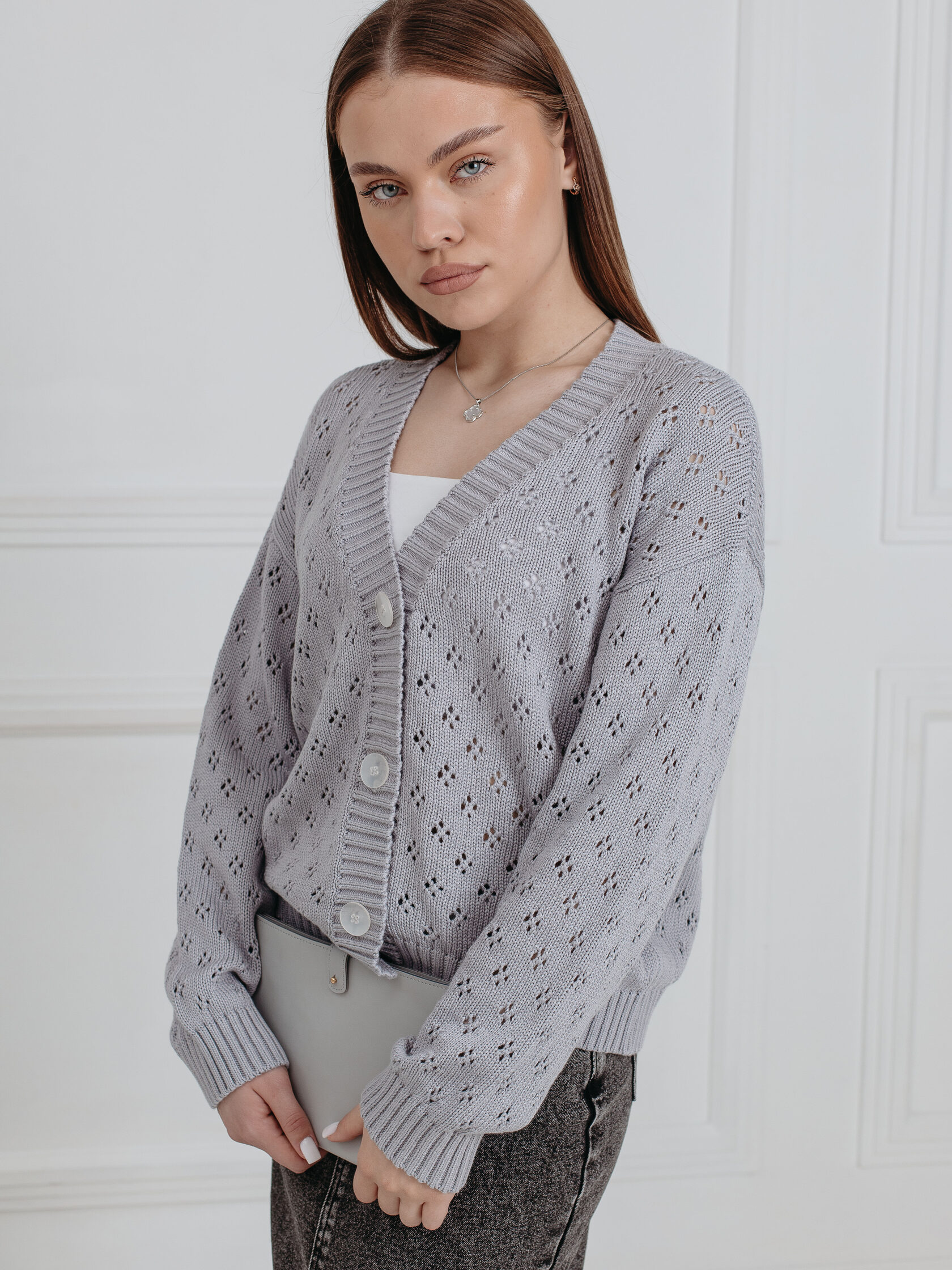 Укороченный женский кардиган свободного кроя в стиле оверсайз, с длинным рукавом испущенной линией плеча. V-образная горловина и край борта обработаны широкой резинкой, на которой выполнены петли, застегивающиеся на пуговицы. Ажурное переплетение придает модели легкости и романтизма. Низ изделия и низ рукава завершены резинкой.
