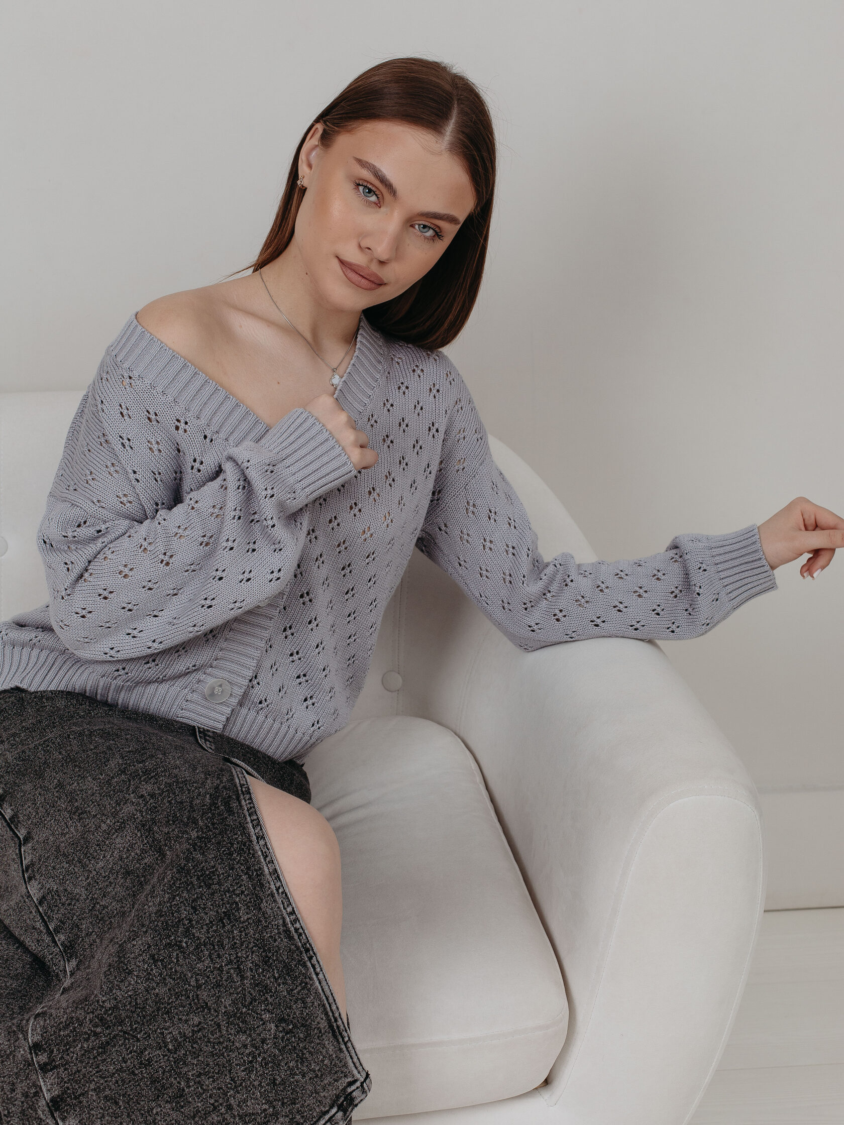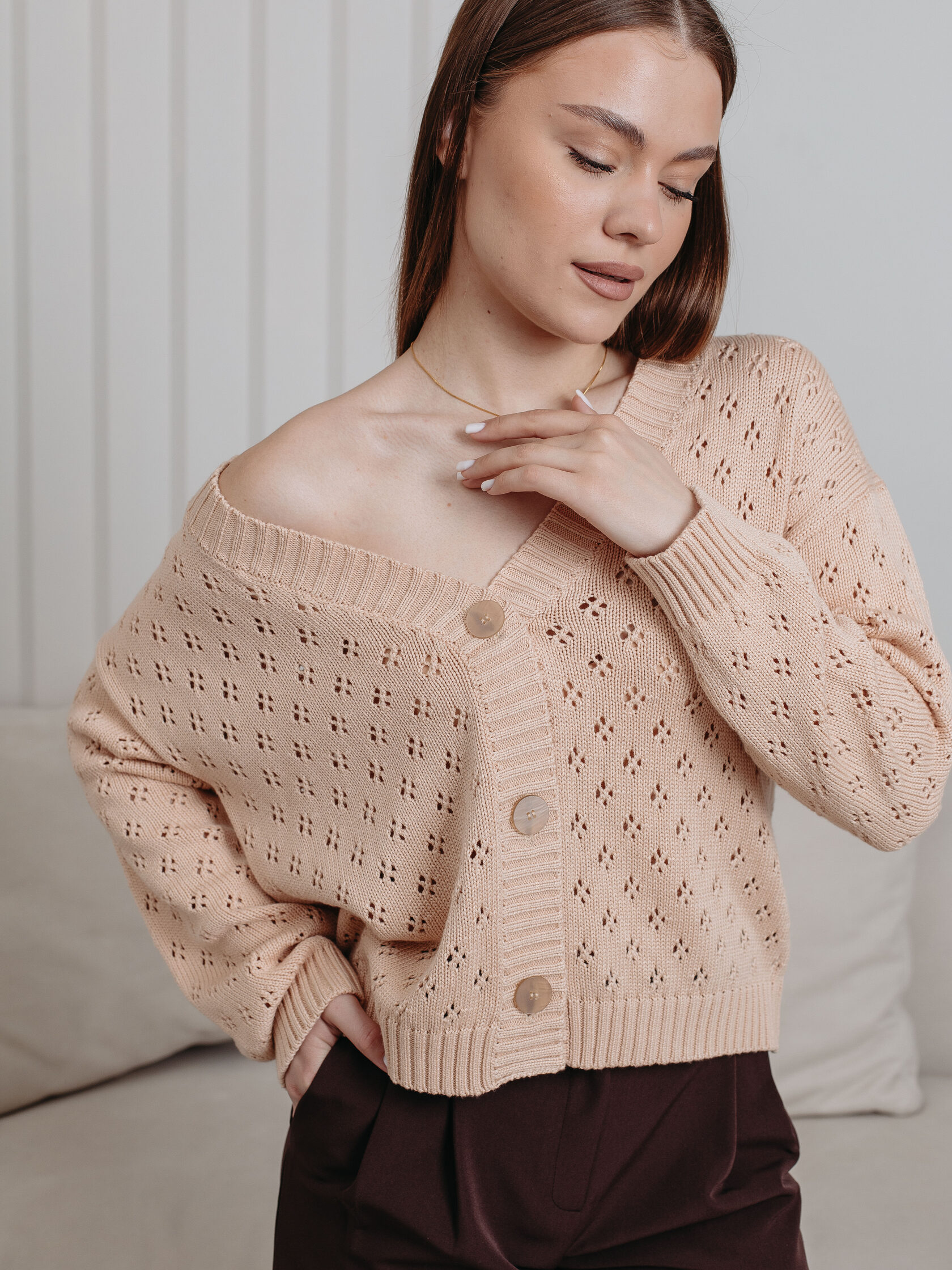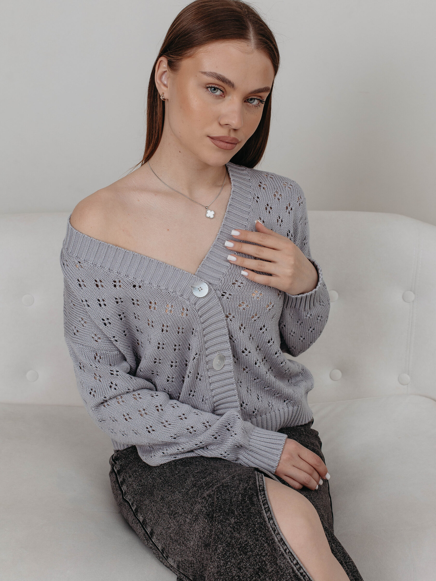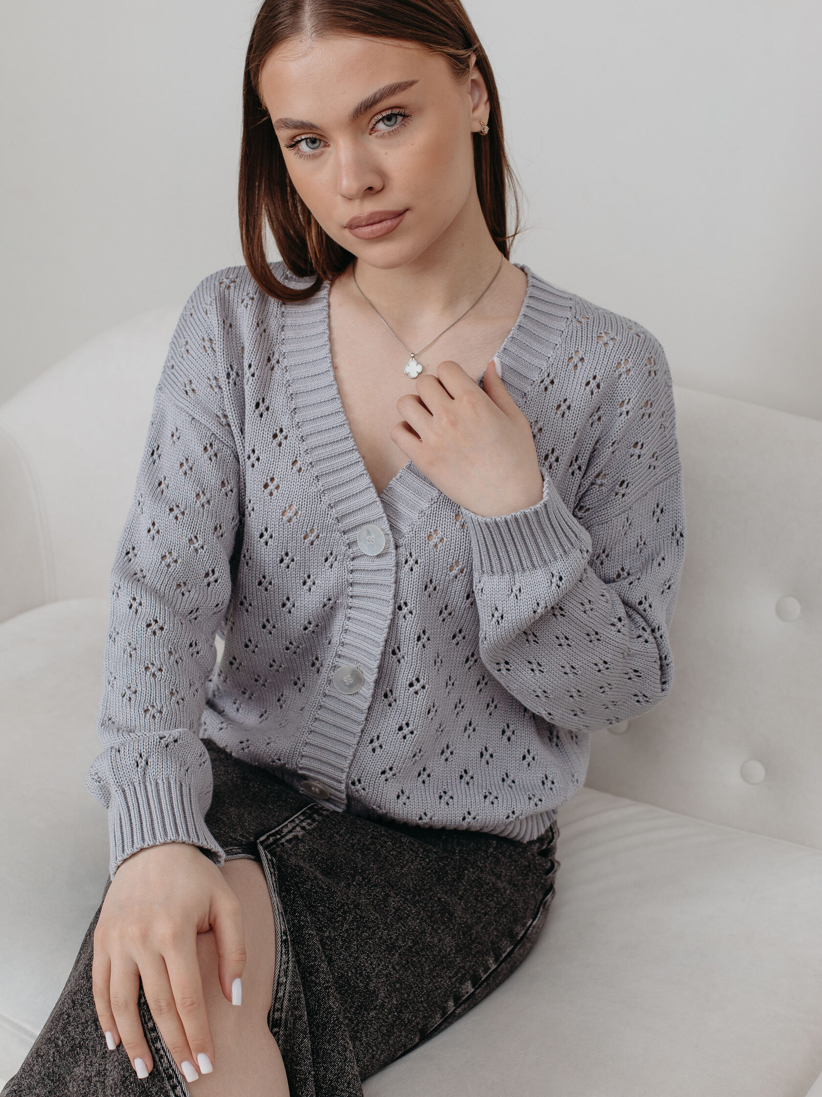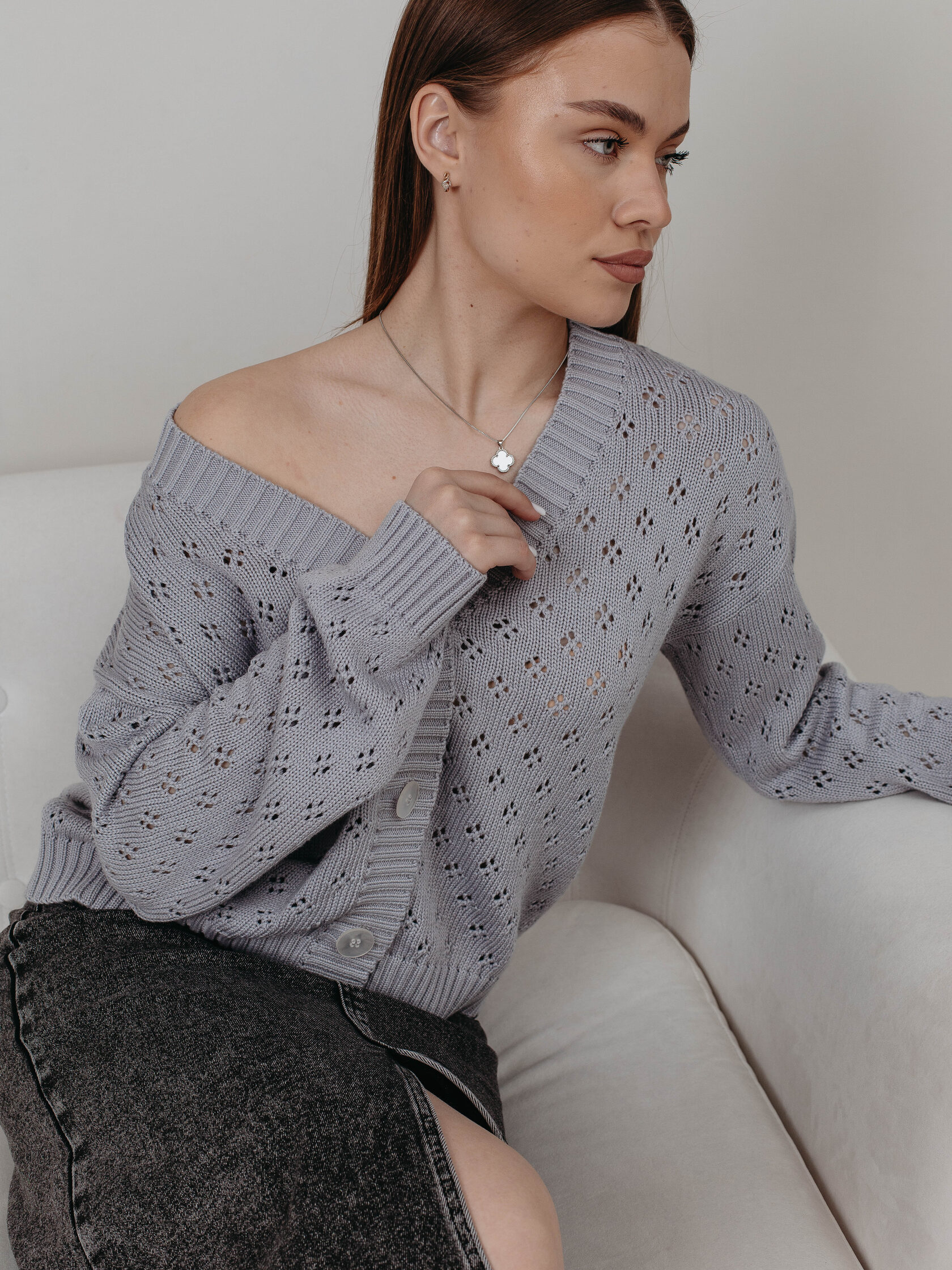 Укороченный женский кардиган свободного кроя в стиле оверсайз, с длинным рукавом испущенной линией плеча. V-образная горловина и край борта обработаны широкой резинкой, на которой выполнены петли, застегивающиеся на пуговицы. Ажурное переплетение придает модели легкости и романтизма. Низ изделия и низ рукава завершены резинкой.