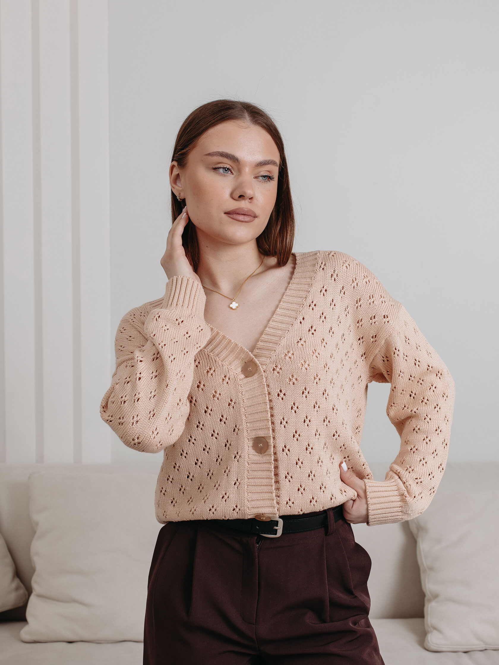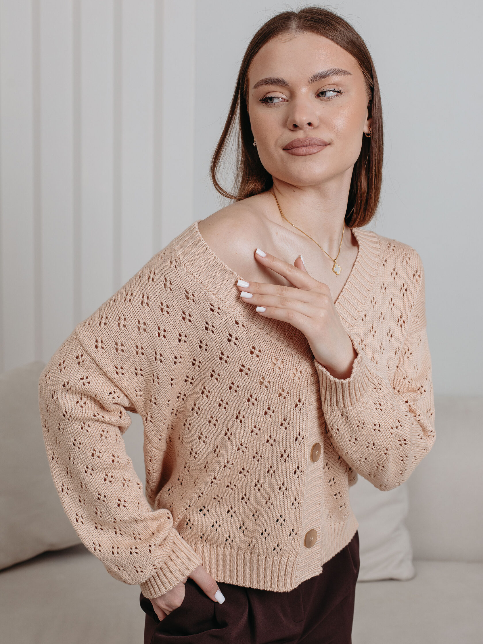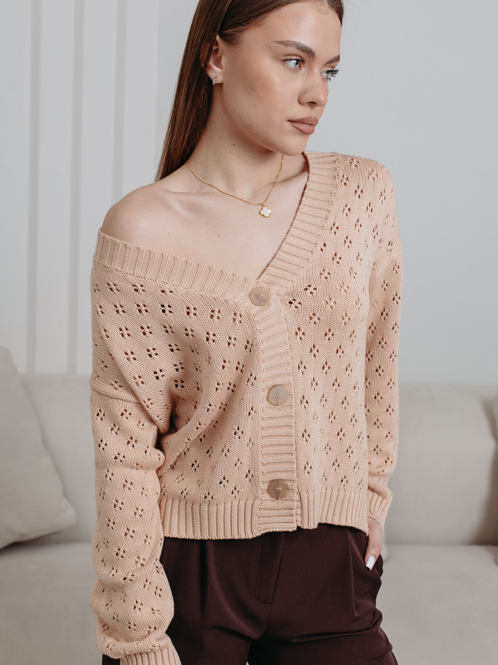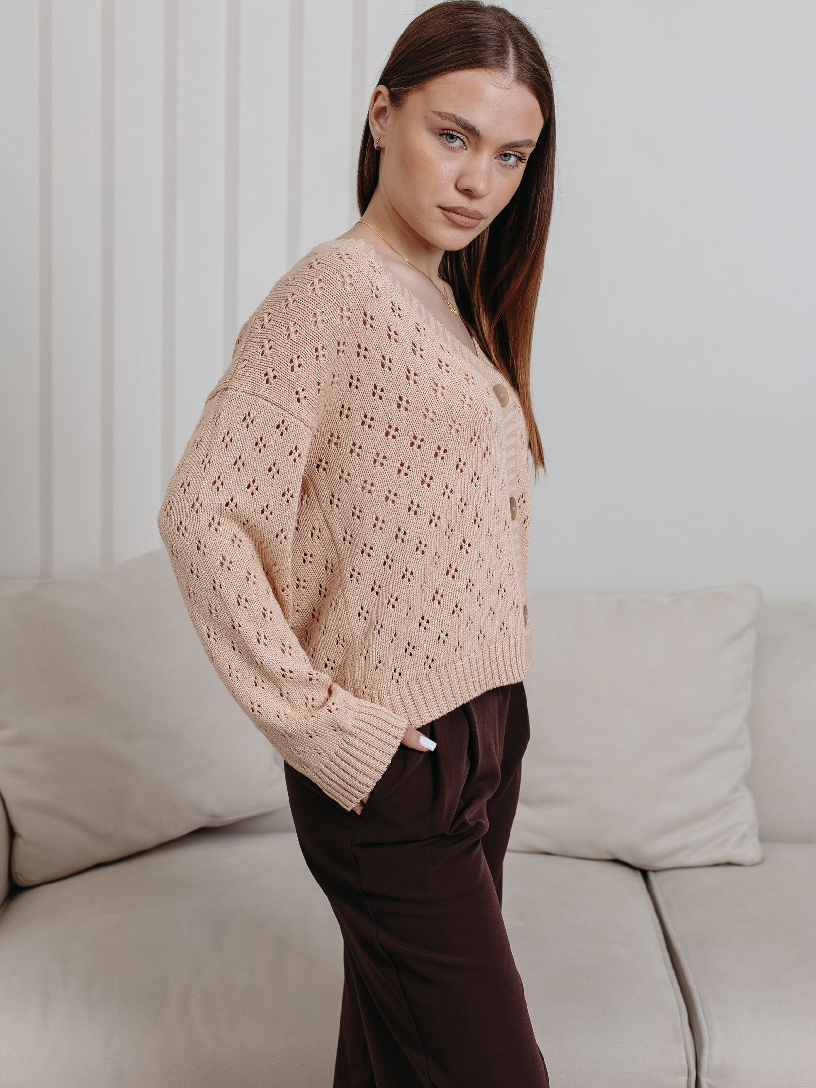 Укороченный женский кардиган свободного кроя в стиле оверсайз, с длинным рукавом испущенной линией плеча. V-образная горловина и край борта обработаны широкой резинкой, на которой выполнены петли, застегивающиеся на пуговицы. Ажурное переплетение придает модели легкости и романтизма. Низ изделия и низ рукава завершены резинкой.