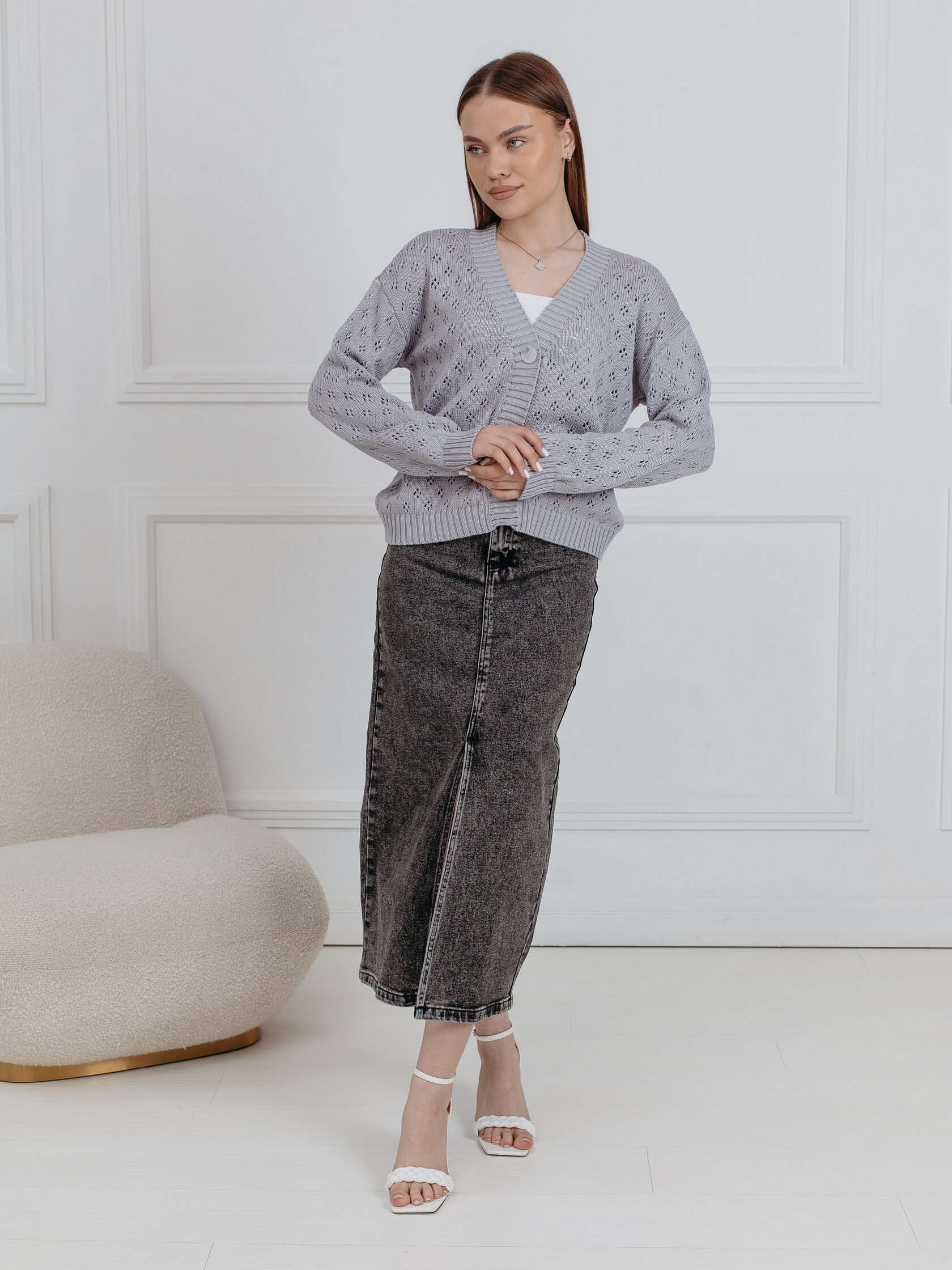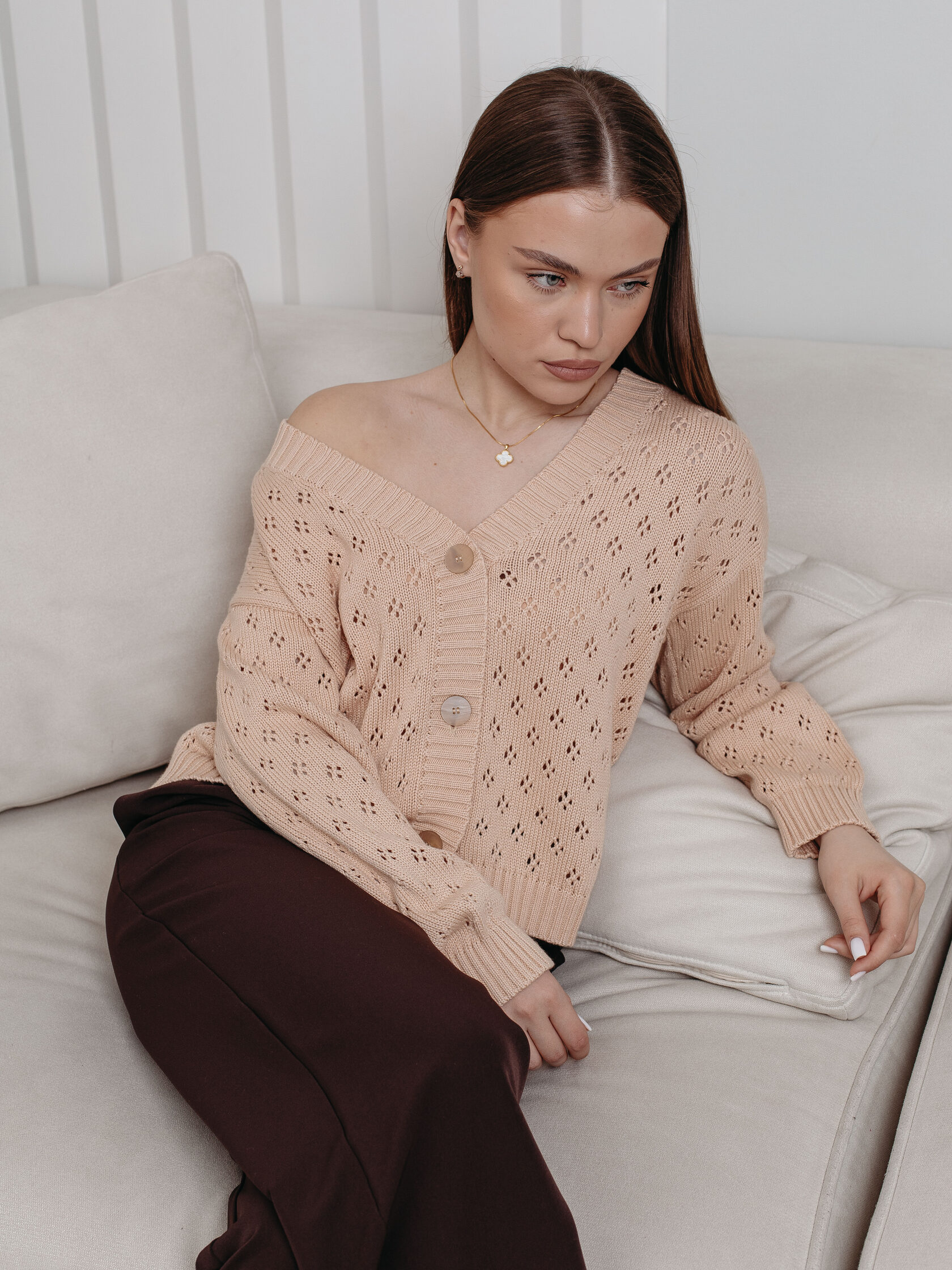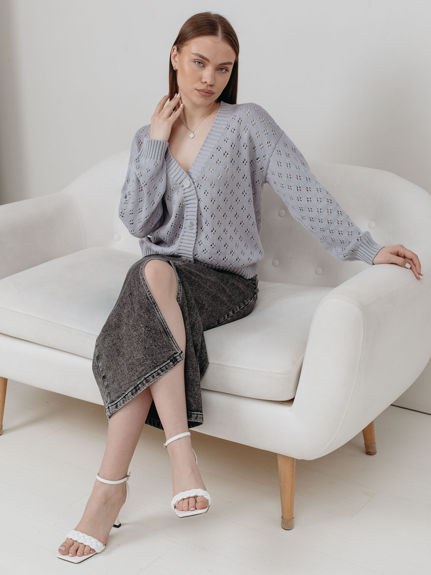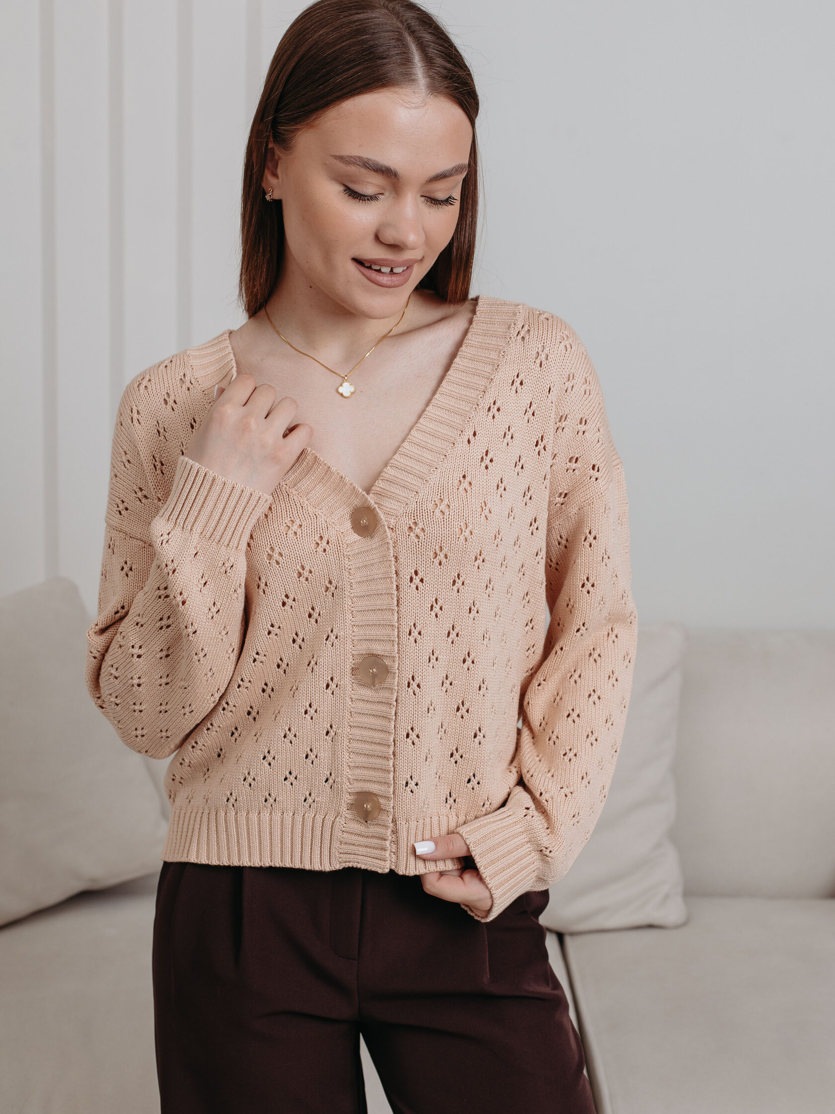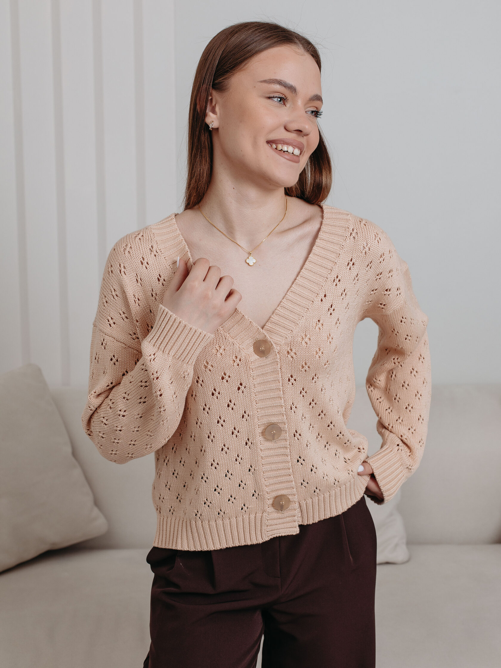 Укороченный женский кардиган свободного кроя в стиле оверсайз, с длинным рукавом испущенной линией плеча. V-образная горловина и край борта обработаны широкой резинкой, на которой выполнены петли, застегивающиеся на пуговицы. Ажурное переплетение придает модели легкости и романтизма. Низ изделия и низ рукава завершены резинкой.