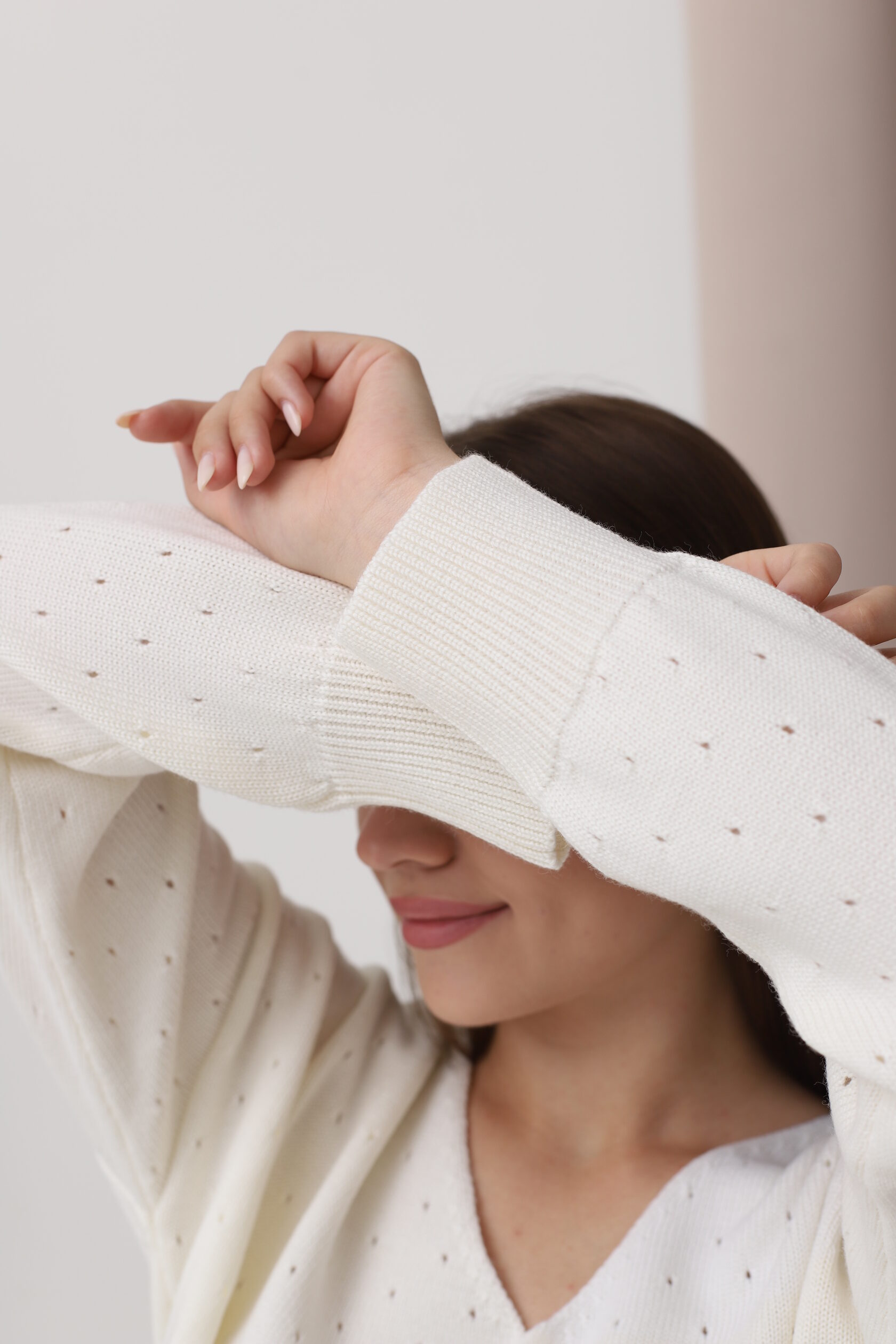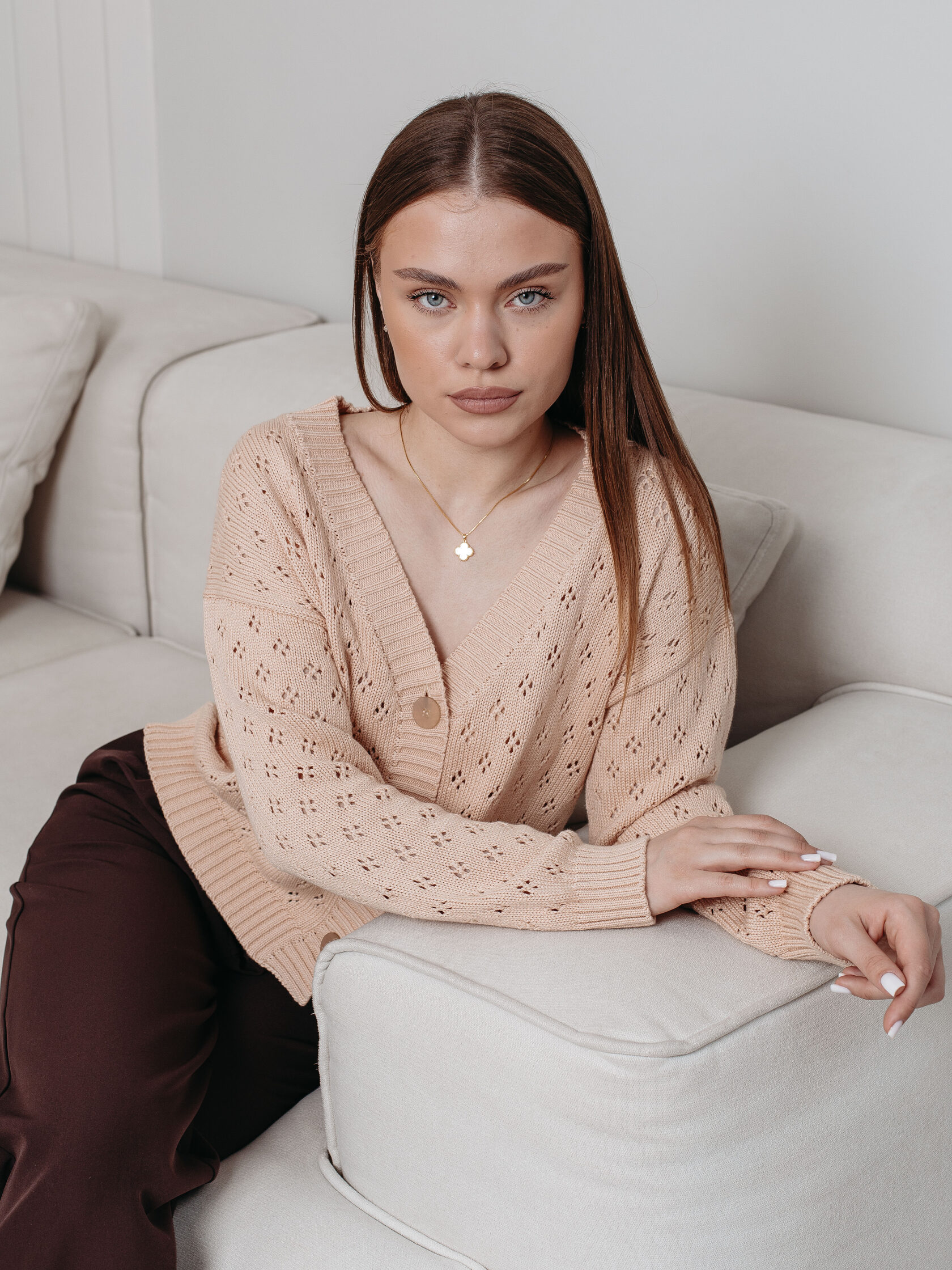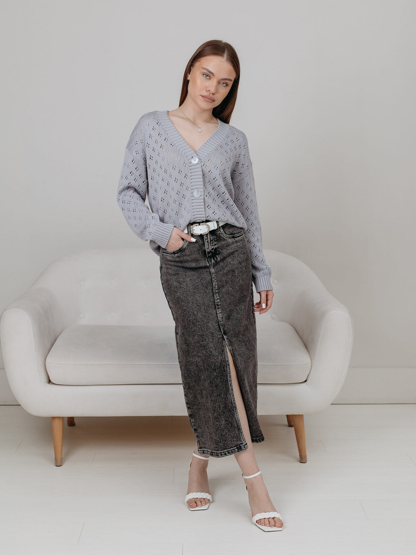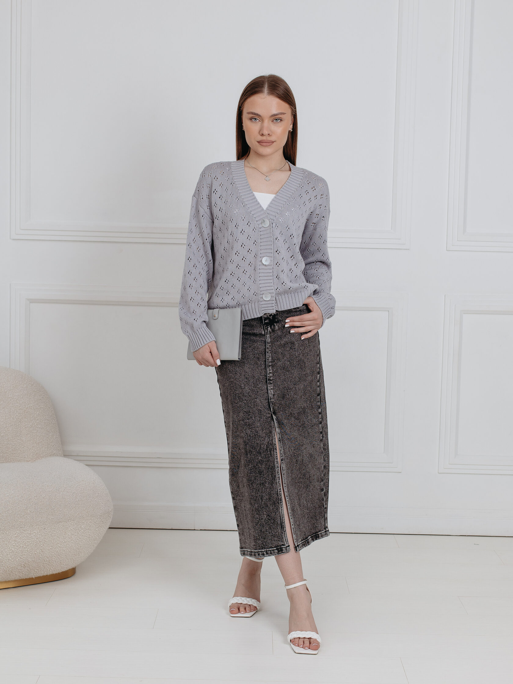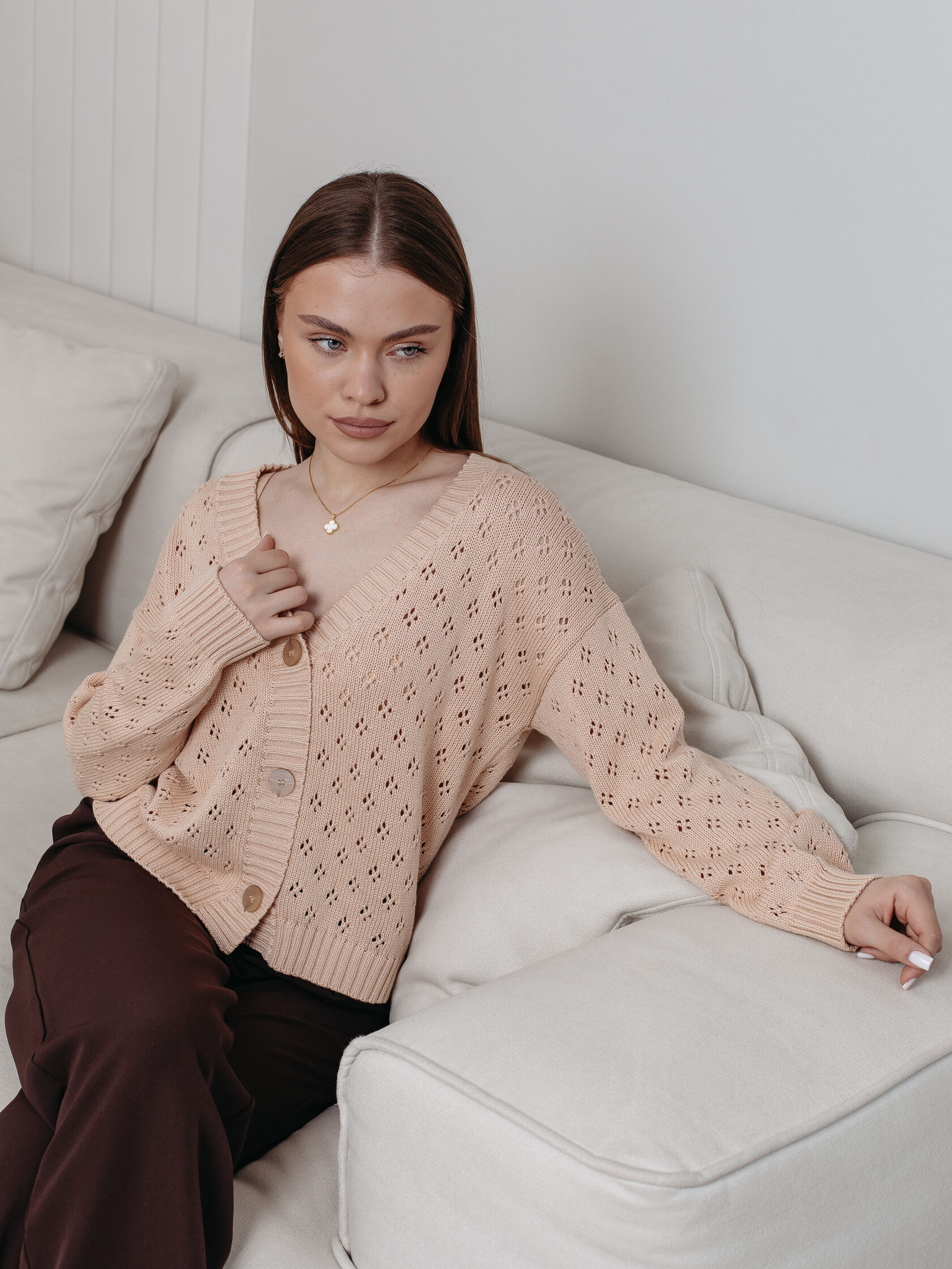Укороченный женский кардиган свободного кроя в стиле оверсайз, с длинным рукавом испущенной линией плеча. V-образная горловина и край борта обработаны широкой резинкой, на которой выполнены петли, застегивающиеся на пуговицы. Ажурное переплетение придает модели легкости и романтизма. Низ изделия и низ рукава завершены резинкой.