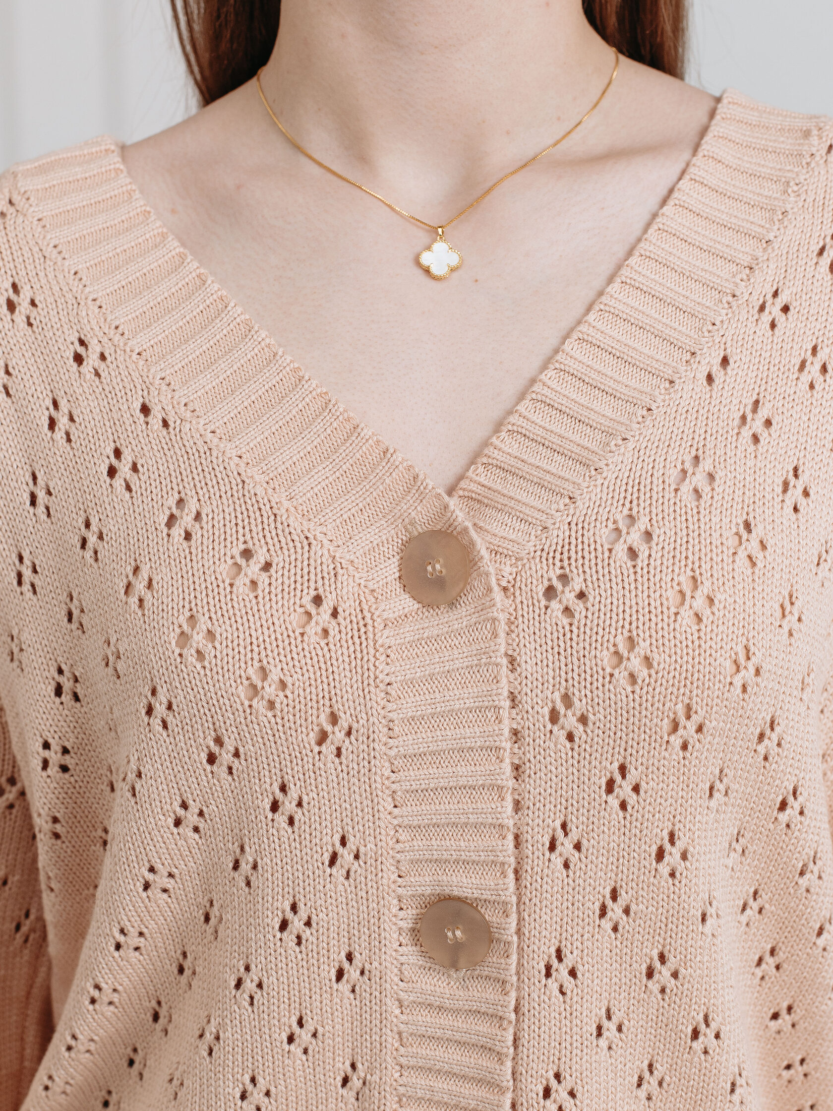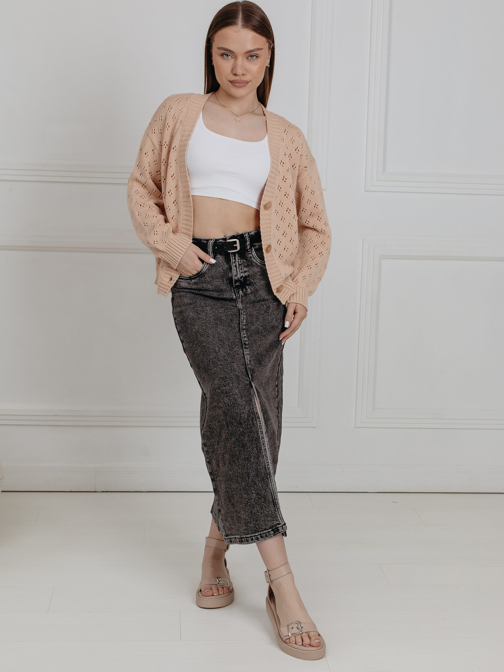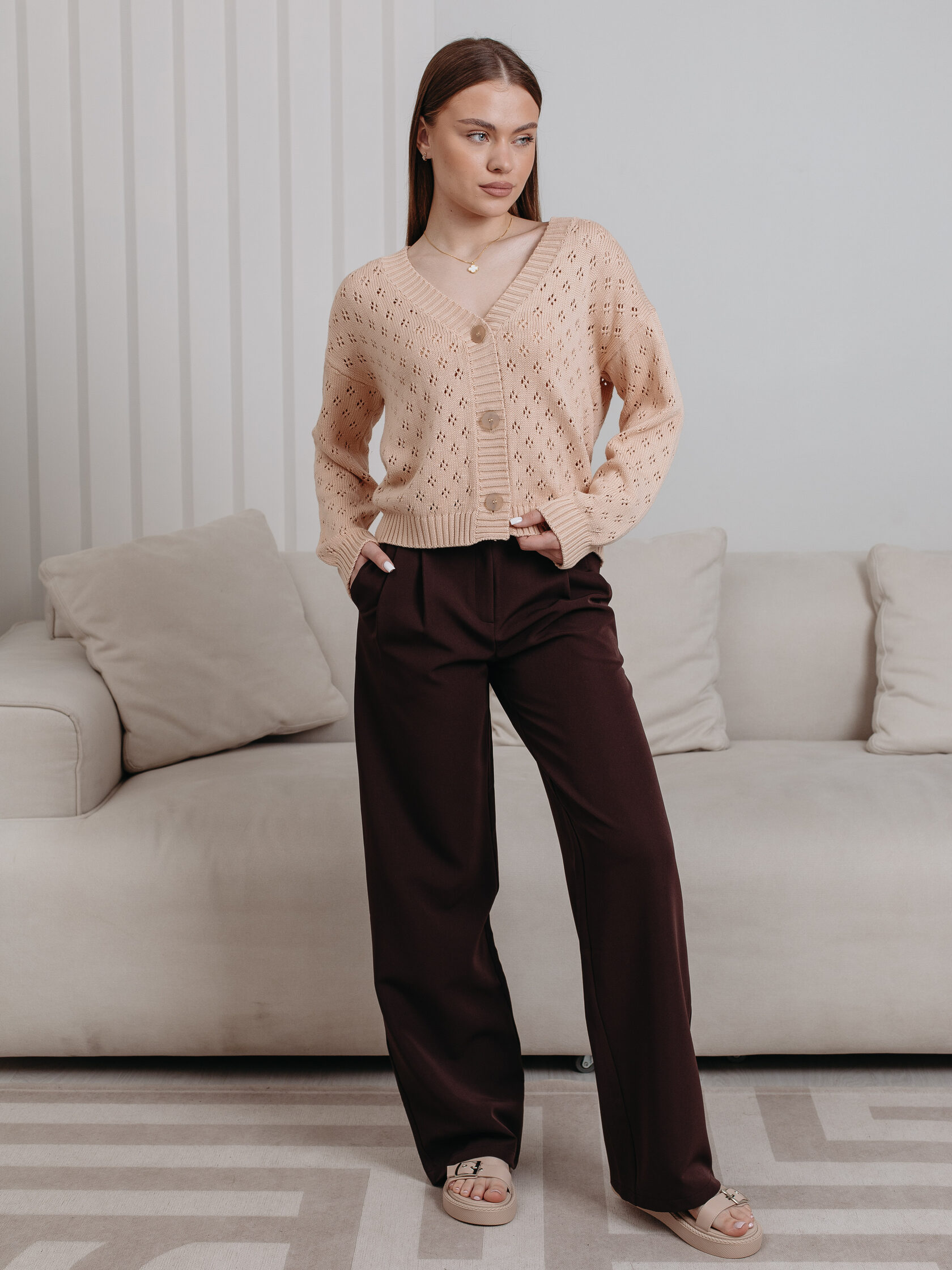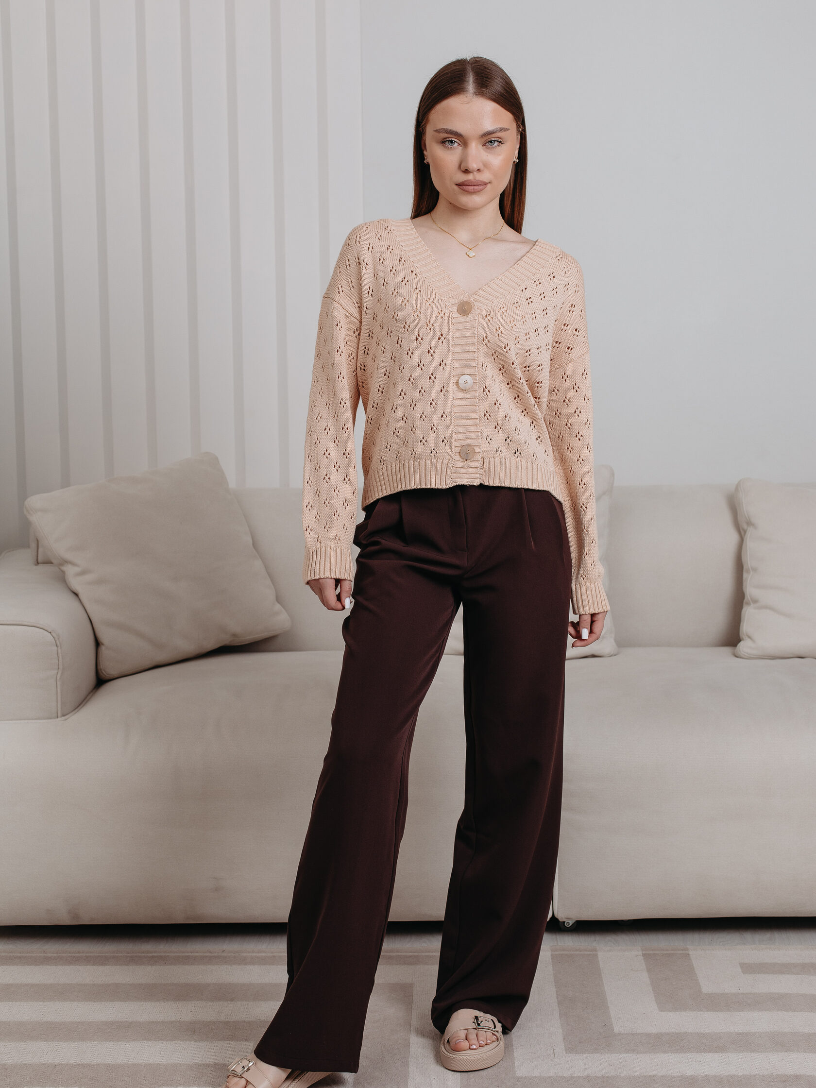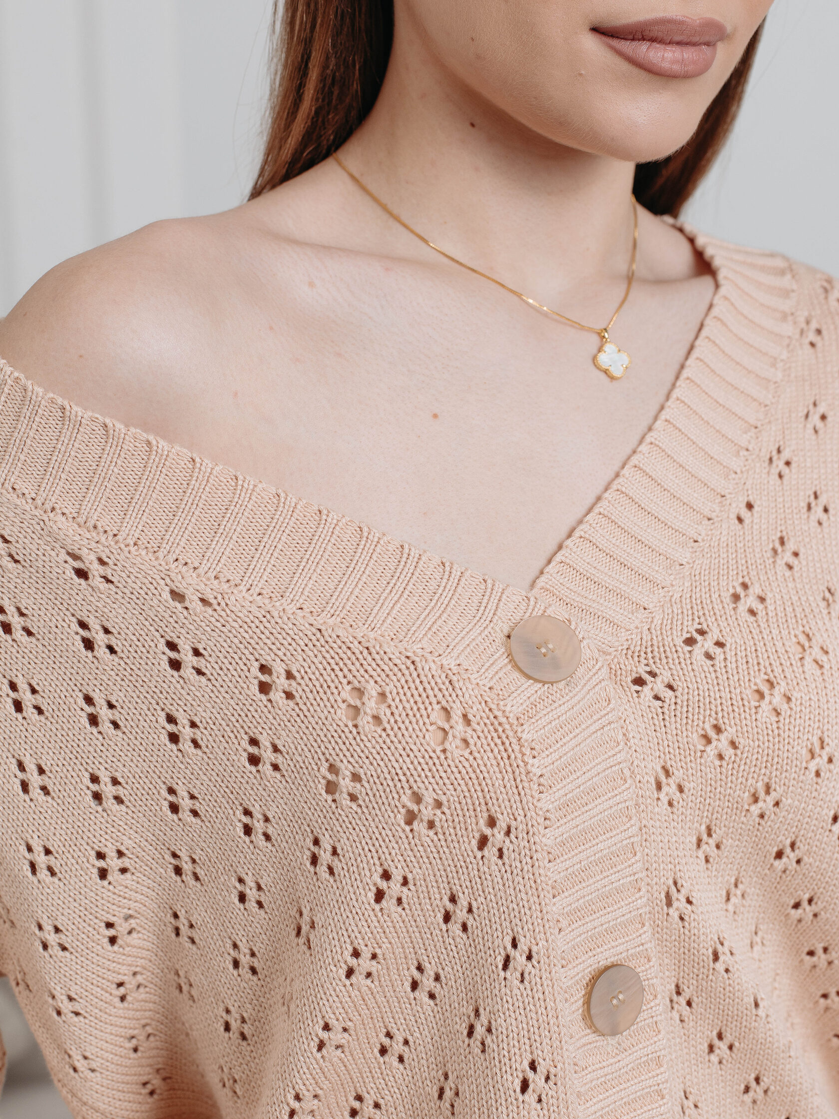Укороченный женский кардиган свободного кроя в стиле оверсайз, с длинным рукавом испущенной линией плеча. V-образная горловина и край борта обработаны широкой резинкой, на которой выполнены петли, застегивающиеся на пуговицы. Ажурное переплетение придает модели легкости и романтизма. Низ изделия и низ рукава завершены резинкой.