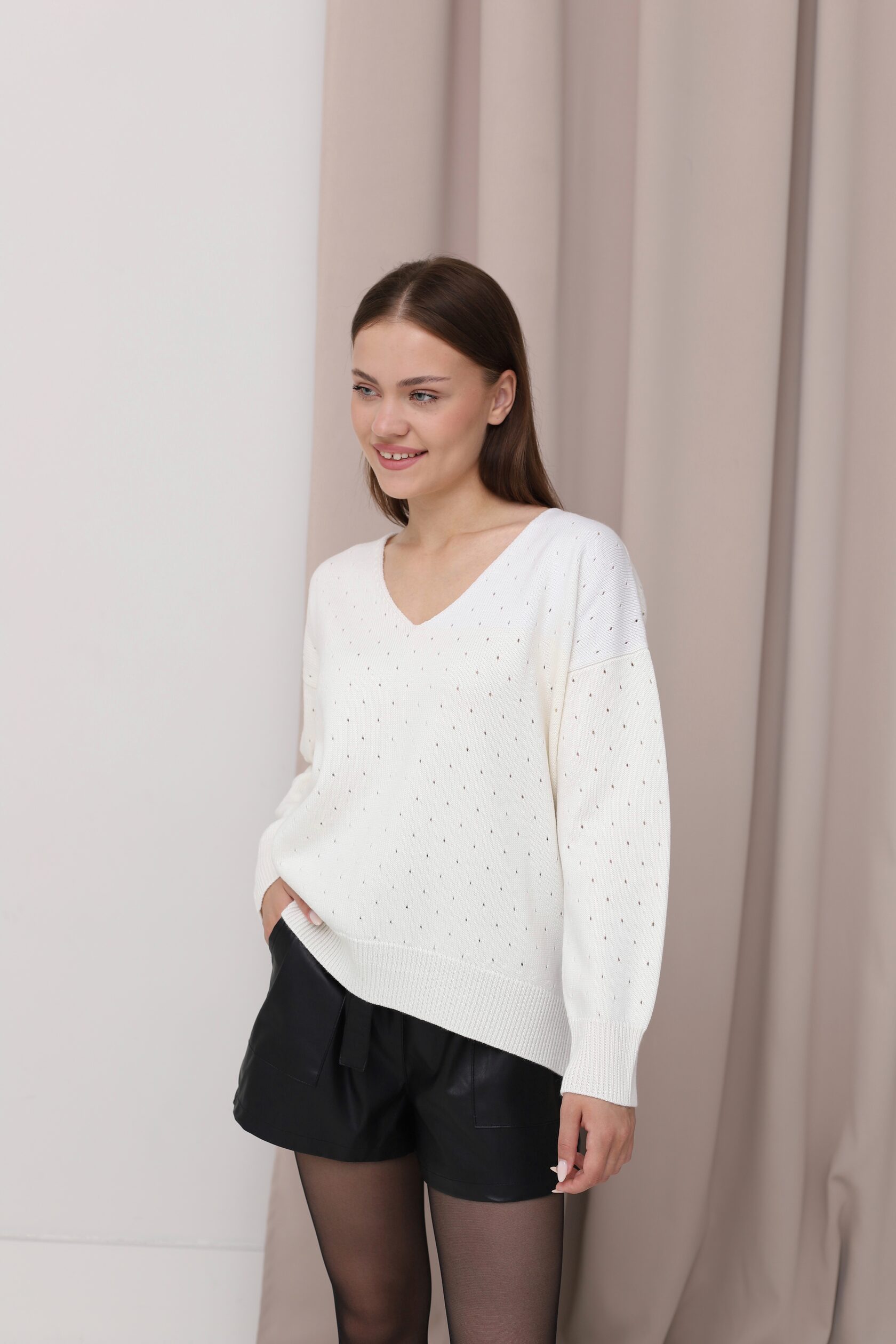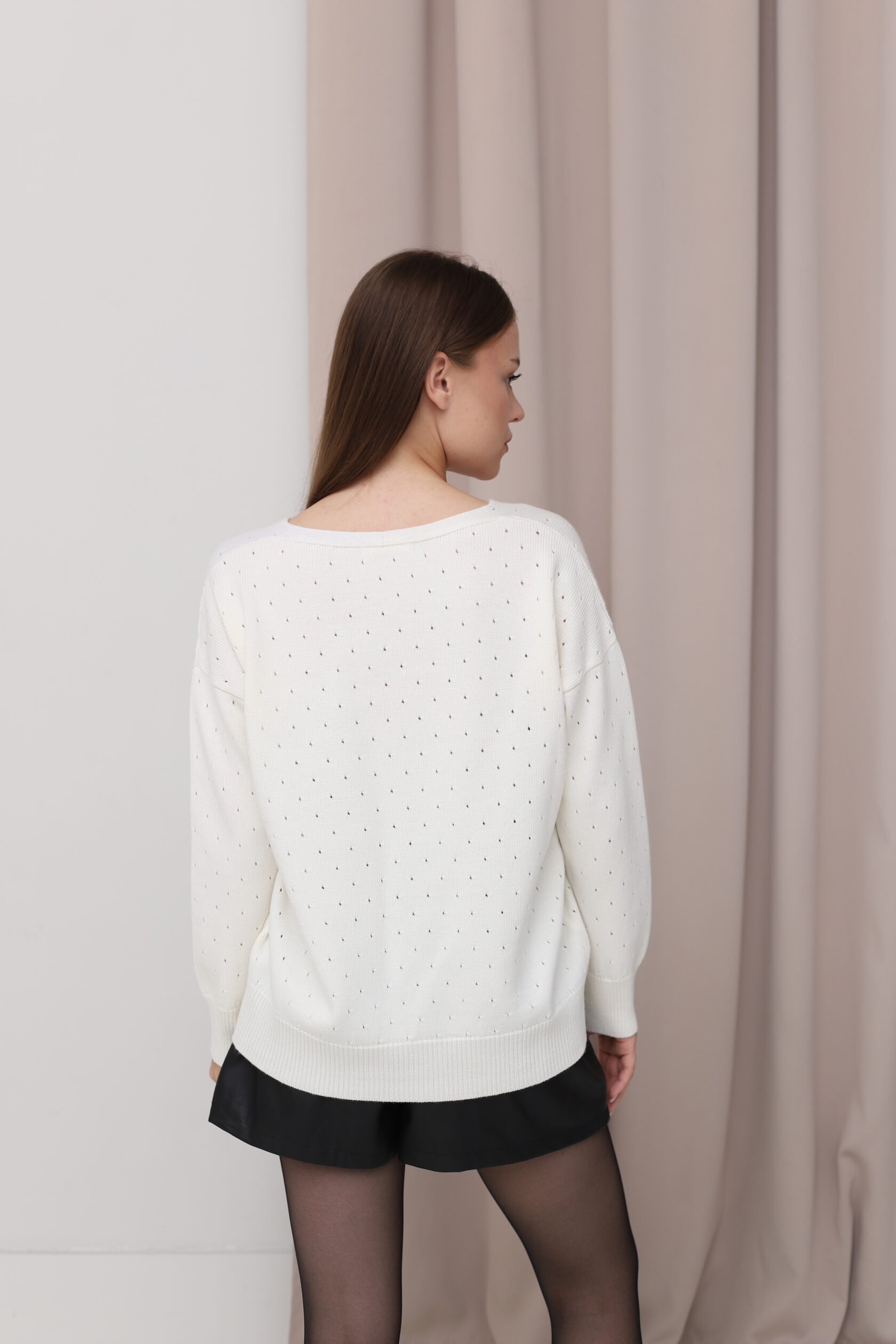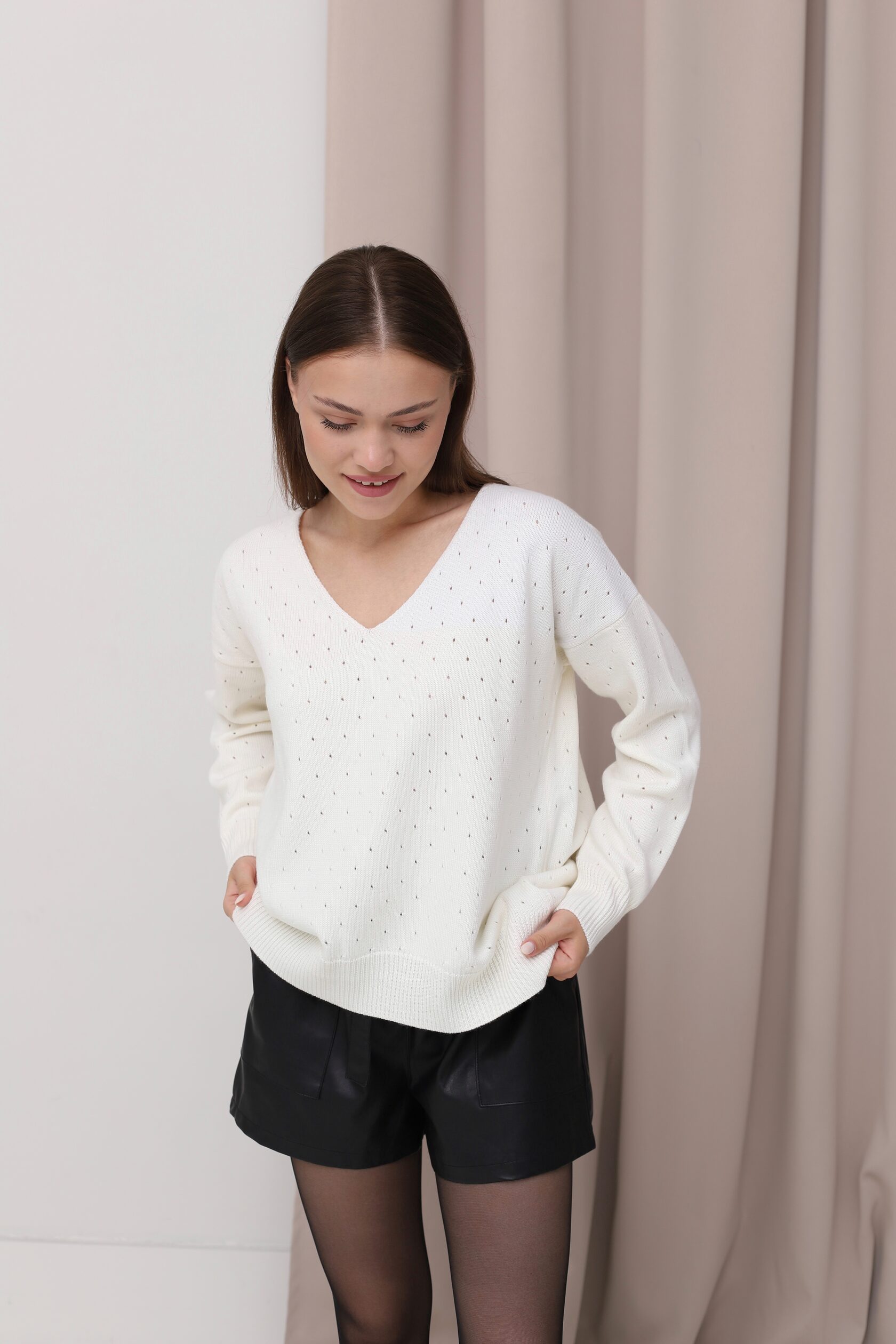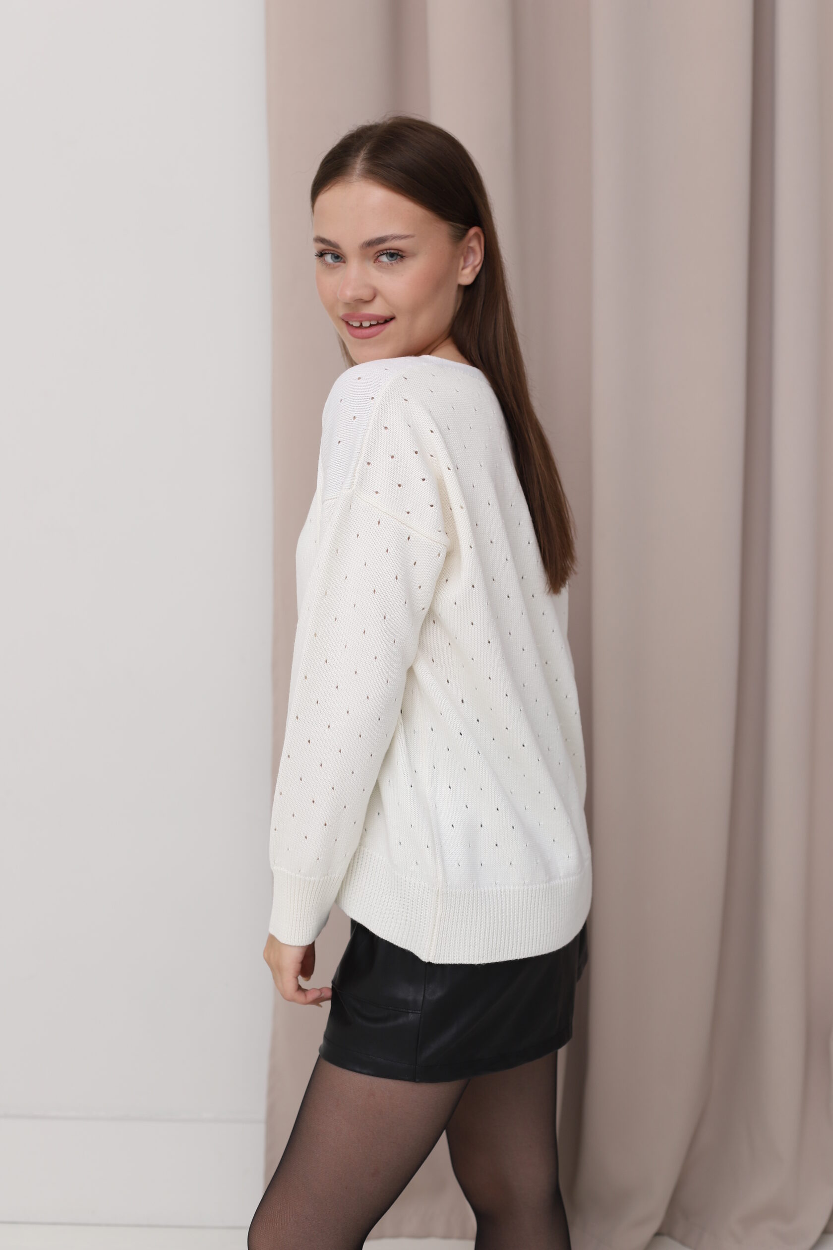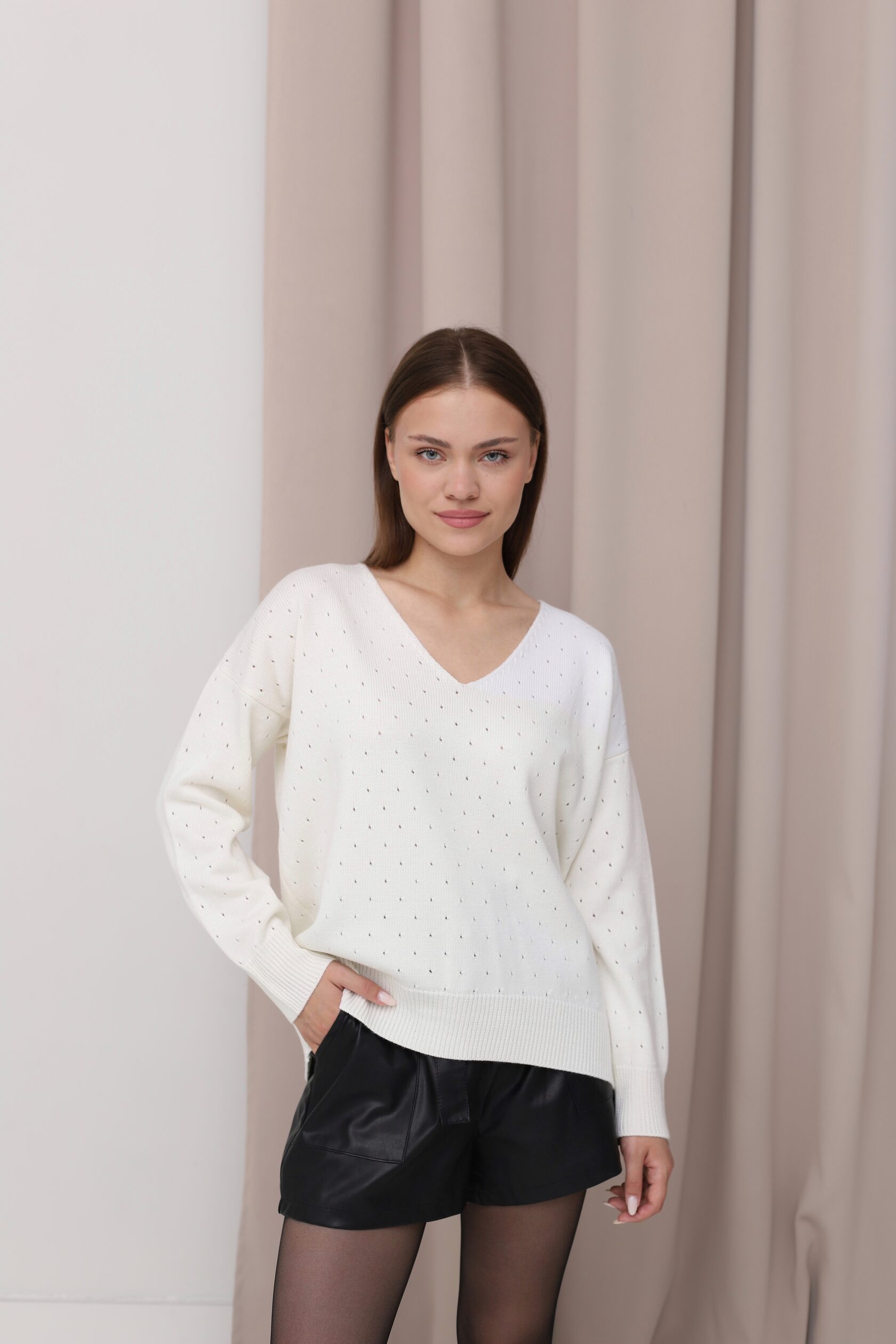 Джемпер женский ажурный свободного силуэта средней длины, выполнен в романтическом стиле. Модель с V-образной горловиной, с длинным рукавом и спущенной линией плеча. Нижний край переда чуть скруглен и завышен относительно спинки. Низ изделия и низ рукава оформлены резинкой.