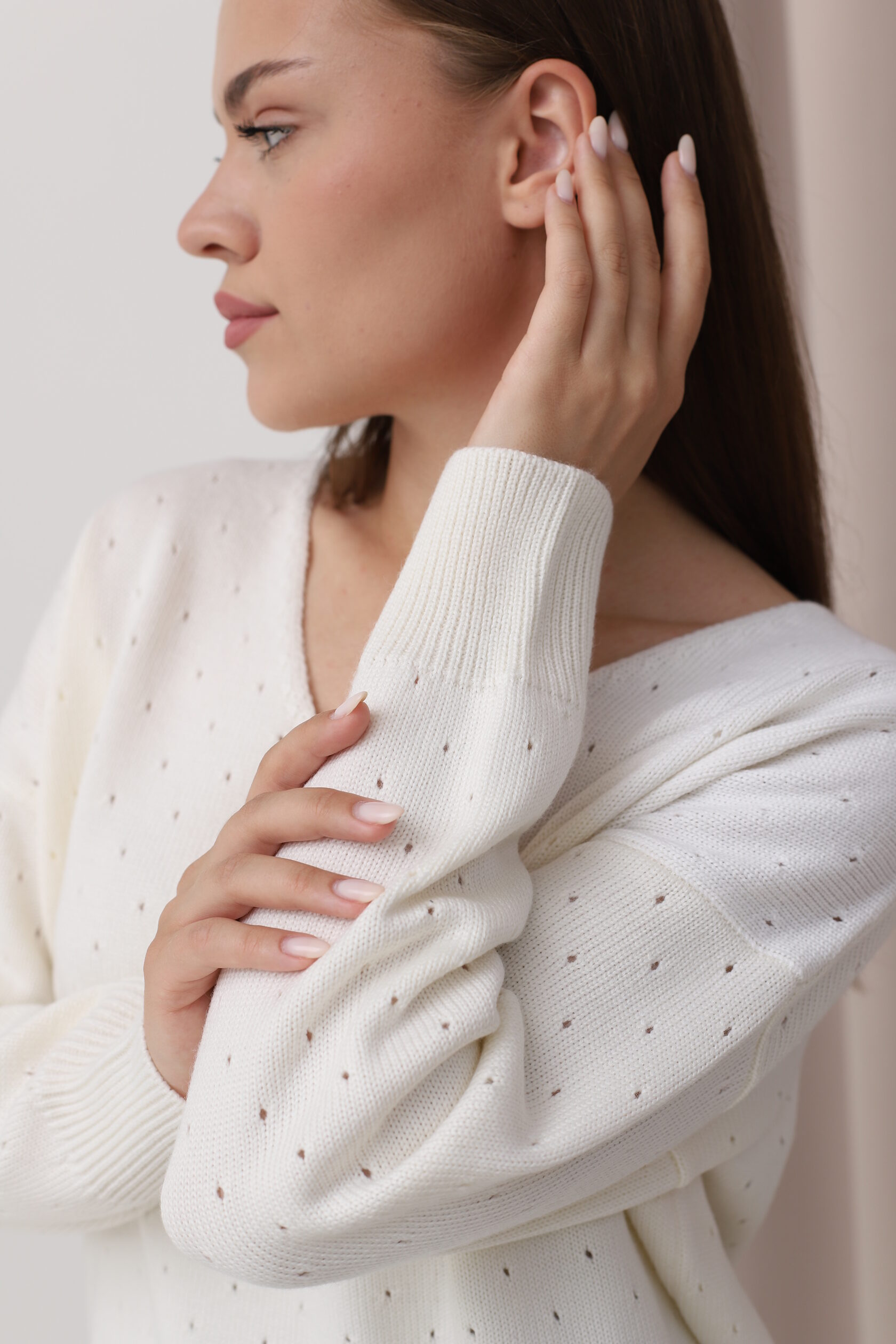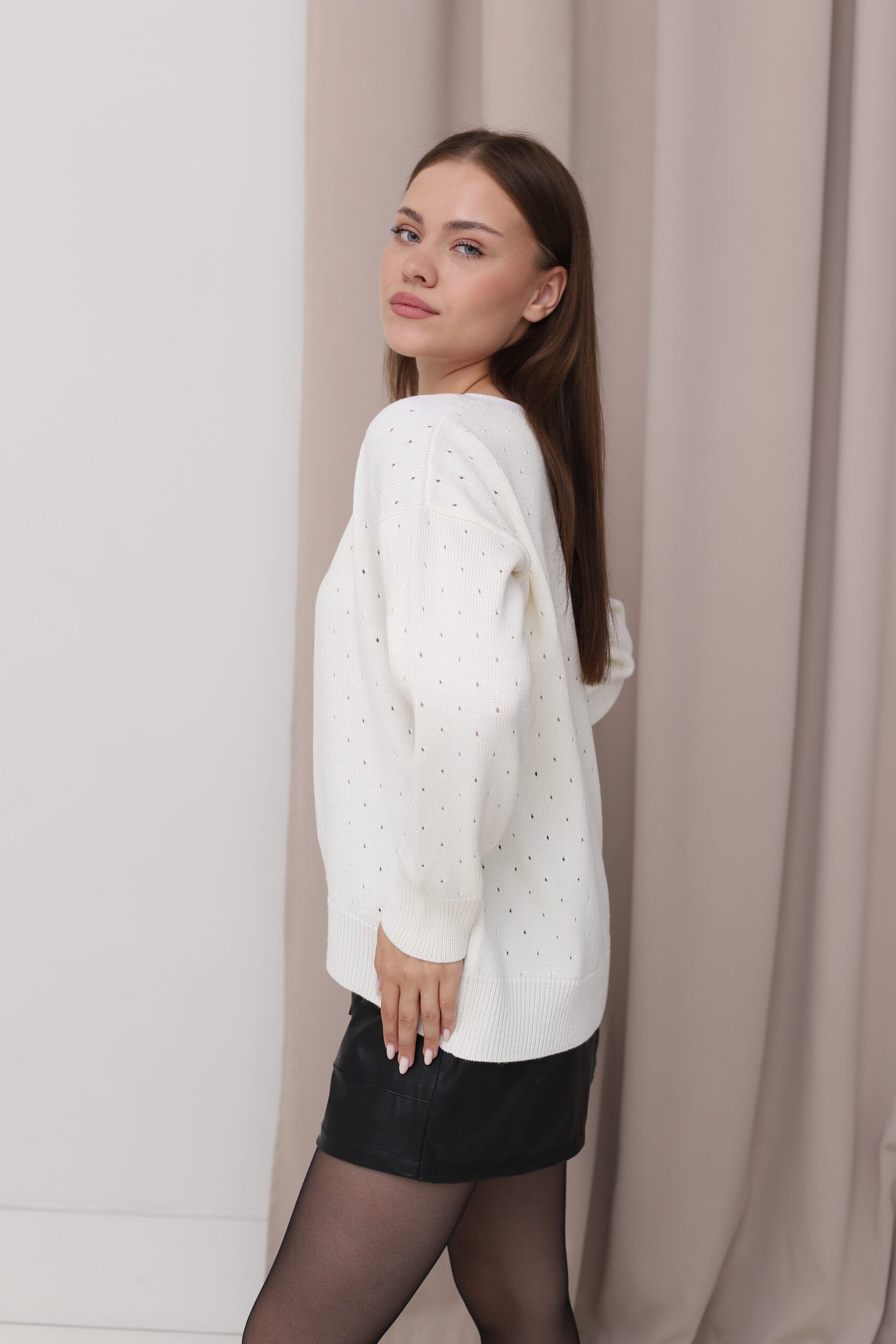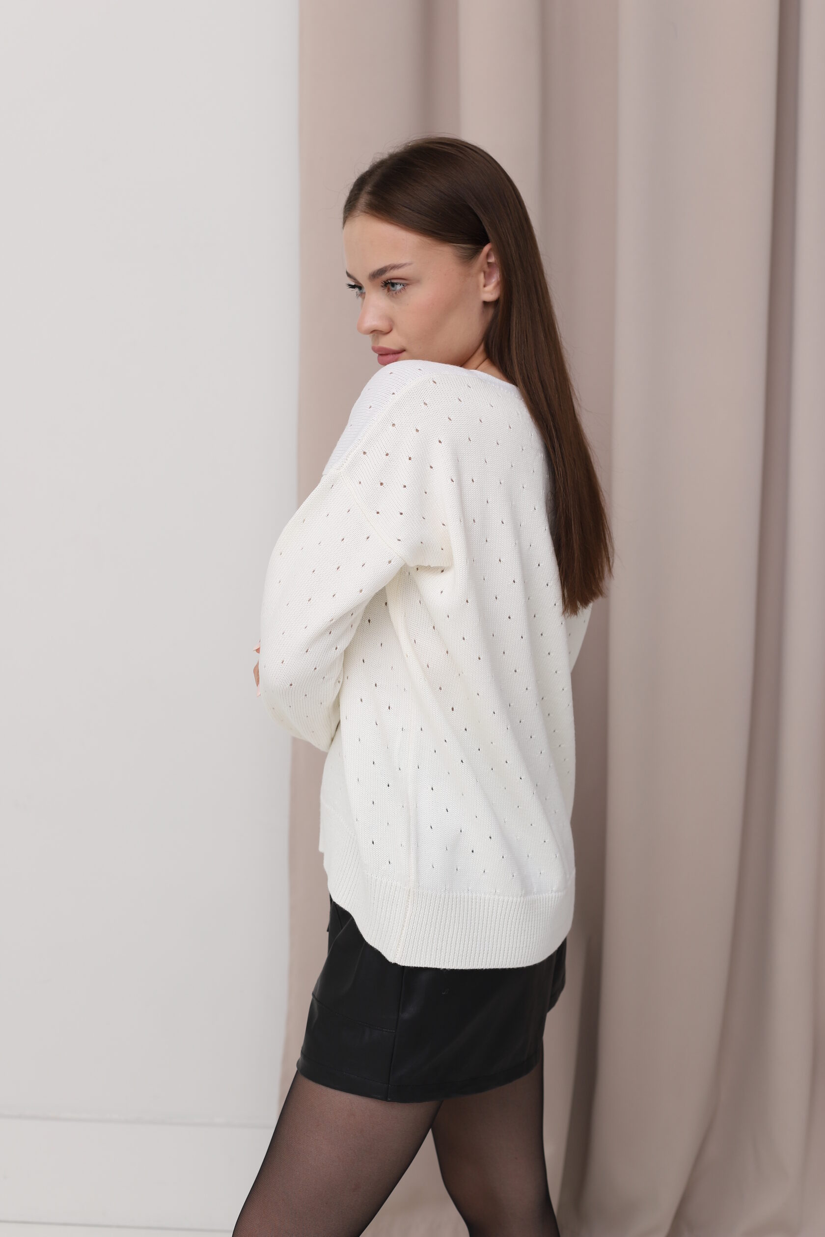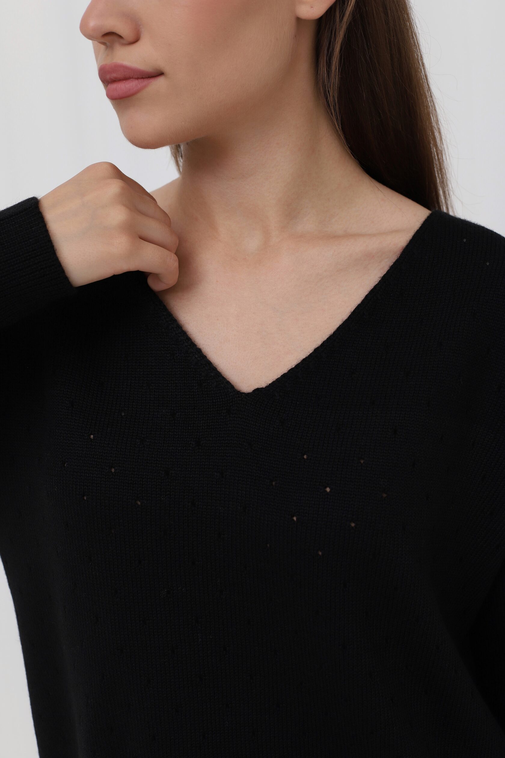 Джемпер женский ажурный свободного силуэта средней длины, выполнен в романтическом стиле. Модель с V-образной горловиной, с длинным рукавом и спущенной линией плеча. Нижний край переда чуть скруглен и завышен относительно спинки. Низ изделия и низ рукава оформлены резинкой.