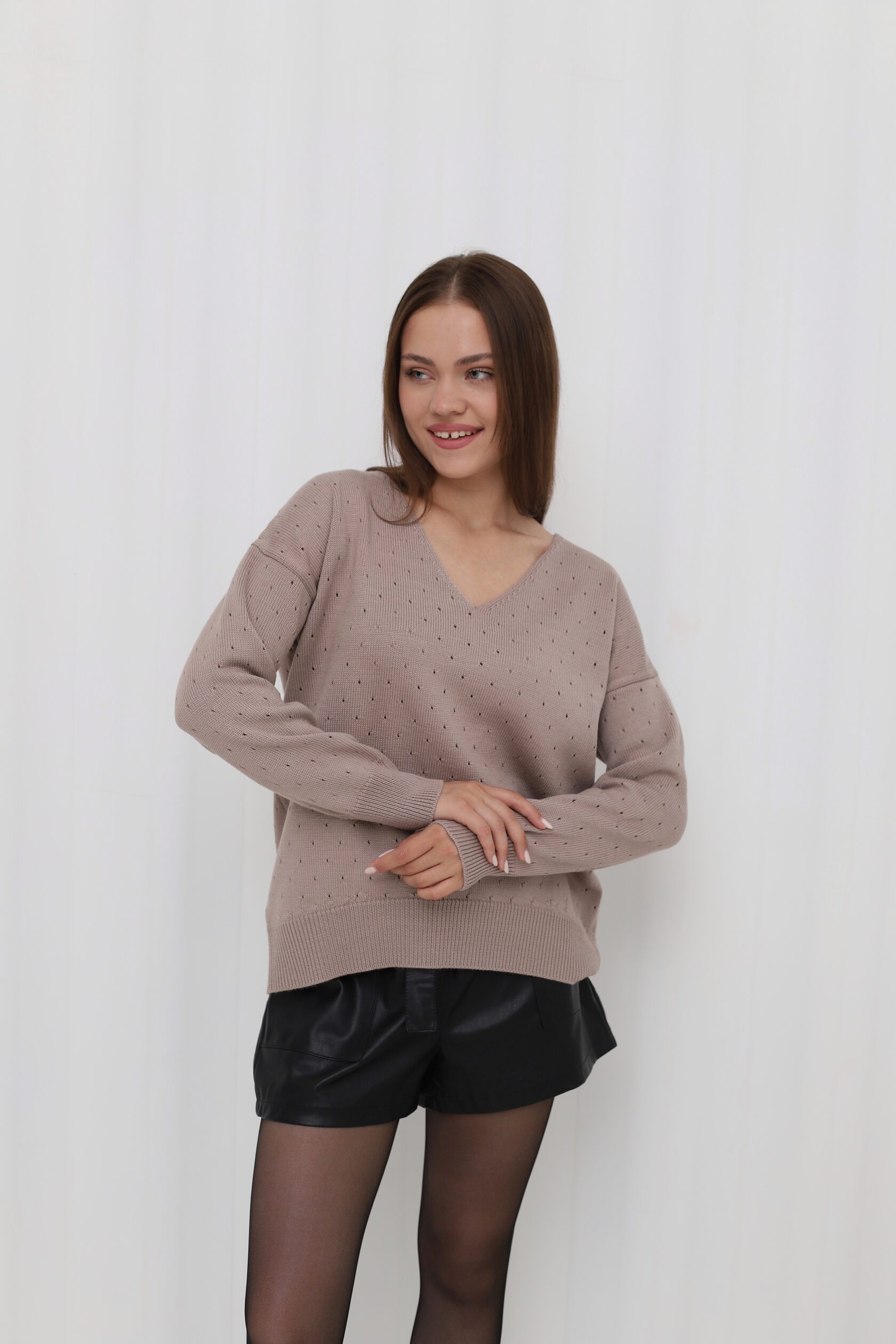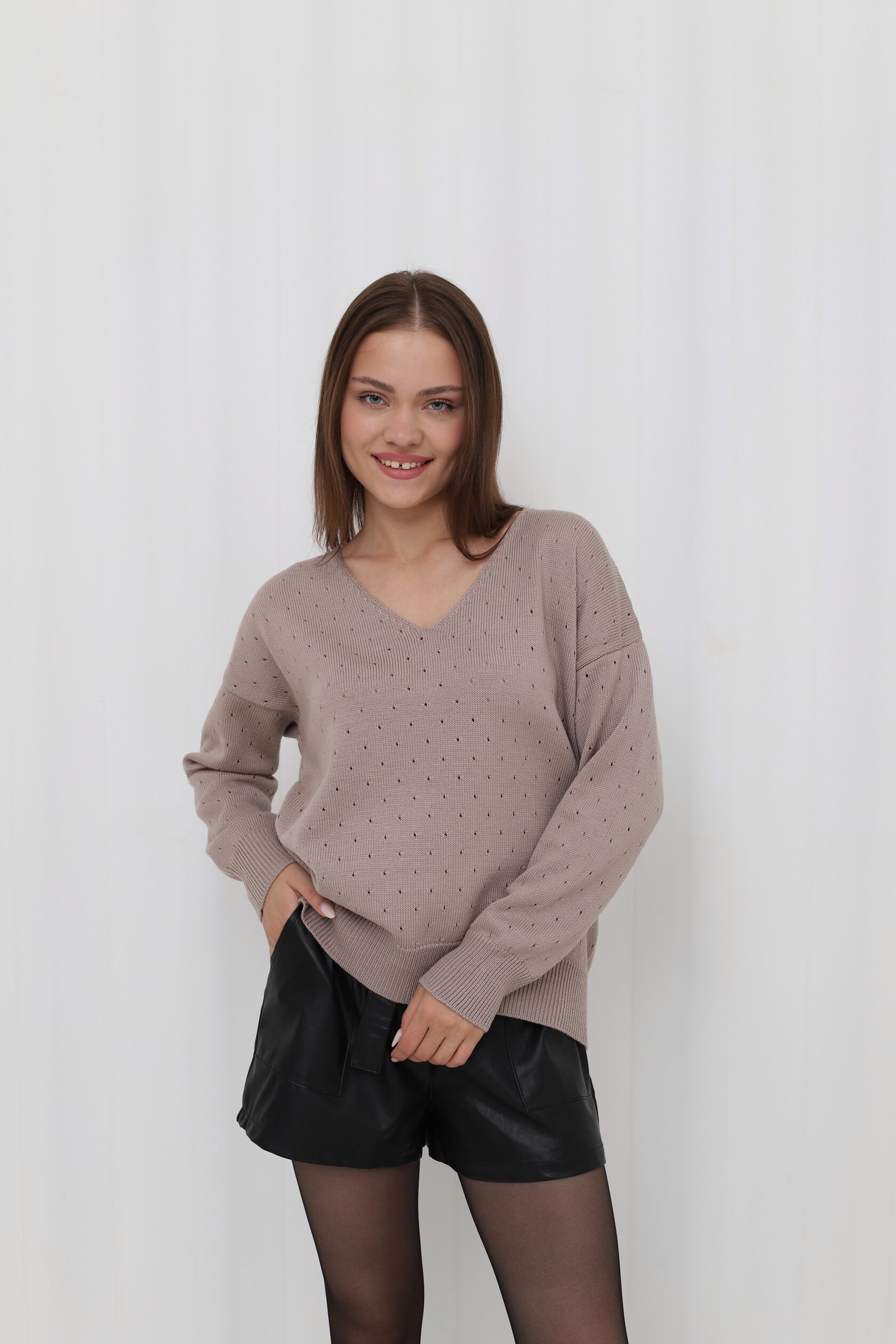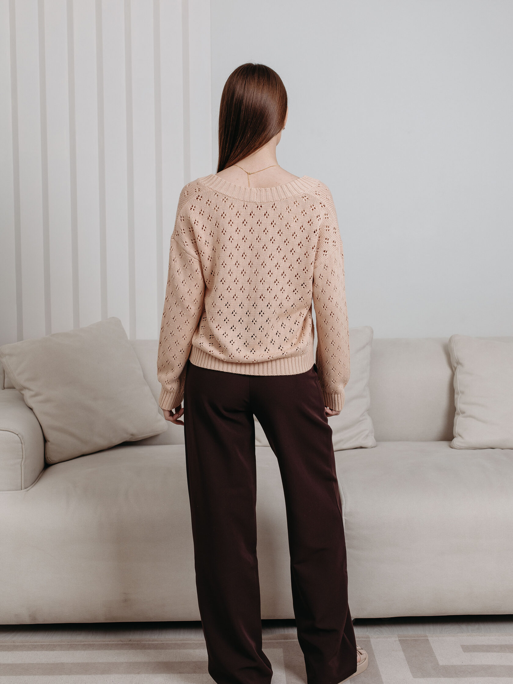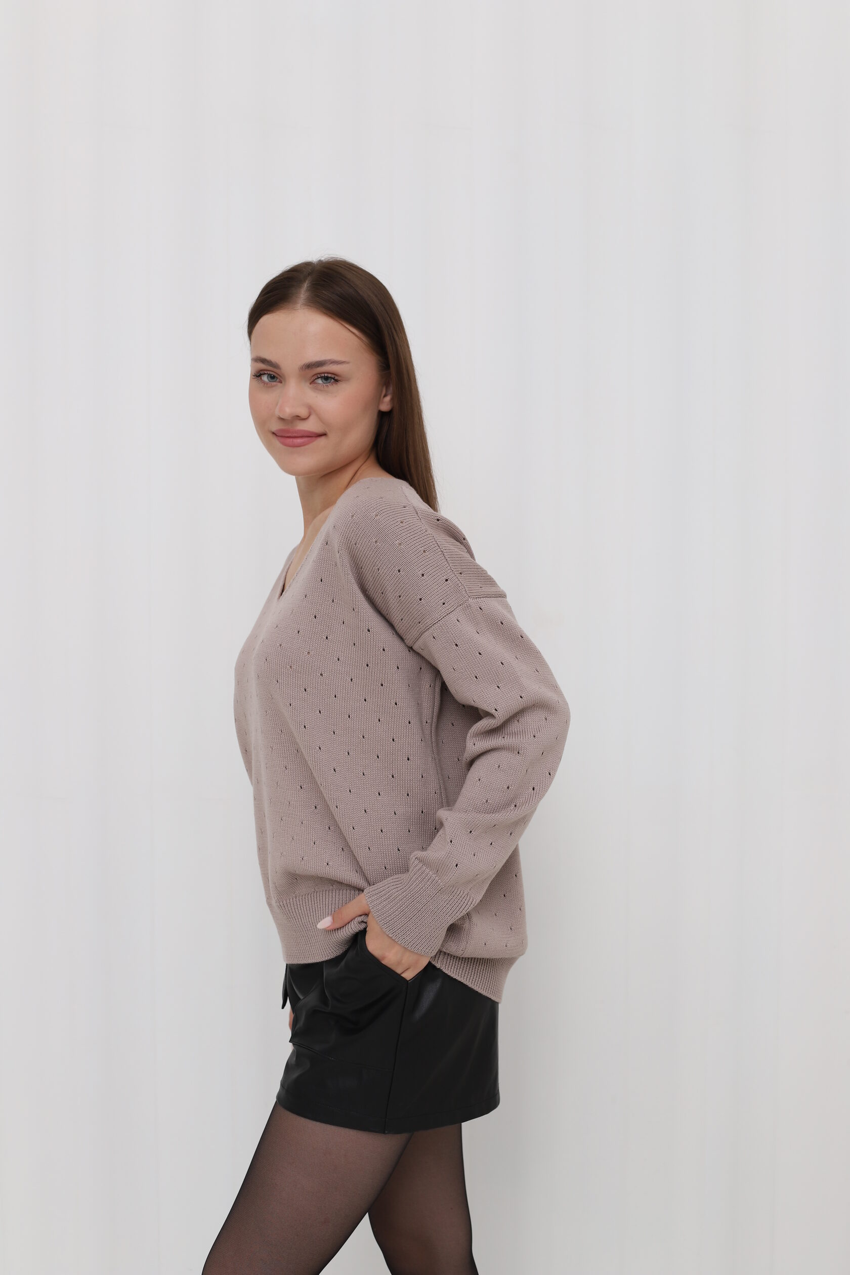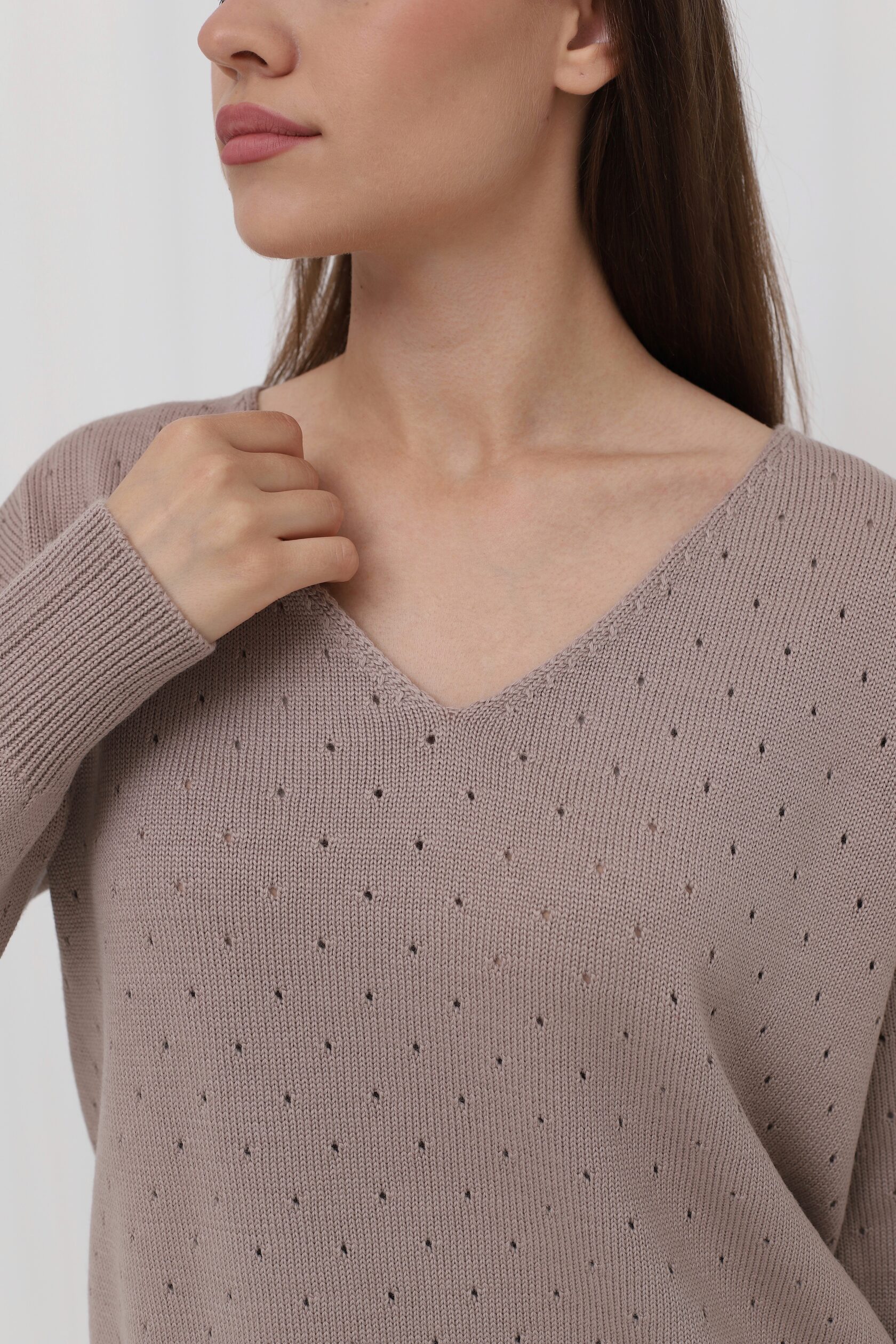 Джемпер женский ажурный свободного силуэта средней длины, выполнен в романтическом стиле. Модель с V-образной горловиной, с длинным рукавом и спущенной линией плеча. Нижний край переда чуть скруглен и завышен относительно спинки. Низ изделия и низ рукава оформлены резинкой.