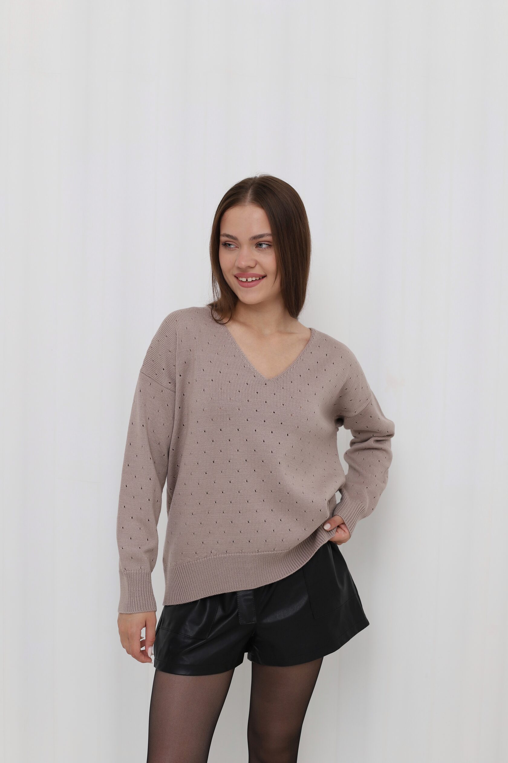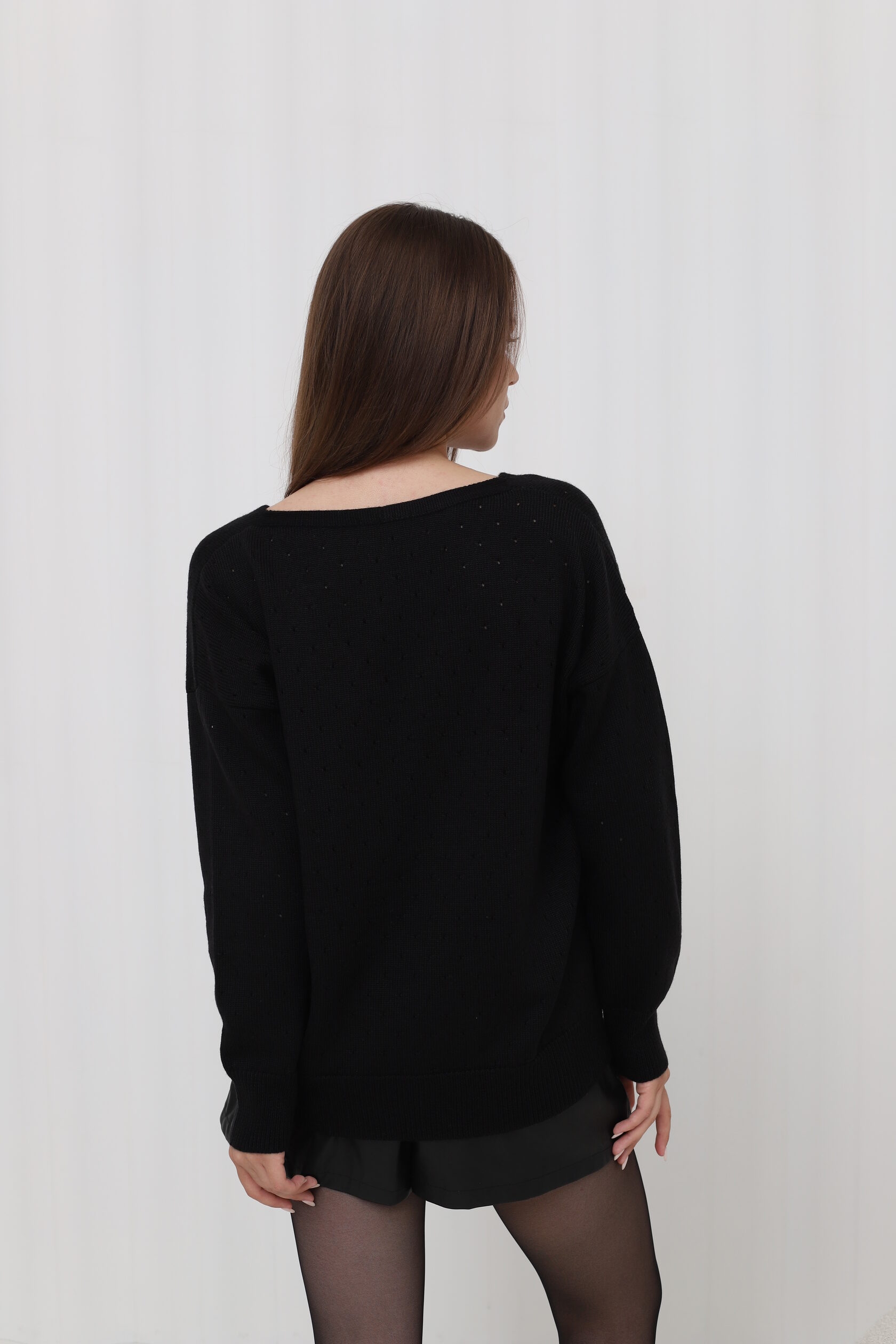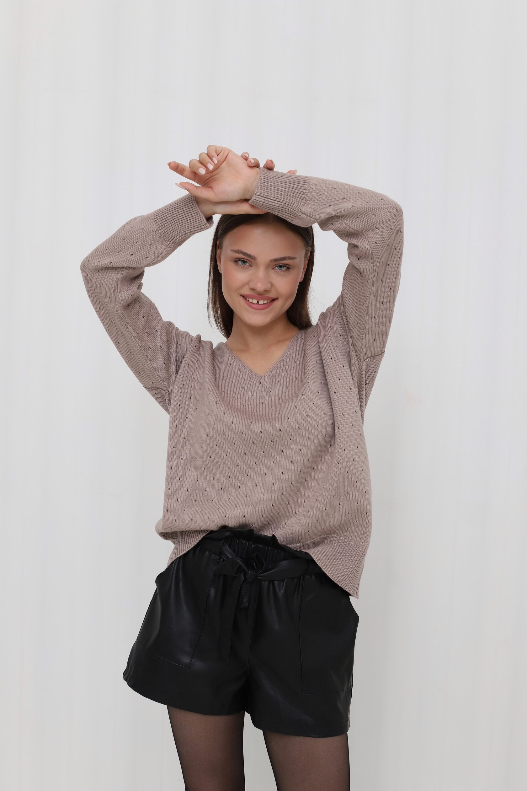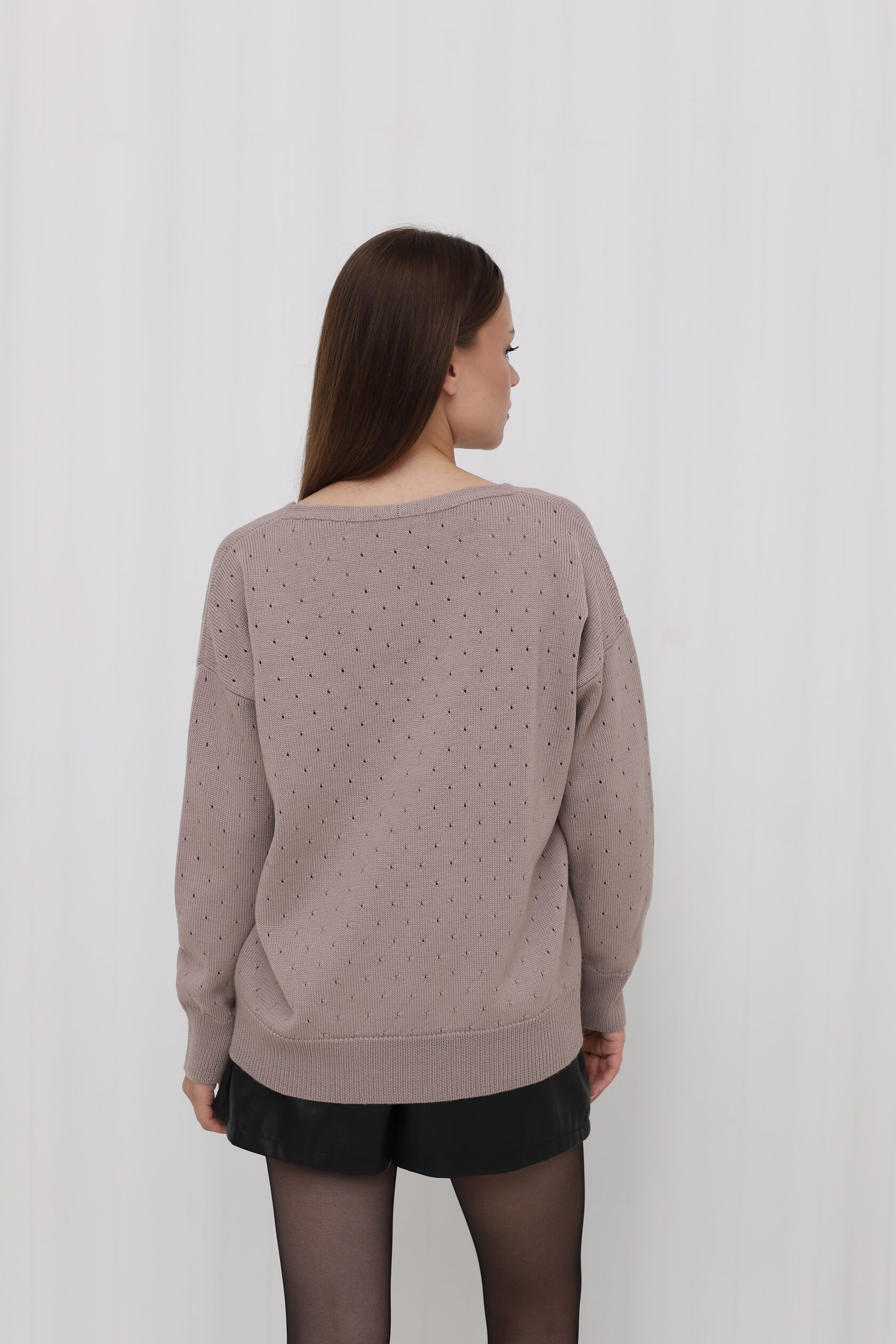 Джемпер женский ажурный свободного силуэта средней длины, выполнен в романтическом стиле. Модель с V-образной горловиной, с длинным рукавом и спущенной линией плеча. Нижний край переда чуть скруглен и завышен относительно спинки. Низ изделия и низ рукава оформлены резинкой.