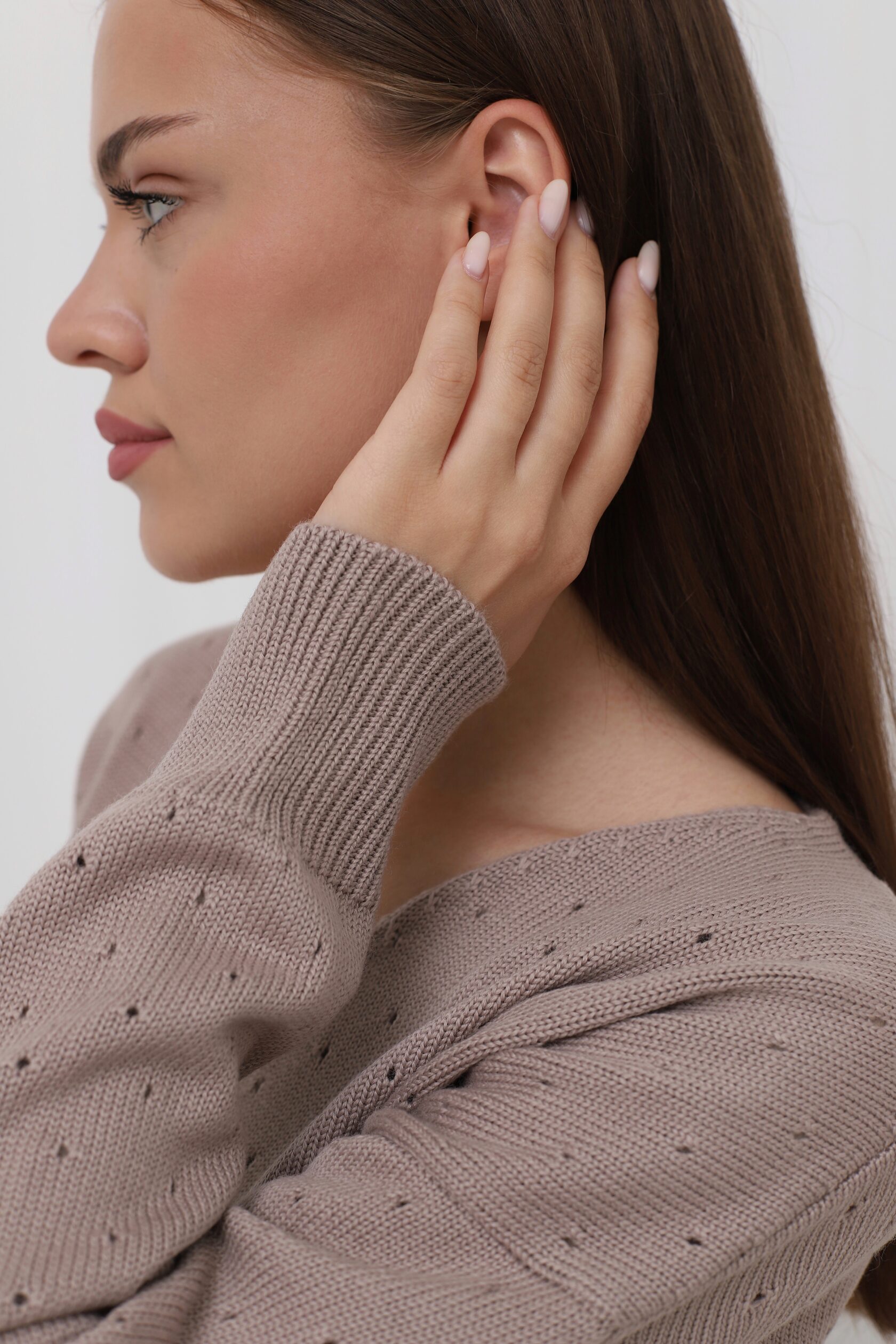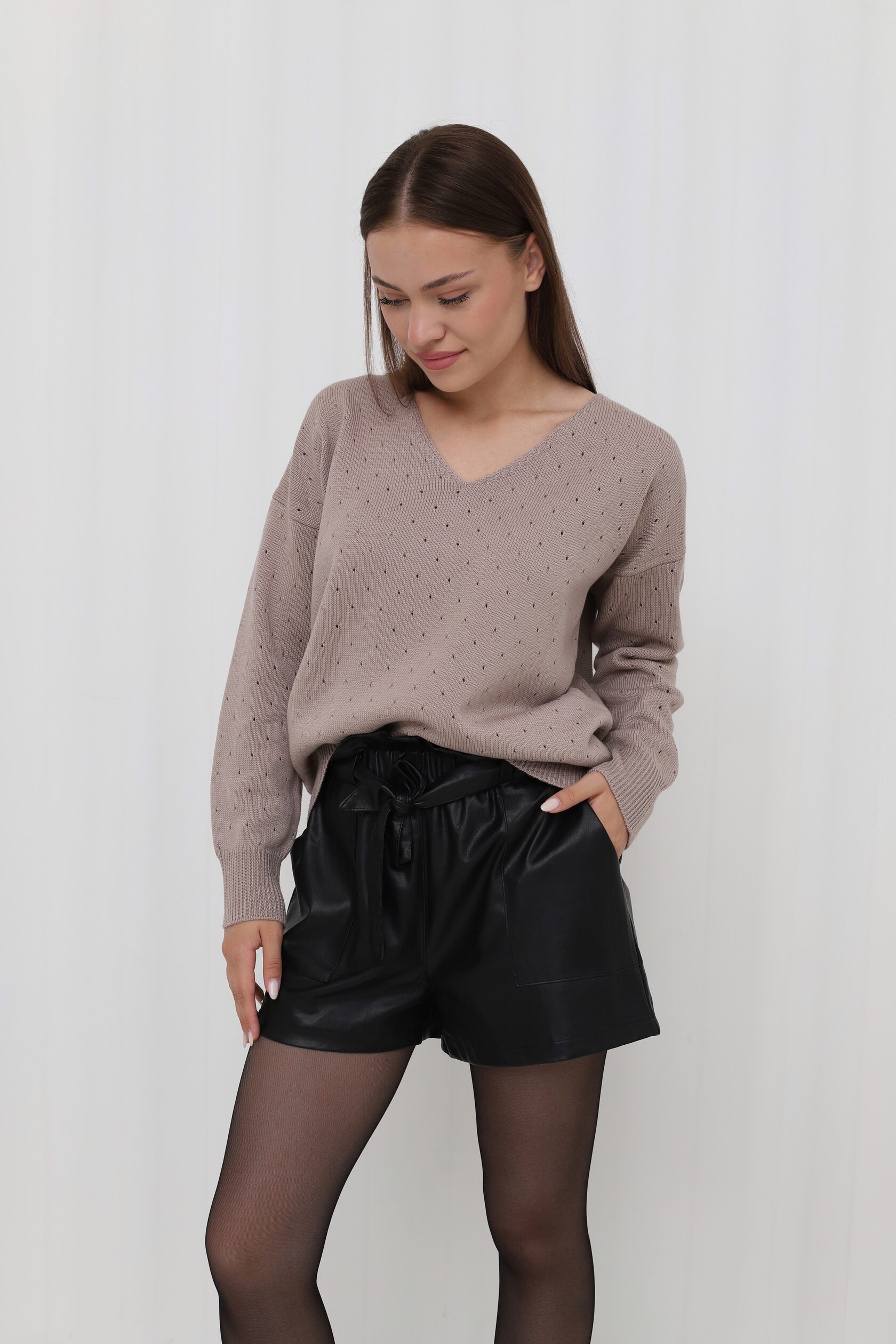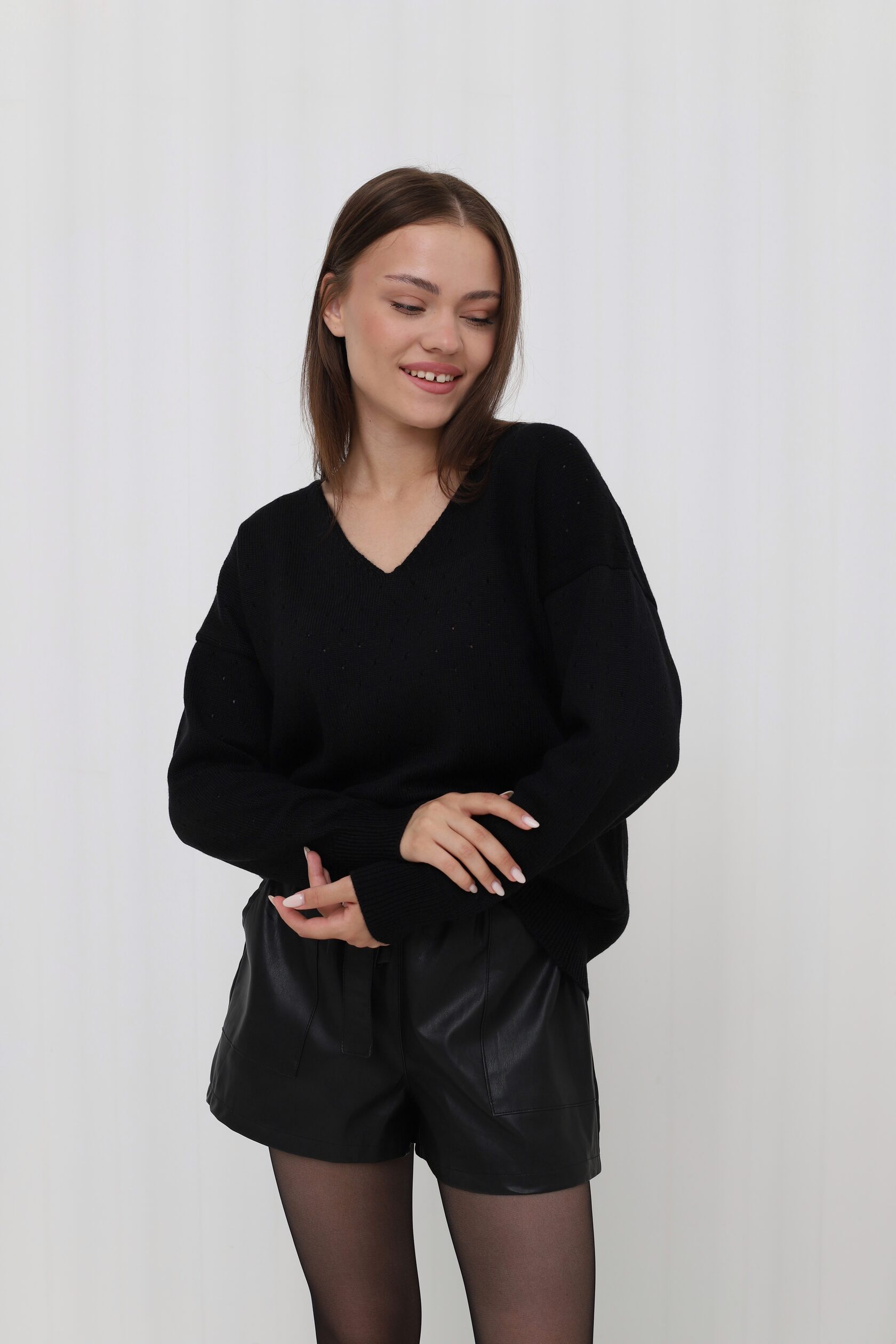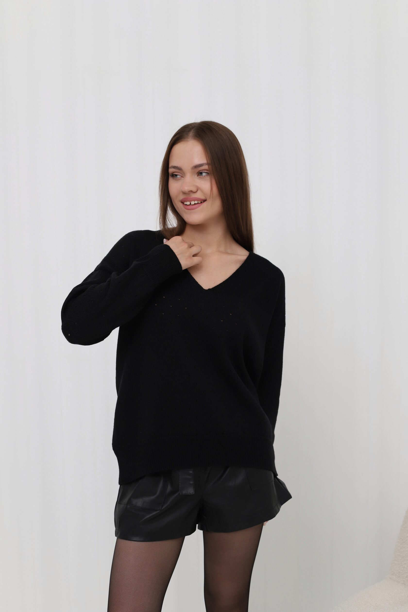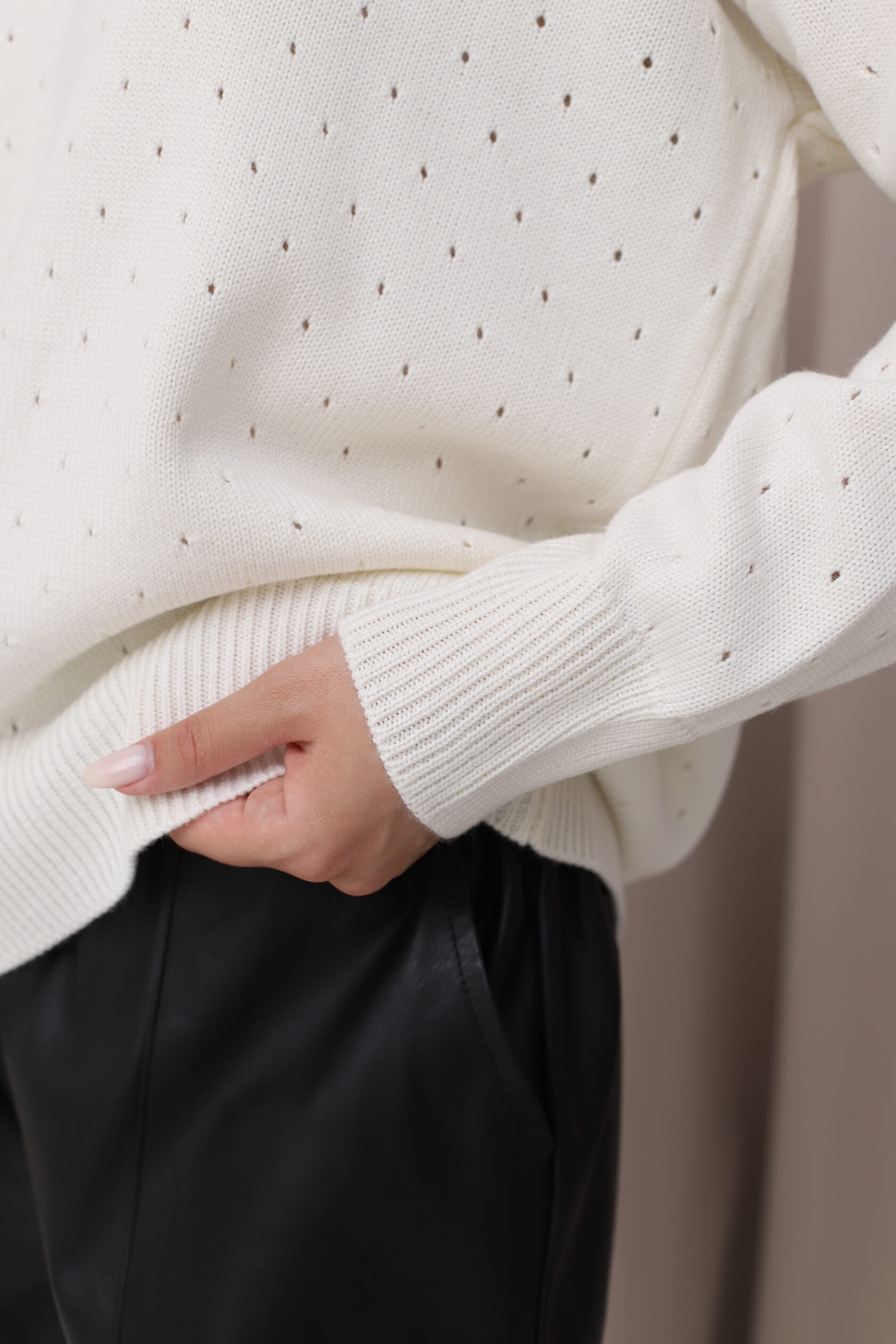 Джемпер женский ажурный свободного силуэта средней длины, выполнен в романтическом стиле. Модель с V-образной горловиной, с длинным рукавом и спущенной линией плеча. Нижний край переда чуть скруглен и завышен относительно спинки. Низ изделия и низ рукава оформлены резинкой.