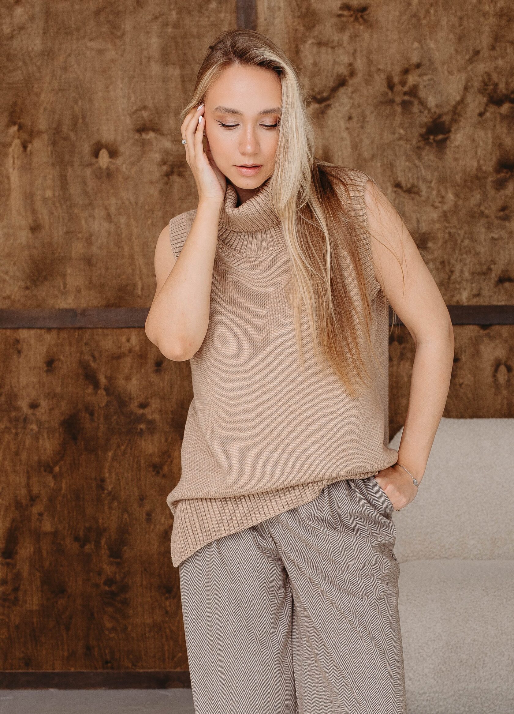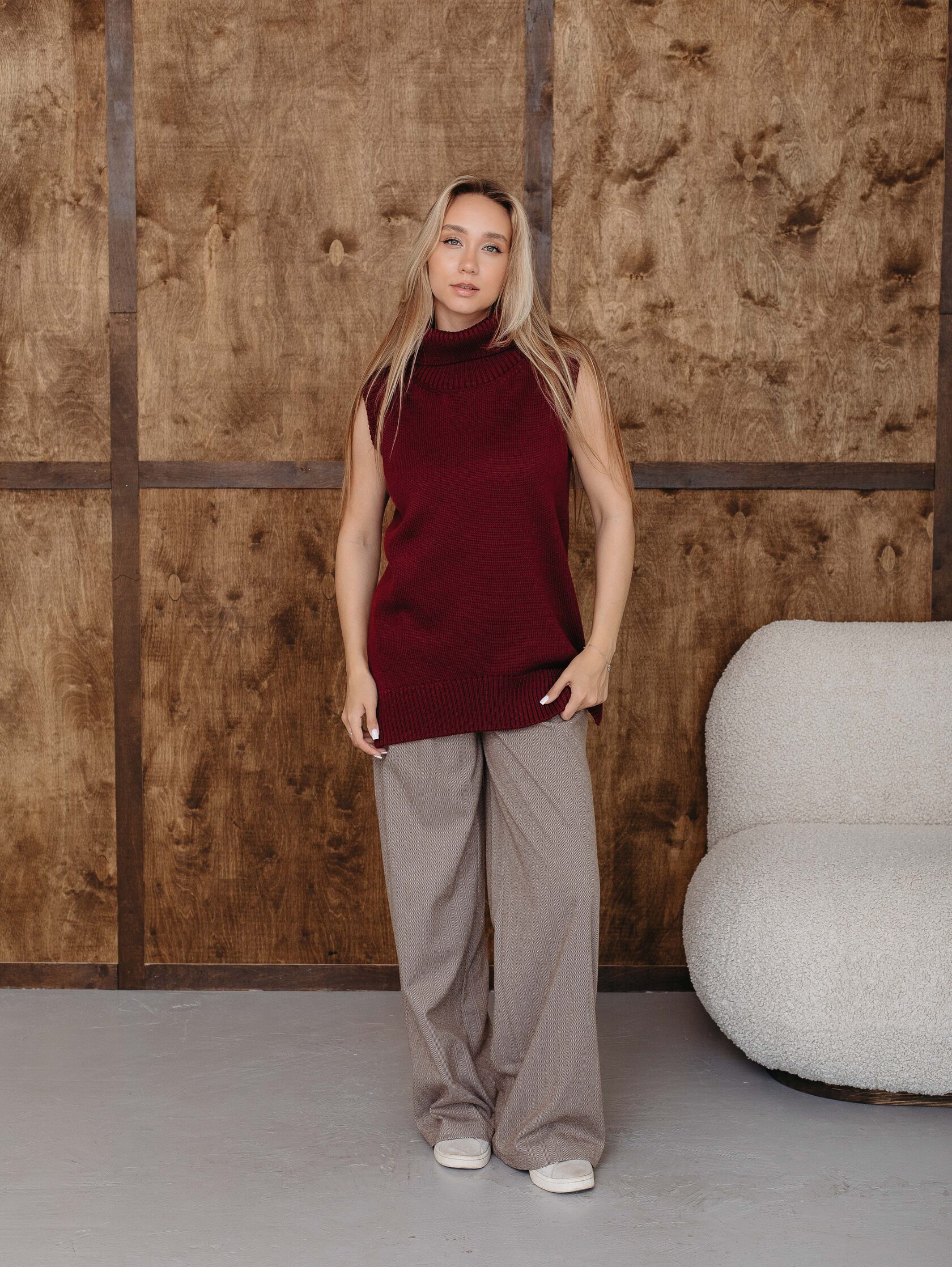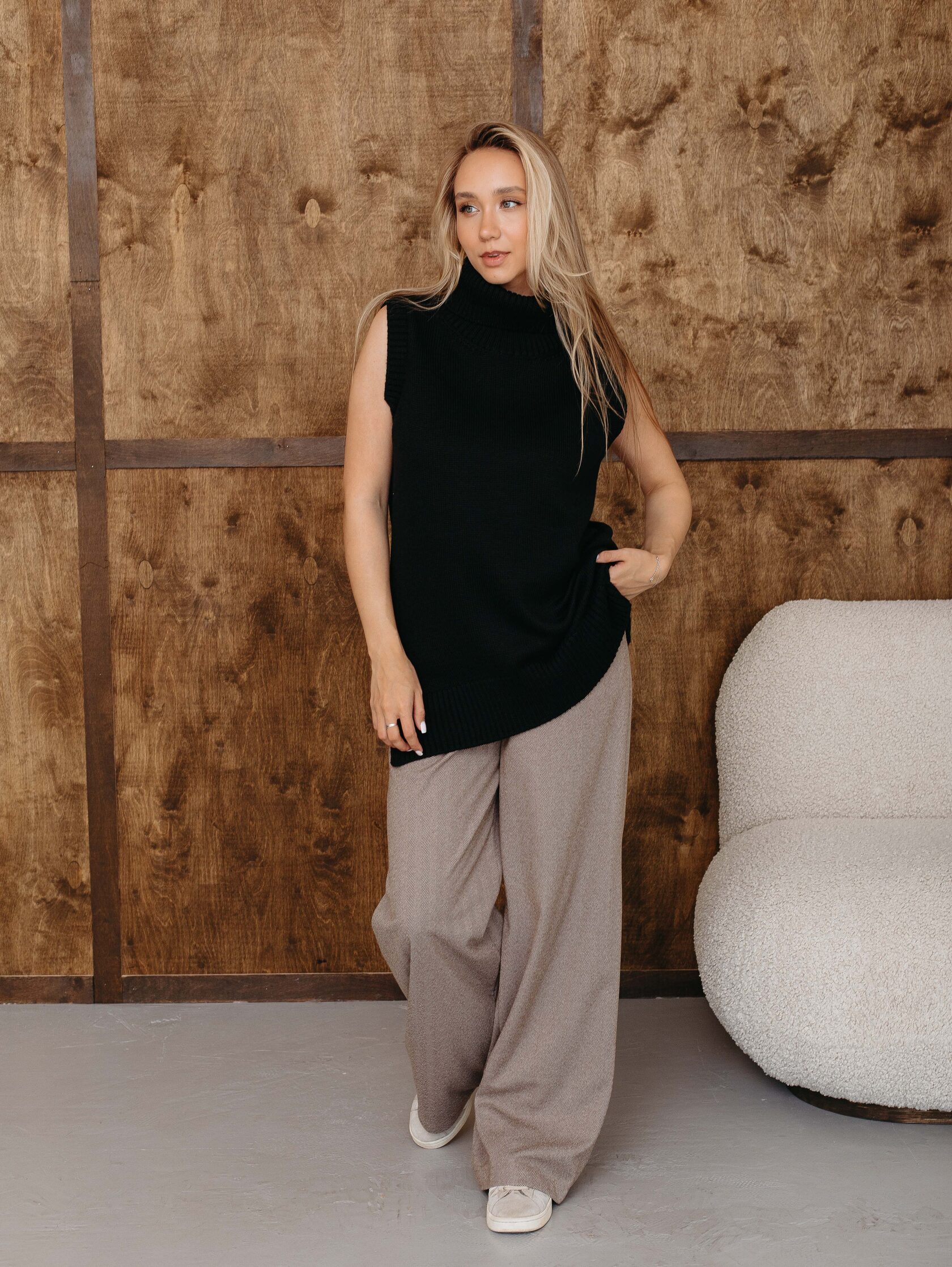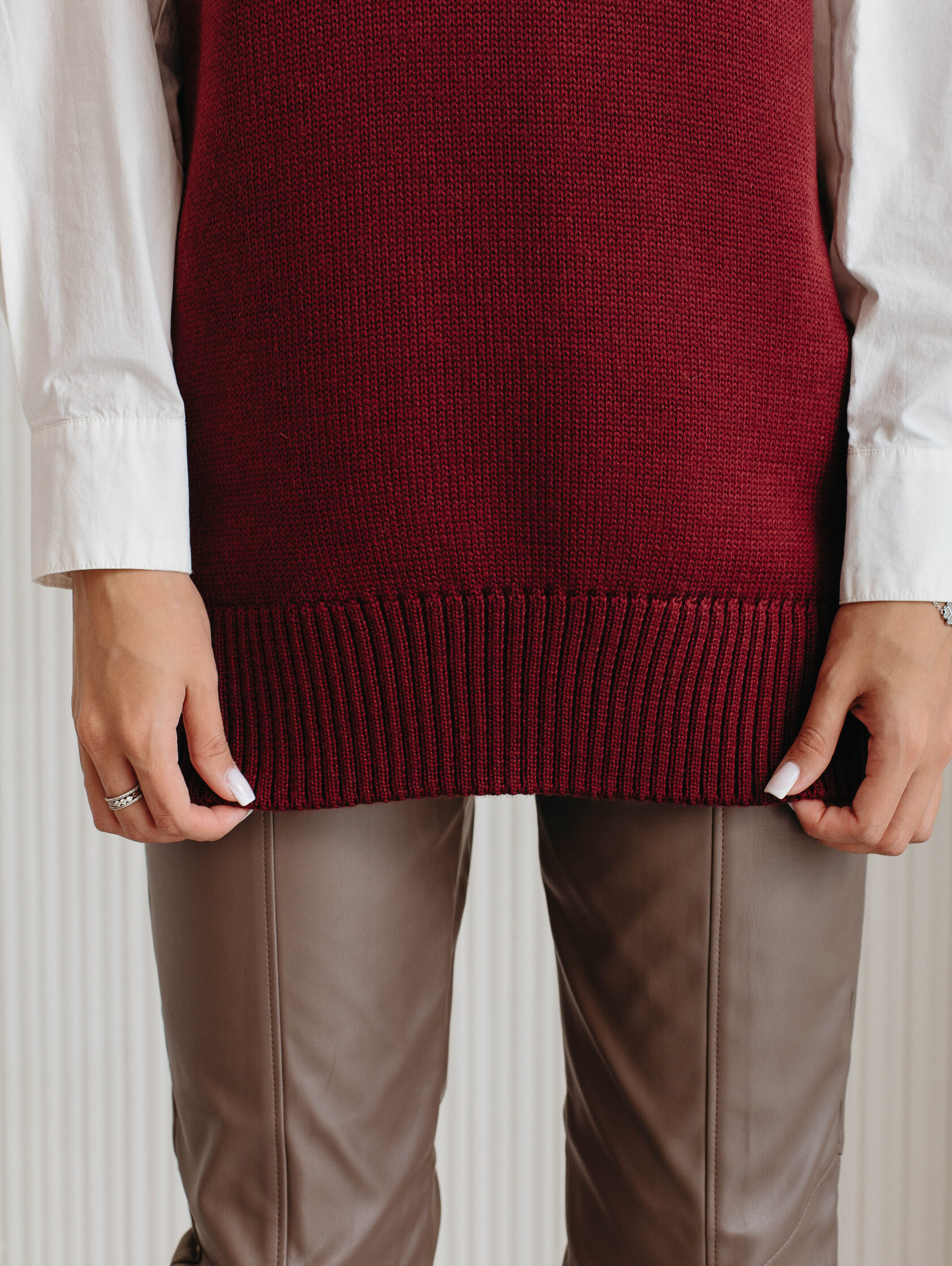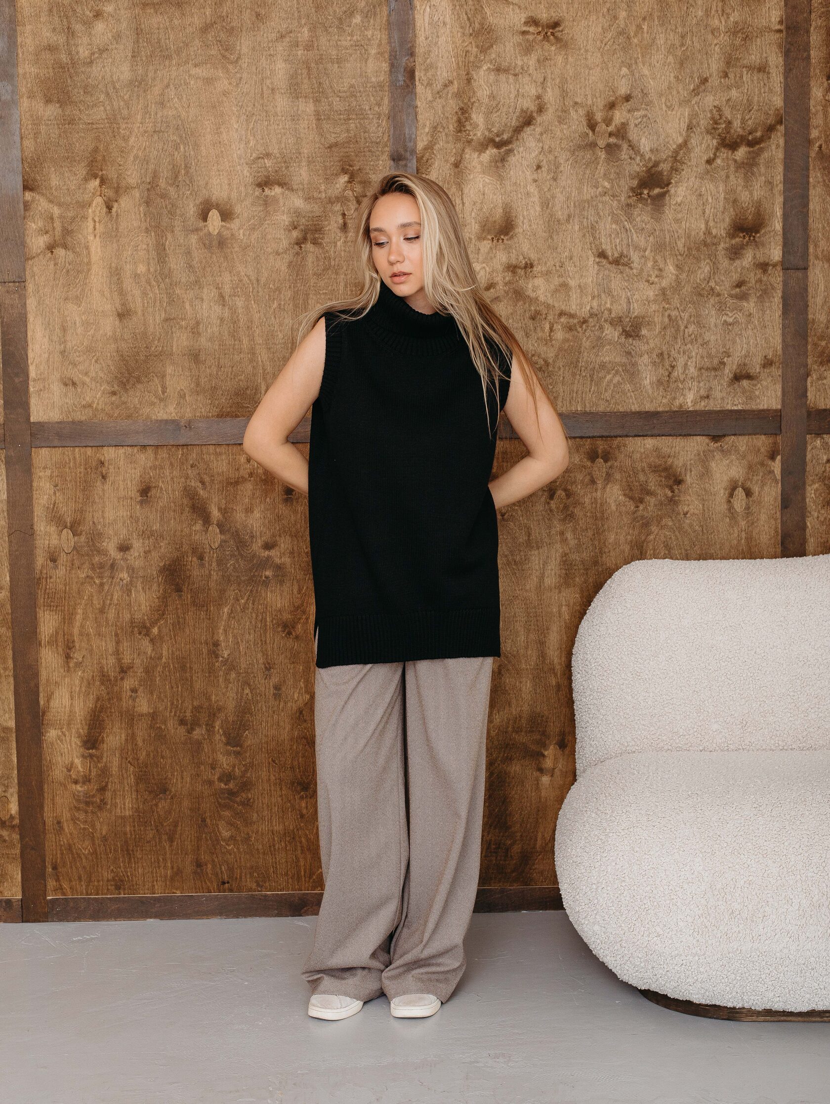 Жилет длинный женский свободного силуэта с высоким воротником, выполненным резинкой. Округлые края деталей оформлены декоративными сбавками. Линия проймы и низ изделия завершены резинкой. Благодаря гладкой вязки жилет не придает лишнего объема. Возможны два варианта носки - как самостоятельный первый слой одежды, так и в сочетании с рубашкой (блузкой,топом, футболкой). Отлично комбинируется с ремнем.