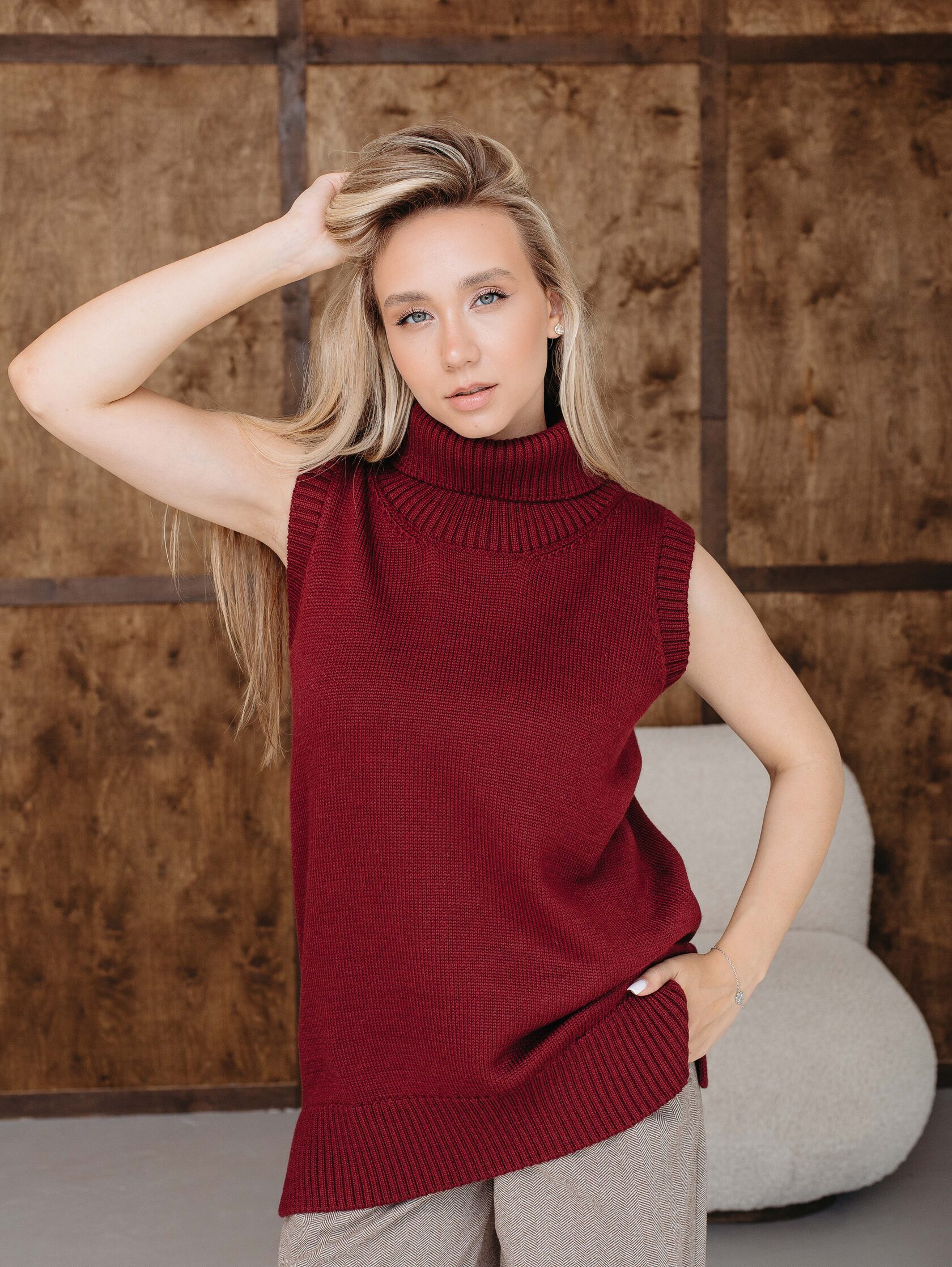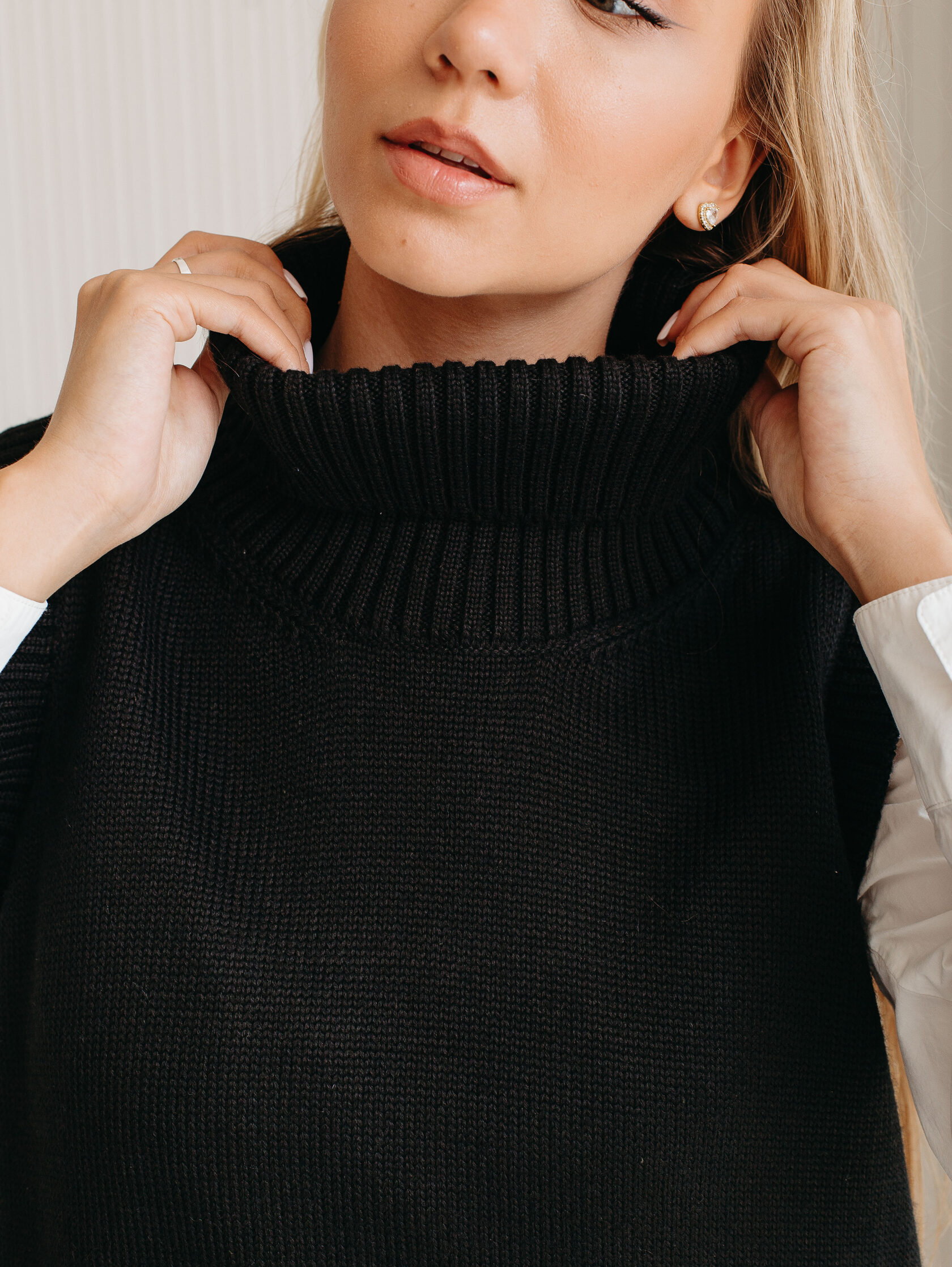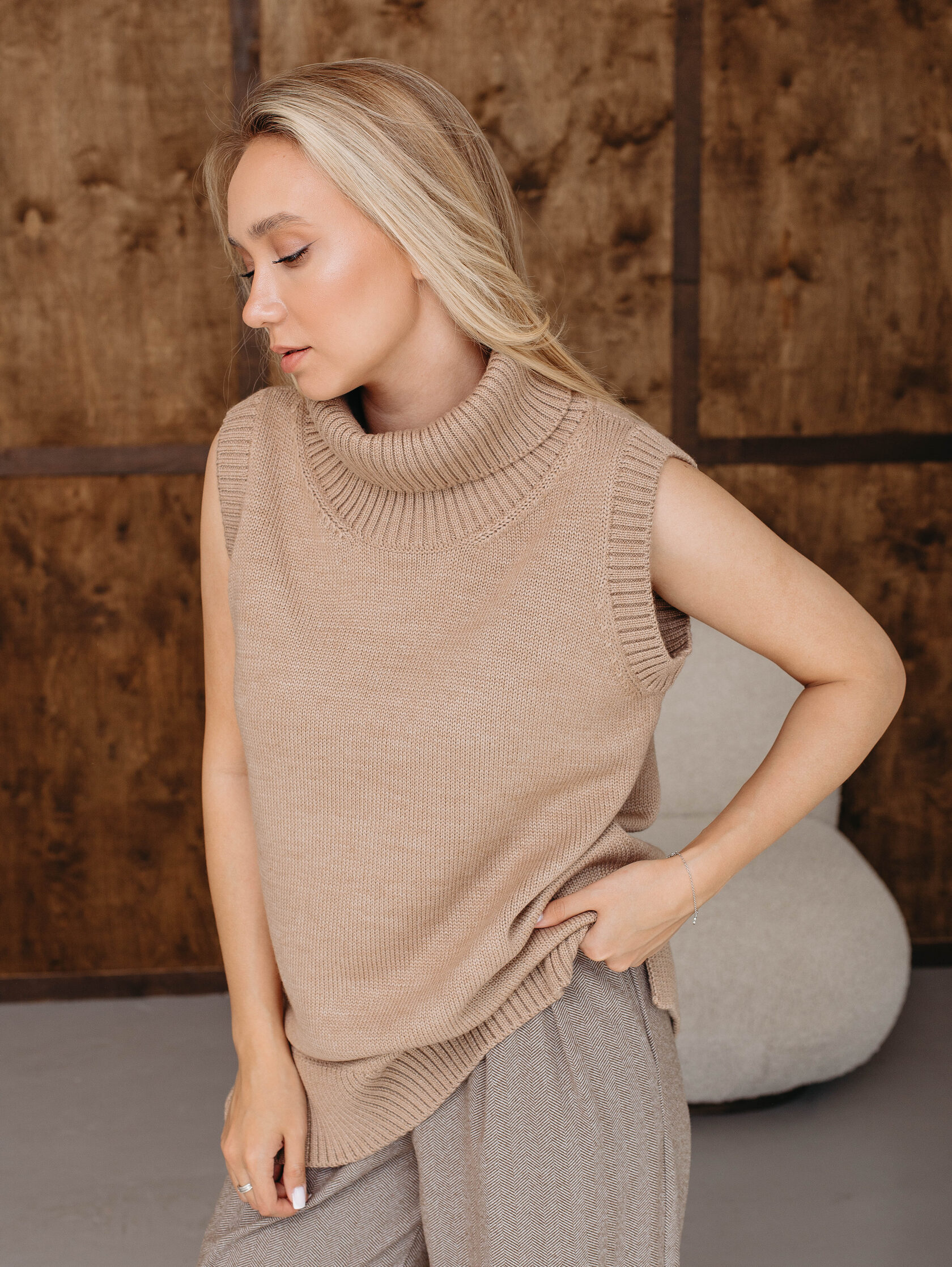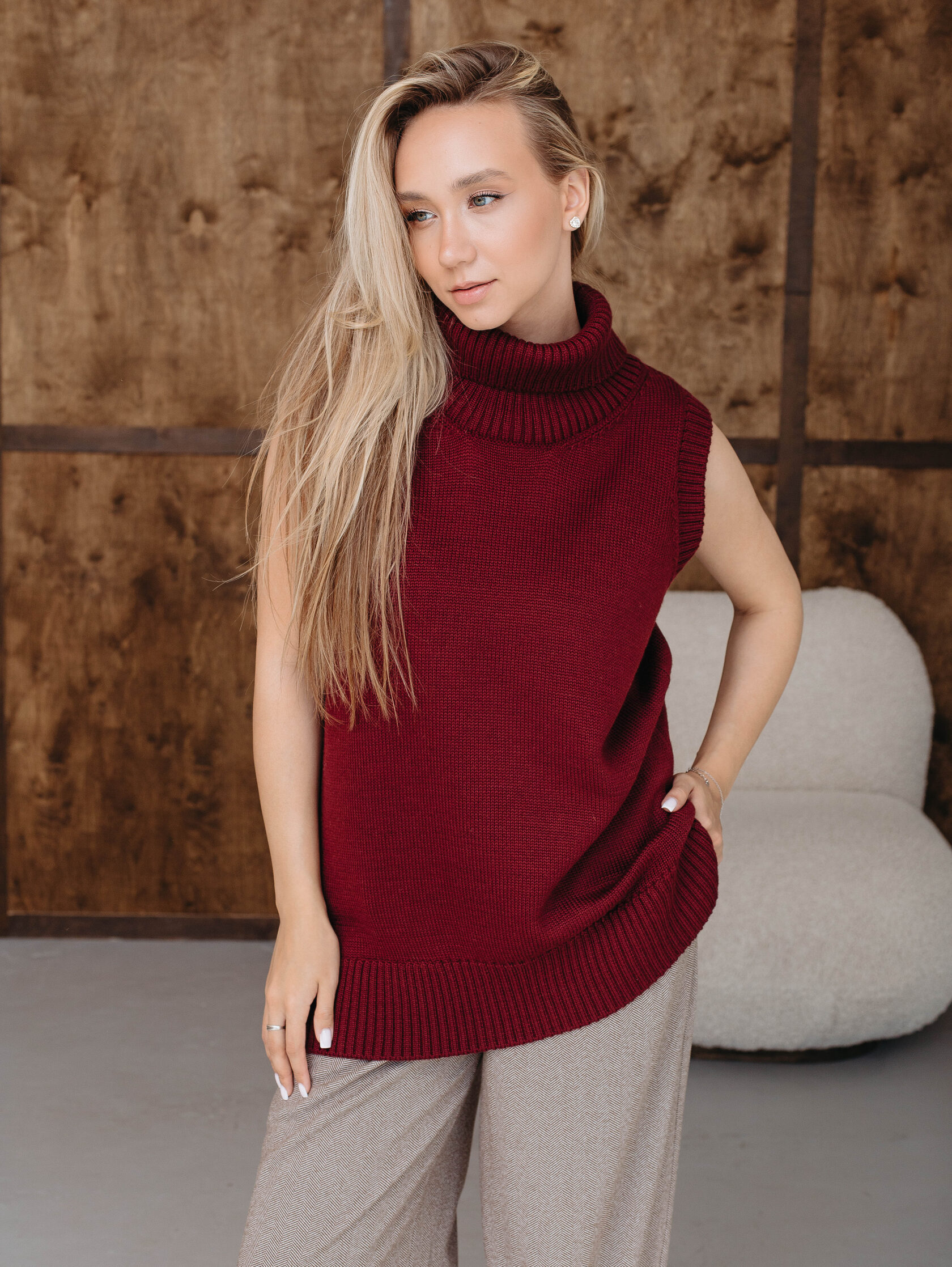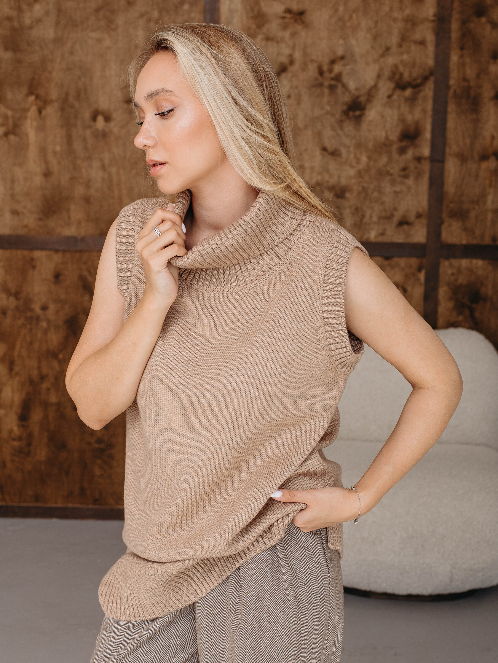 Жилет длинный женский свободного силуэта с высоким воротником, выполненным резинкой. Округлые края деталей оформлены декоративными сбавками. Линия проймы и низ изделия завершены резинкой. Благодаря гладкой вязки жилет не придает лишнего объема. Возможны два варианта носки - как самостоятельный первый слой одежды, так и в сочетании с рубашкой (блузкой,топом, футболкой). Отлично комбинируется с ремнем.