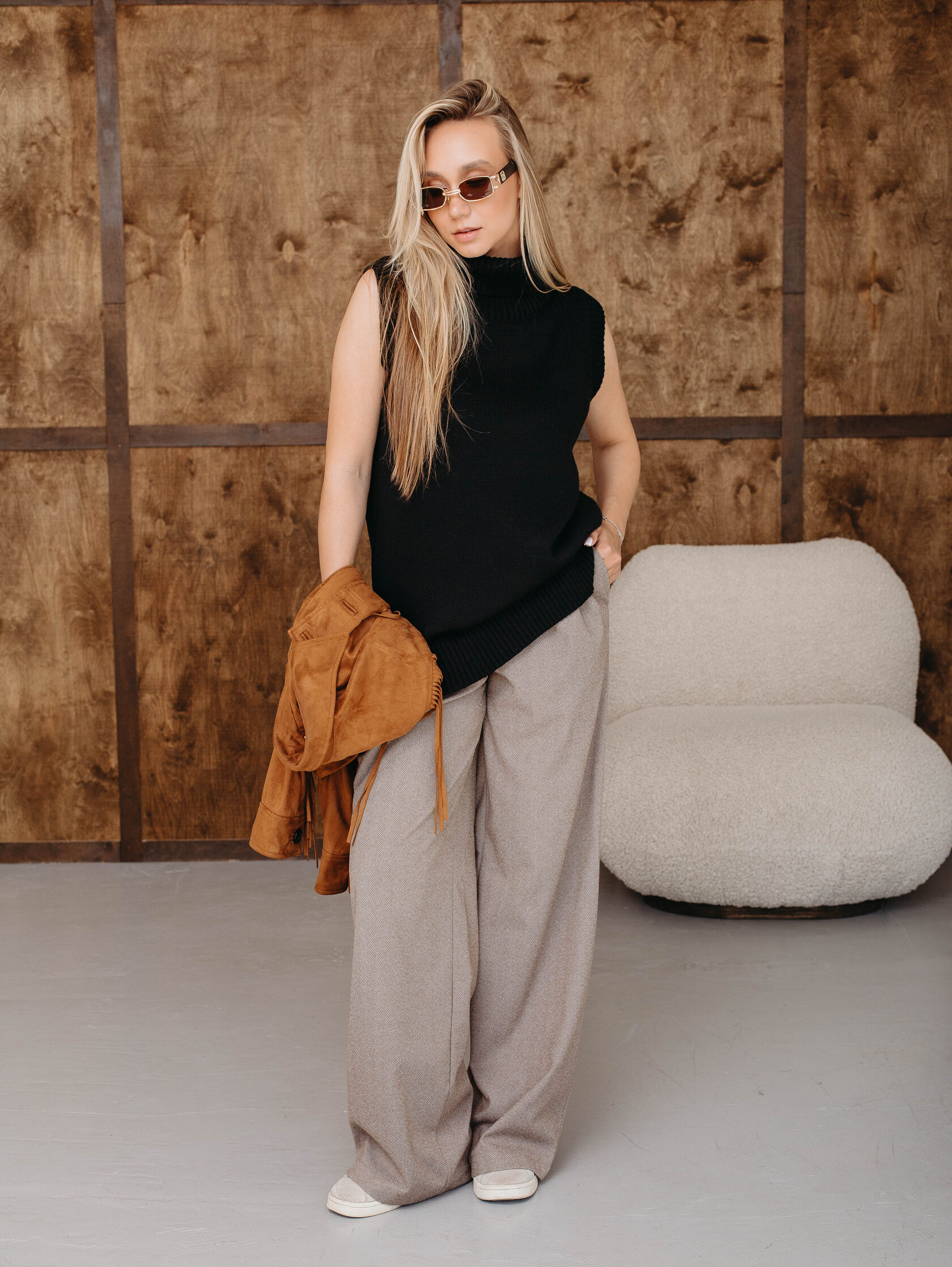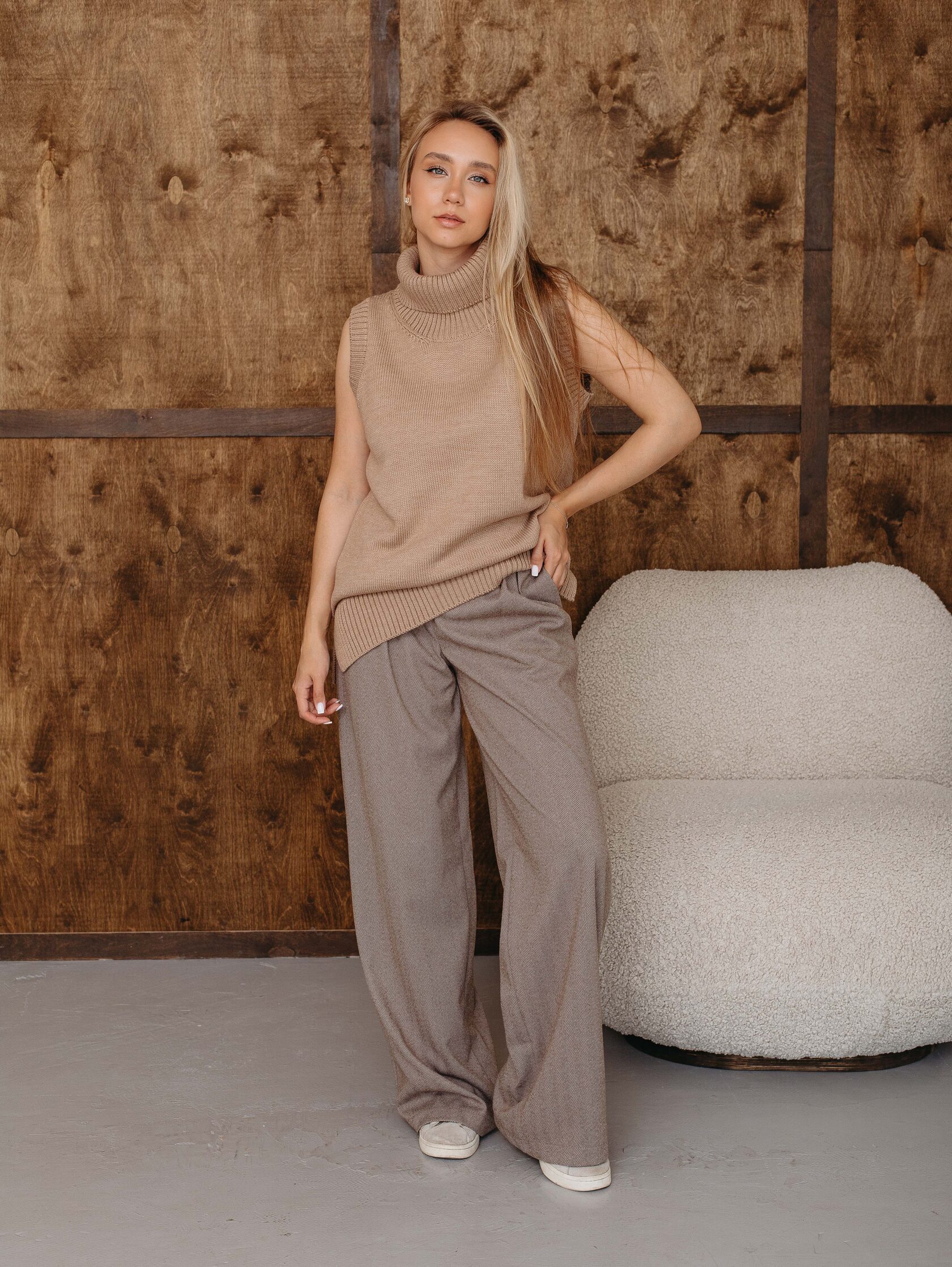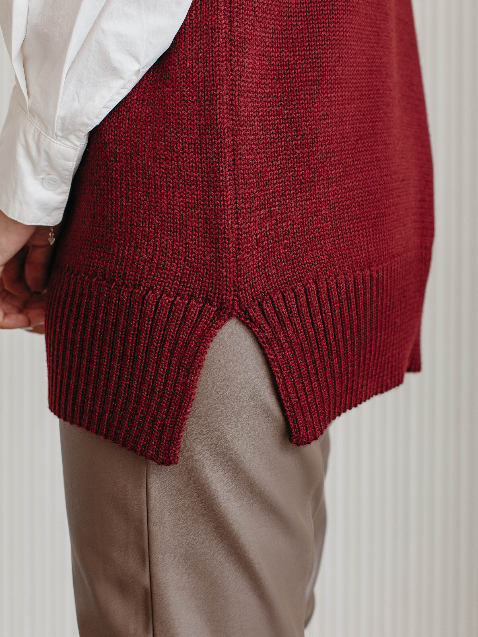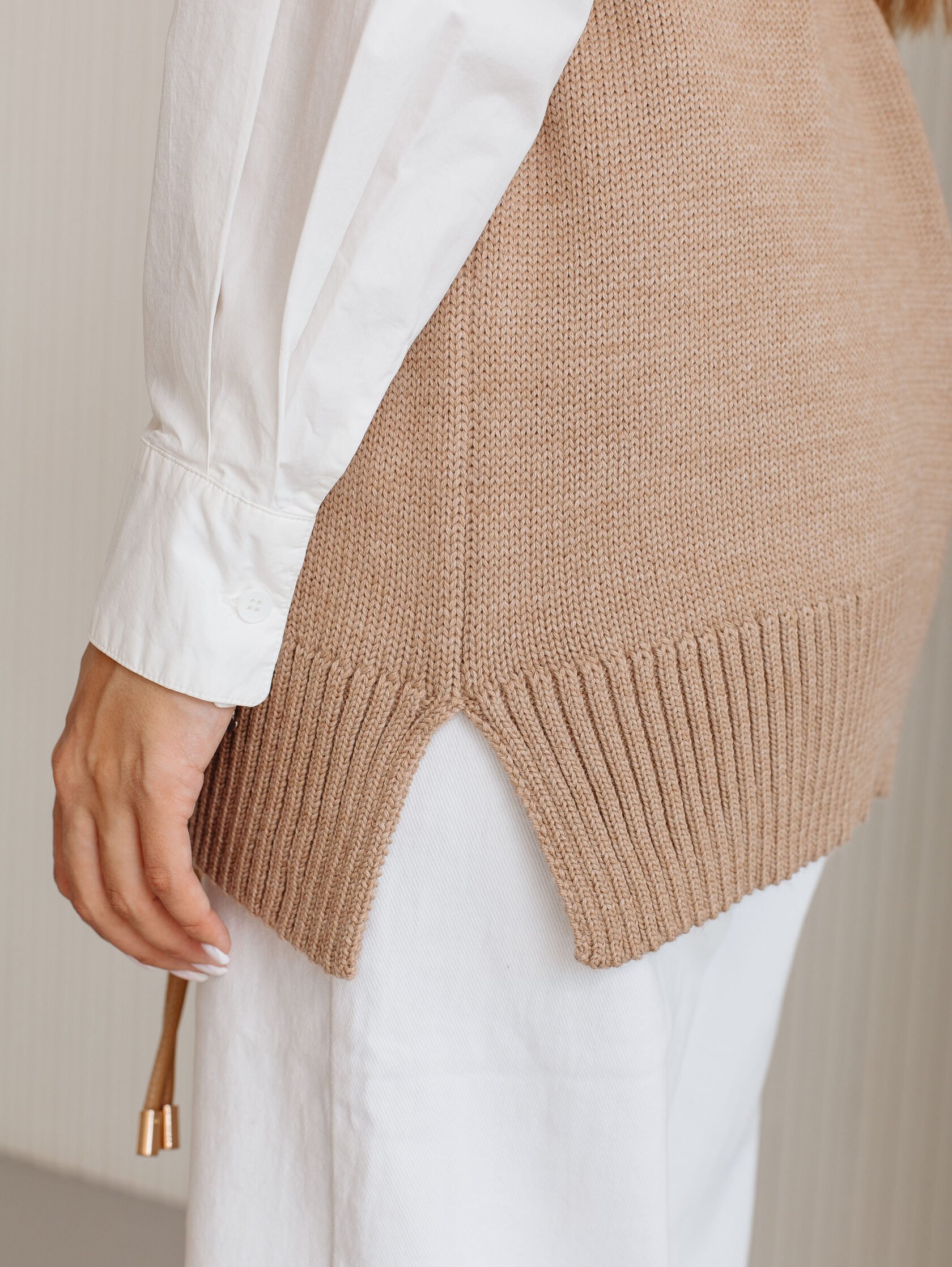 Жилет длинный женский свободного силуэта с высоким воротником, выполненным резинкой. Округлые края деталей оформлены декоративными сбавками. Линия проймы и низ изделия завершены резинкой. Благодаря гладкой вязки жилет не придает лишнего объема. Возможны два варианта носки - как самостоятельный первый слой одежды, так и в сочетании с рубашкой (блузкой,топом, футболкой). Отлично комбинируется с ремнем.