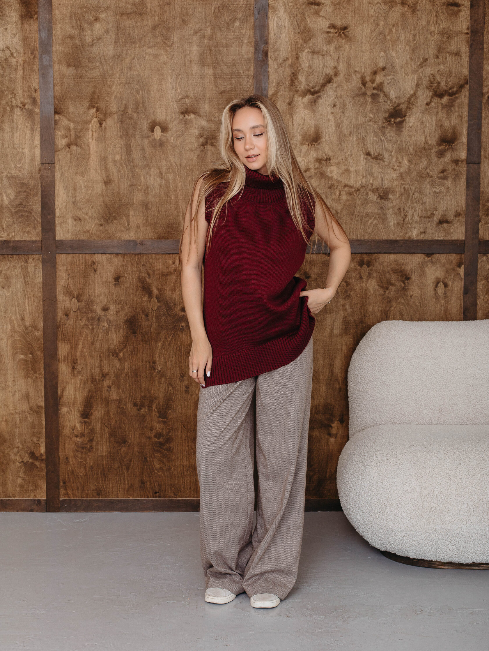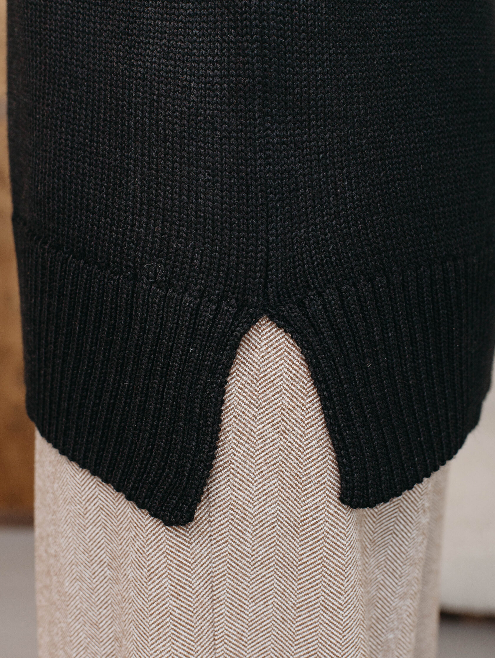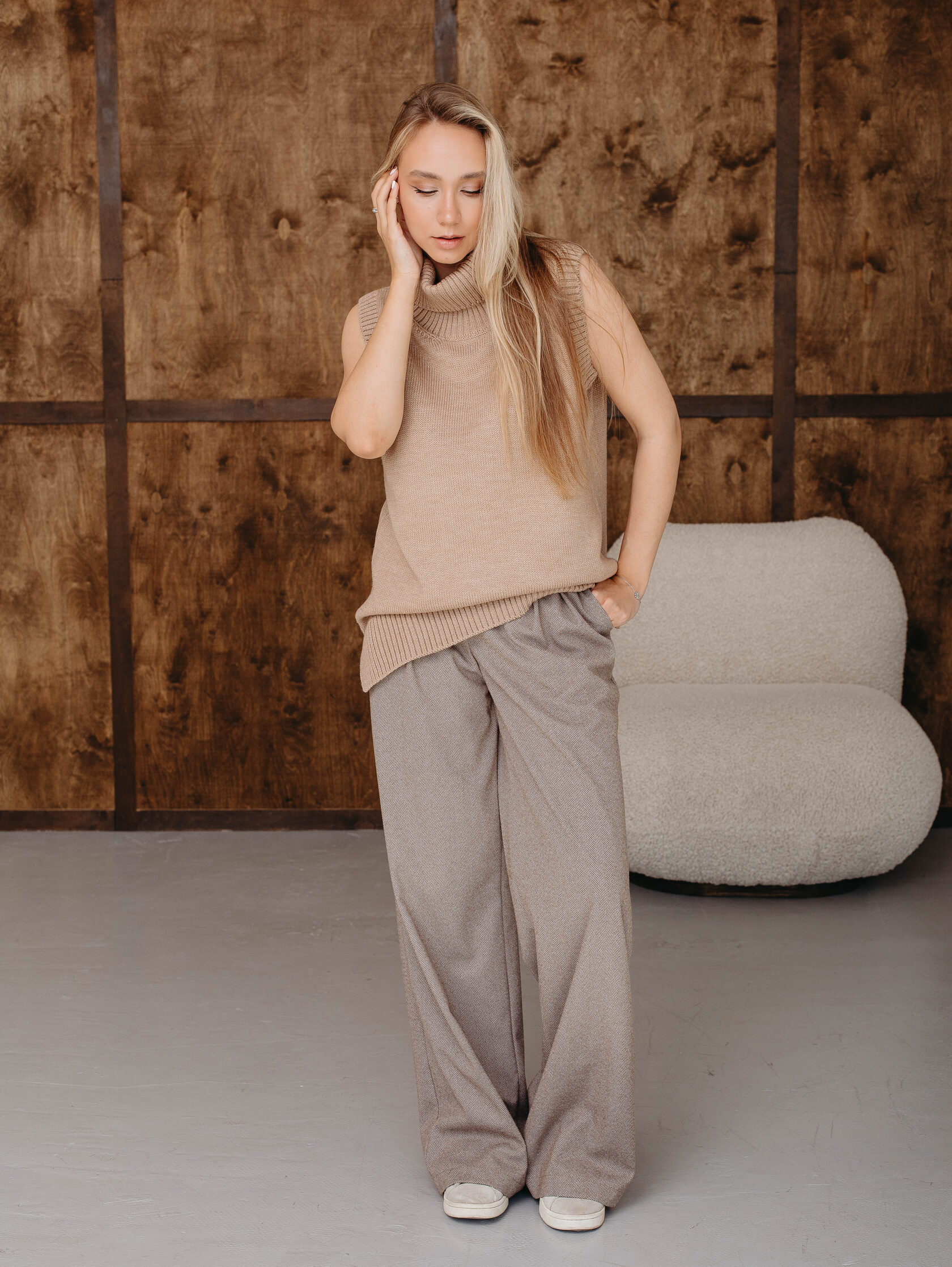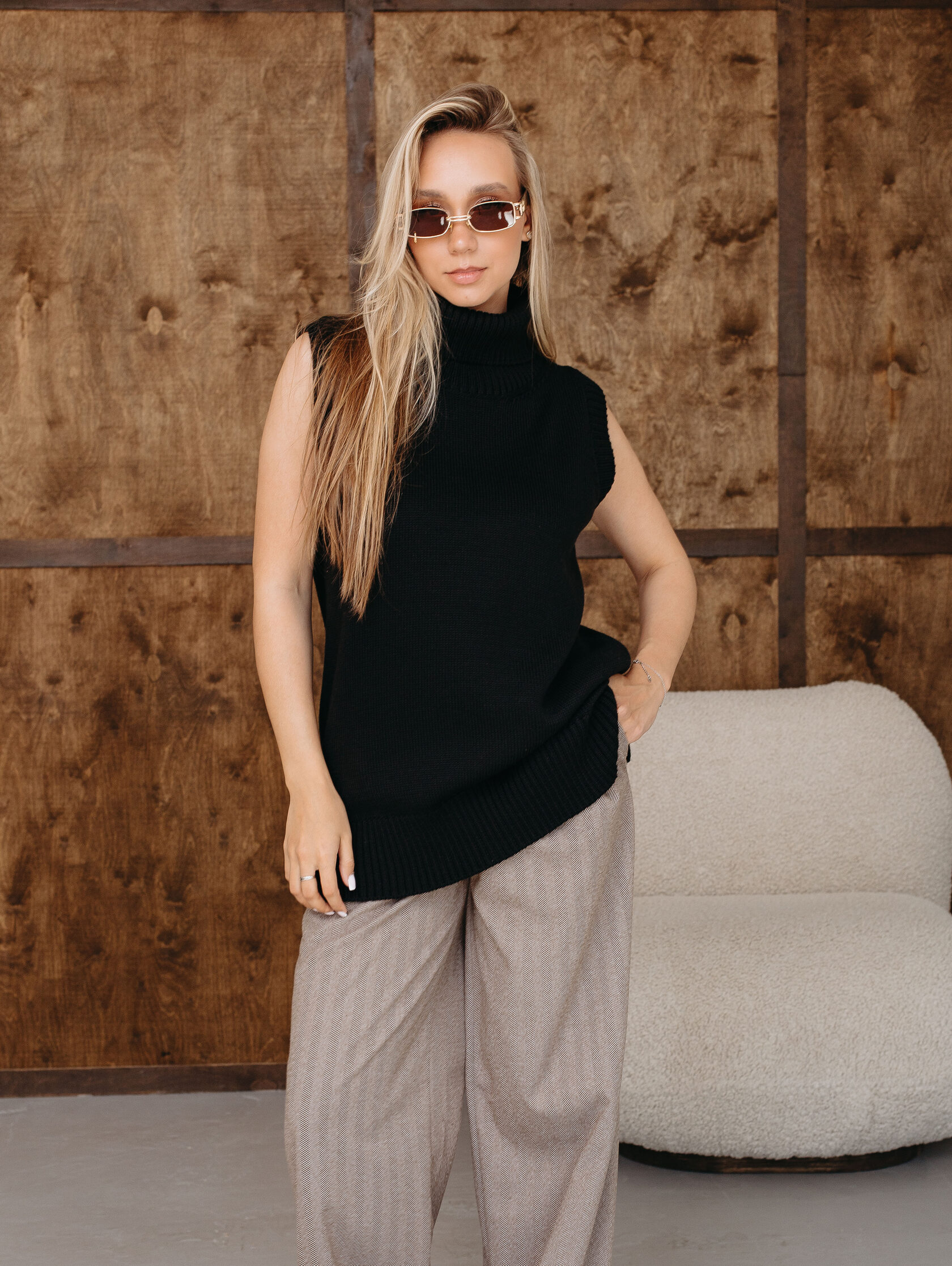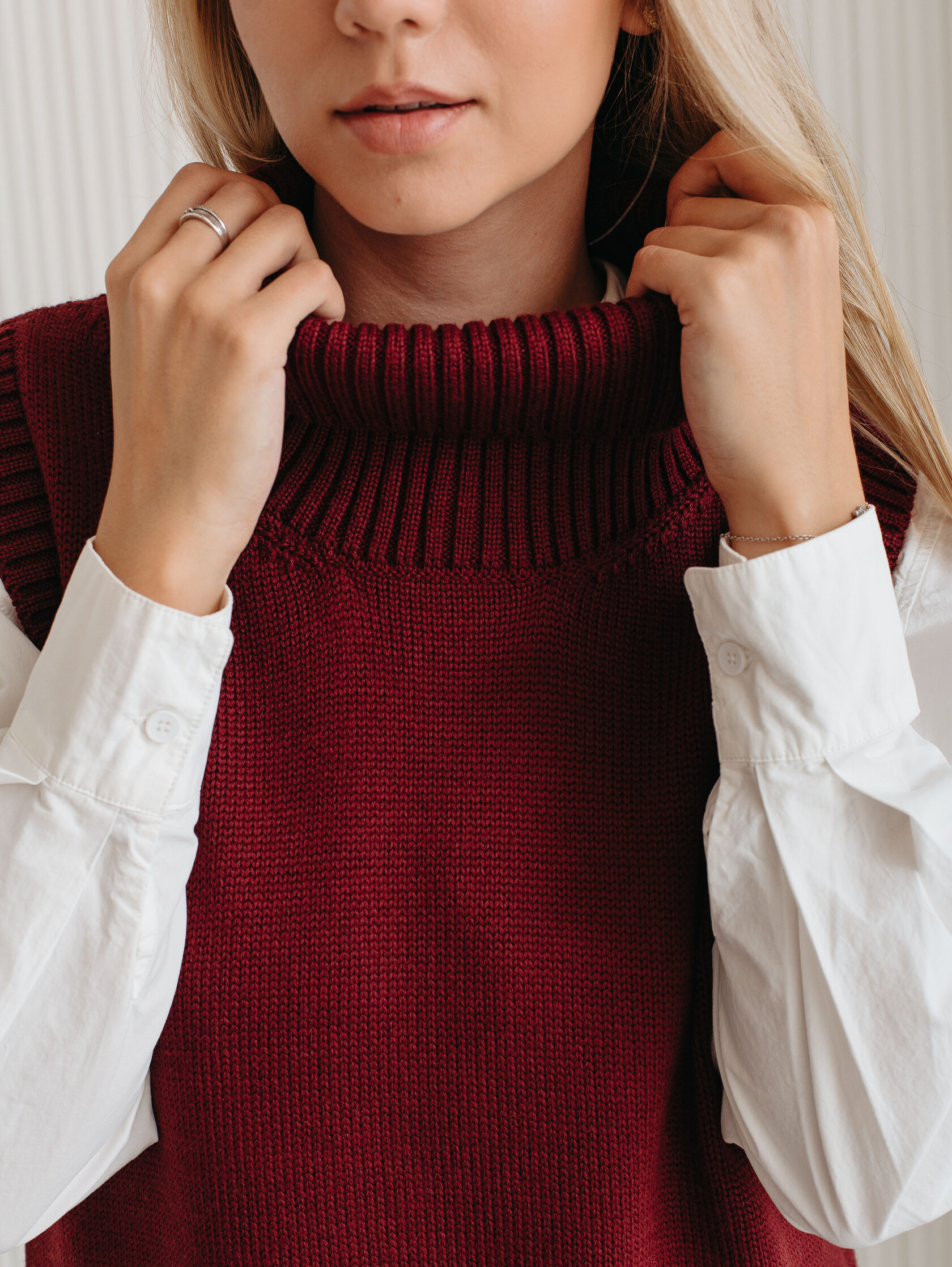 Жилет длинный женский свободного силуэта с высоким воротником, выполненным резинкой. Округлые края деталей оформлены декоративными сбавками. Линия проймы и низ изделия завершены резинкой. Благодаря гладкой вязки жилет не придает лишнего объема. Возможны два варианта носки - как самостоятельный первый слой одежды, так и в сочетании с рубашкой (блузкой,топом, футболкой). Отлично комбинируется с ремнем.
