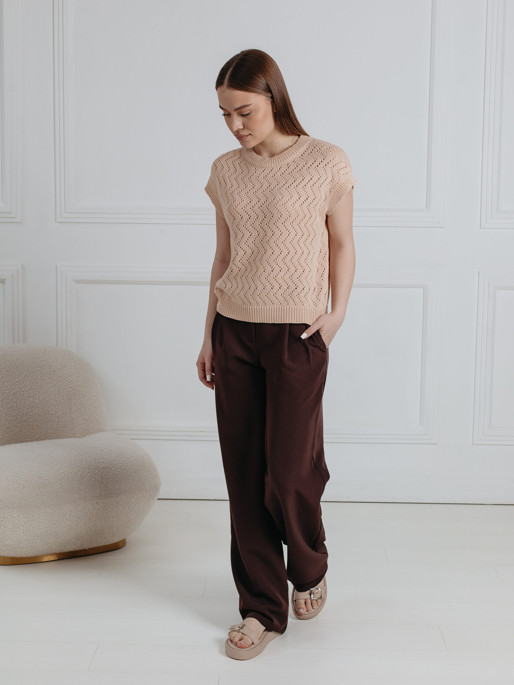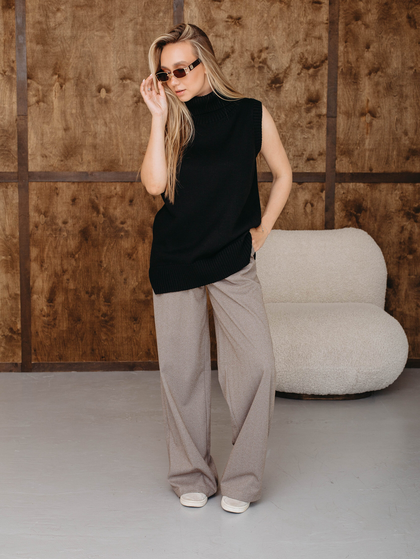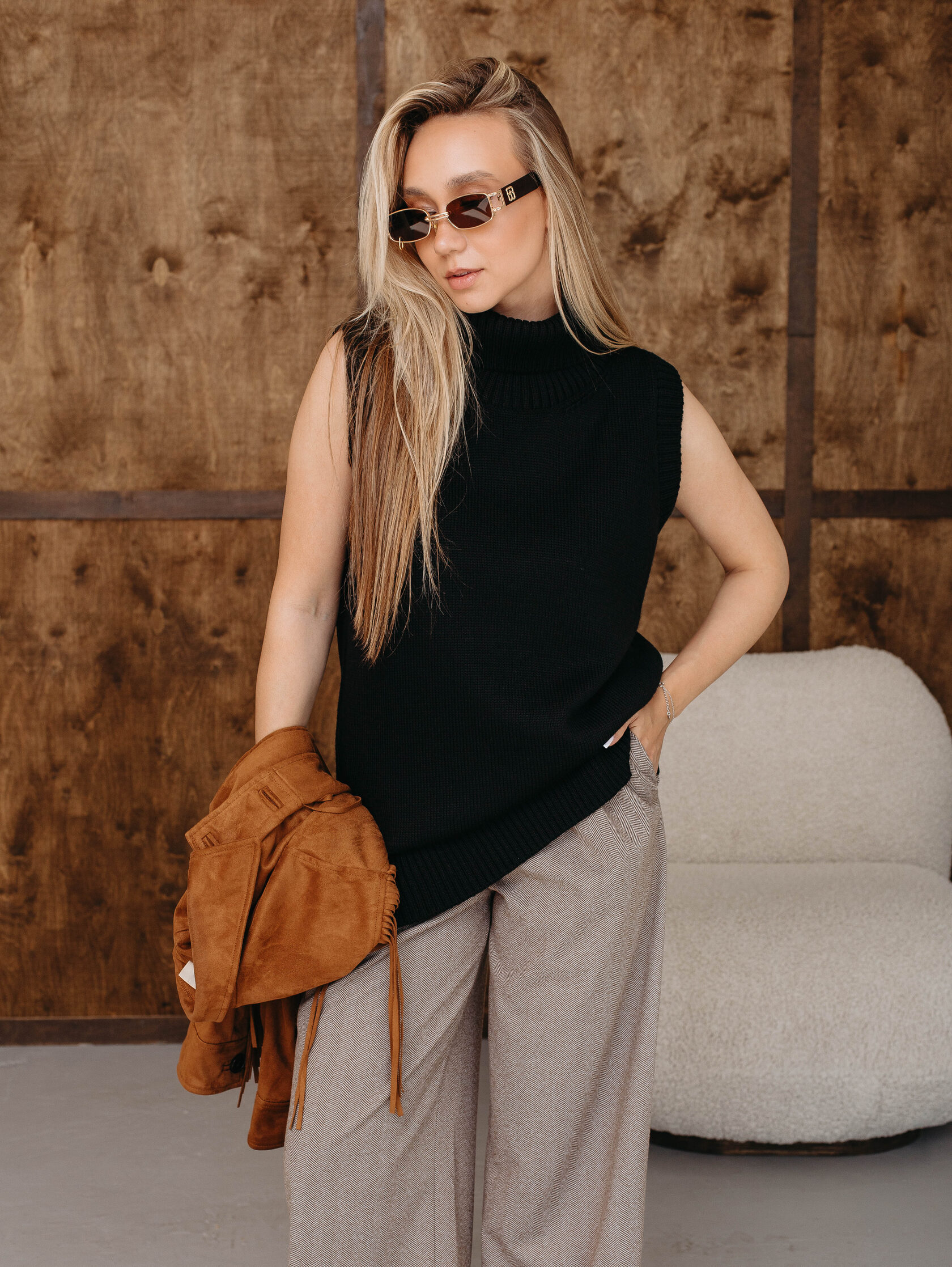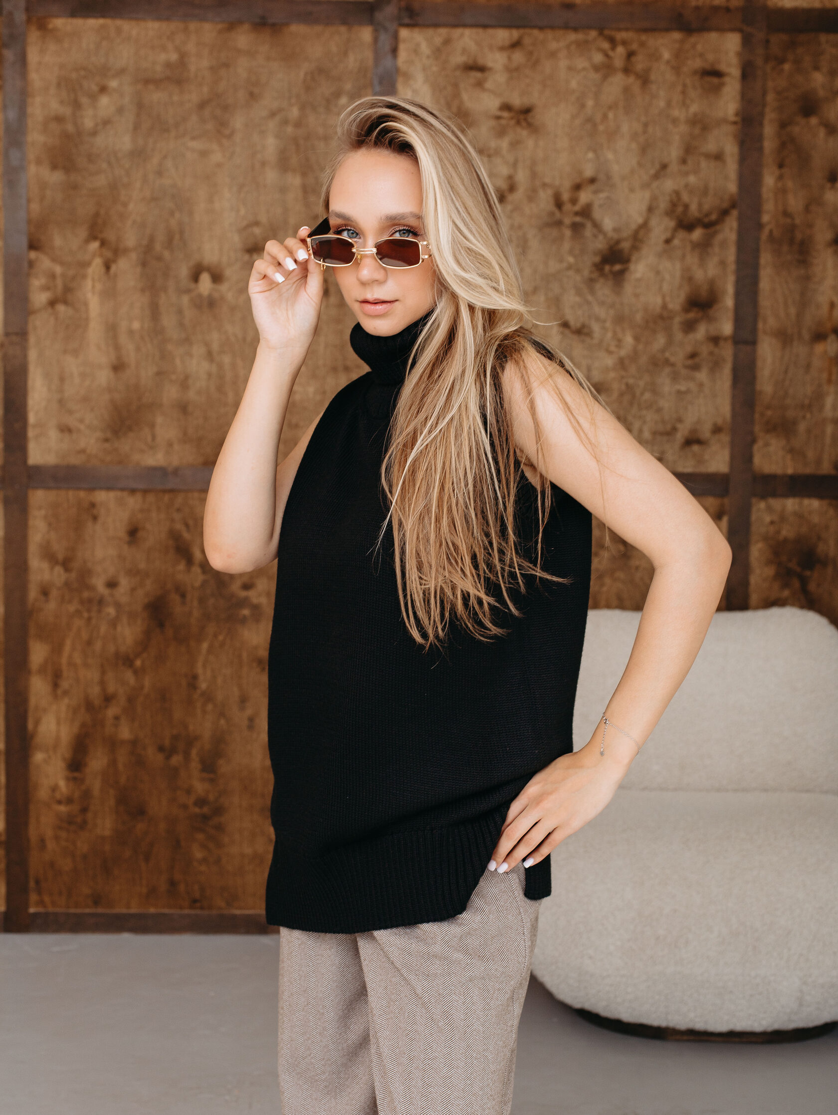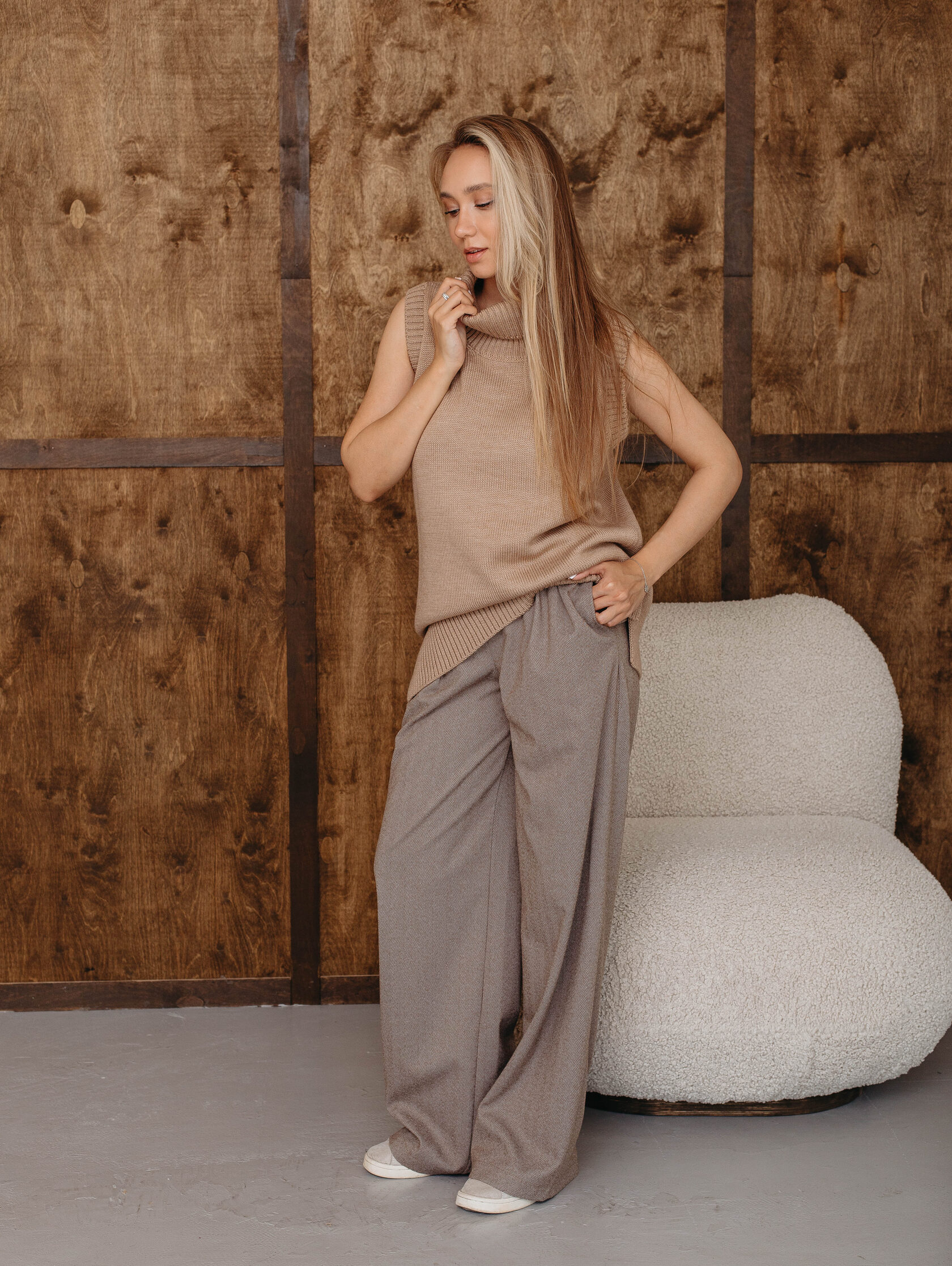 Жилет длинный женский свободного силуэта с высоким воротником, выполненным резинкой. Округлые края деталей оформлены декоративными сбавками. Линия проймы и низ изделия завершены резинкой. Благодаря гладкой вязки жилет не придает лишнего объема. Возможны два варианта носки - как самостоятельный первый слой одежды, так и в сочетании с рубашкой (блузкой,топом, футболкой). Отлично комбинируется с ремнем.