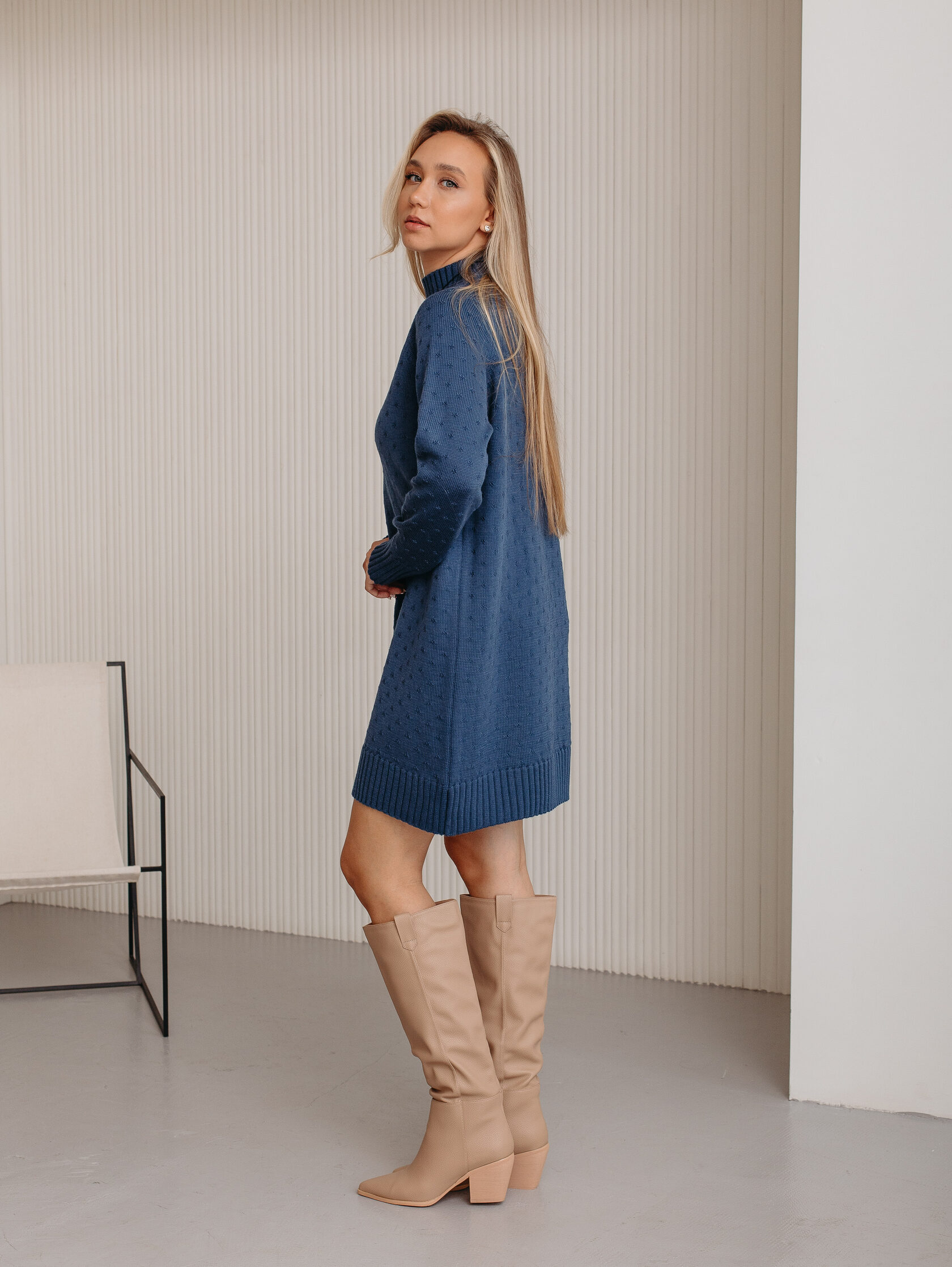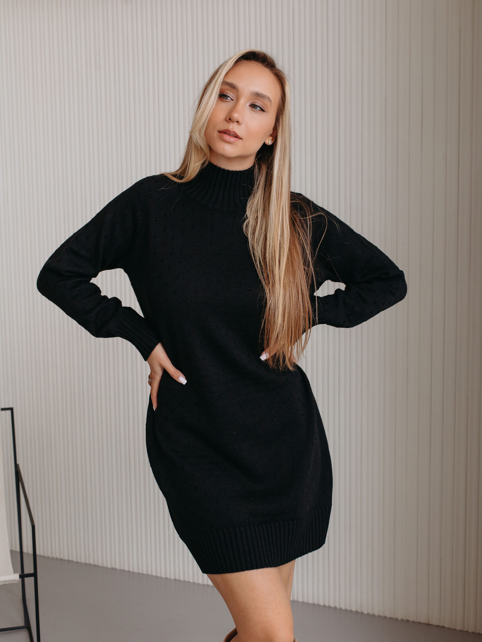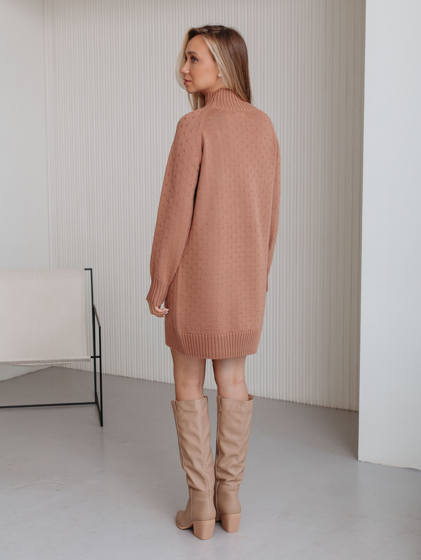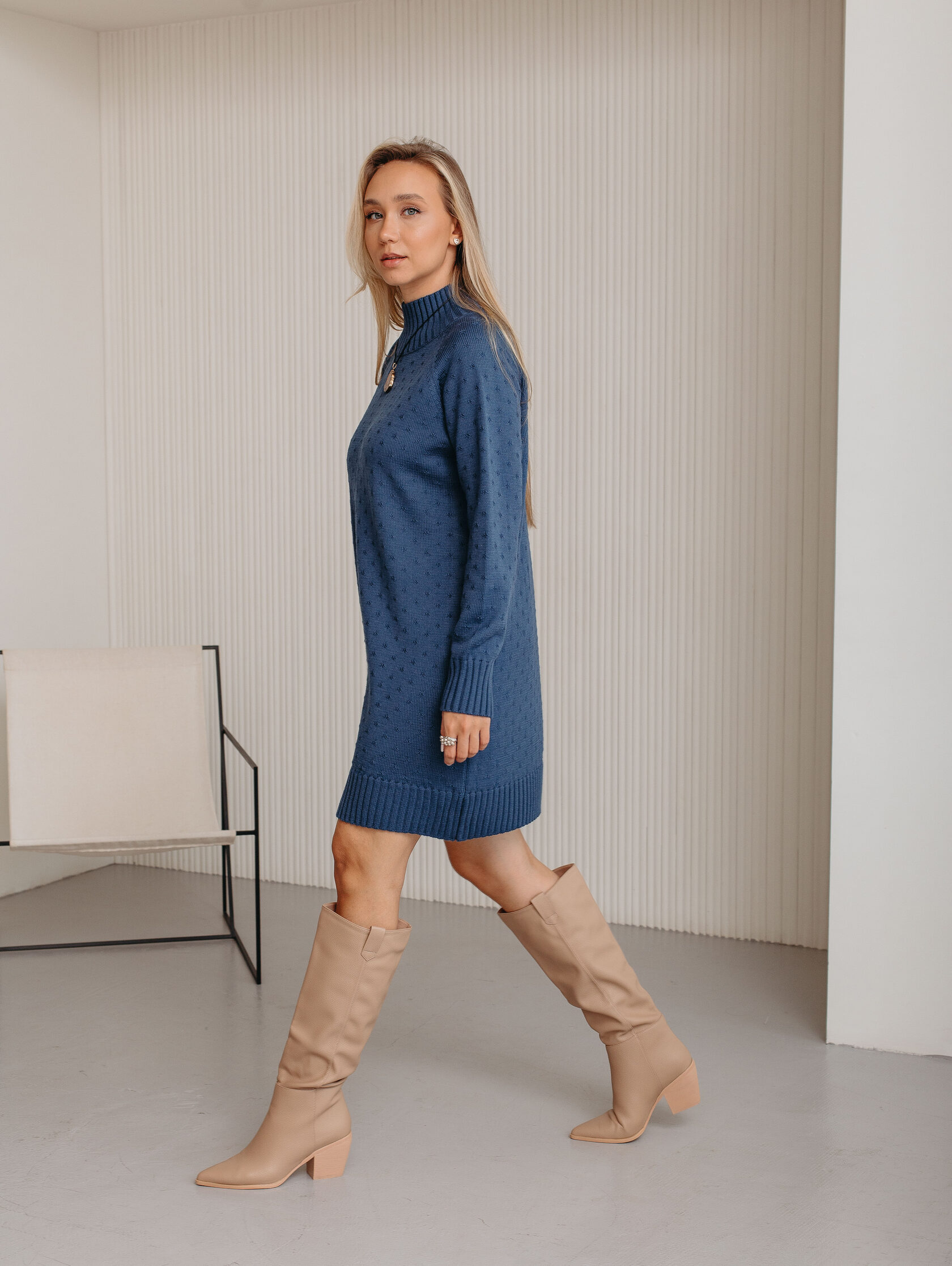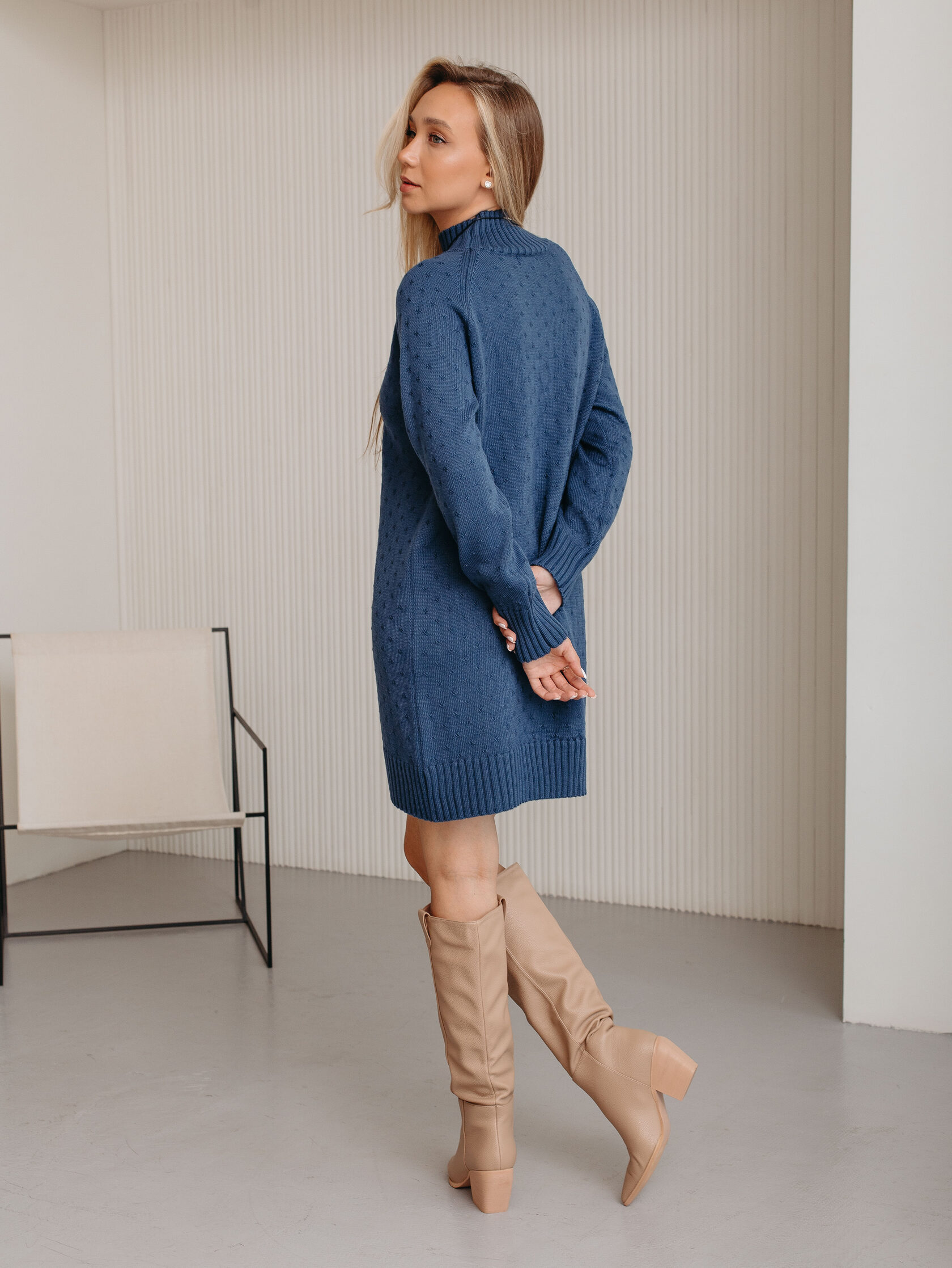 Повседневное женское платье свободного силуэта средней длины,с длинным рукавом покроя реглан. Воротник-стойка оптимальной высоты, выполнен резинкой. Фактурная вязка по всему изделию ярко выражена и добавляет модели особую женственность и привлекательность. Низ изделия и низ рукава завершены резинкой.