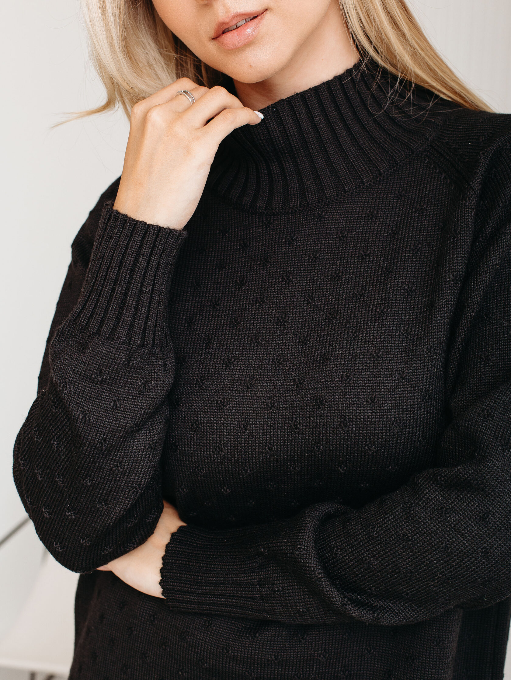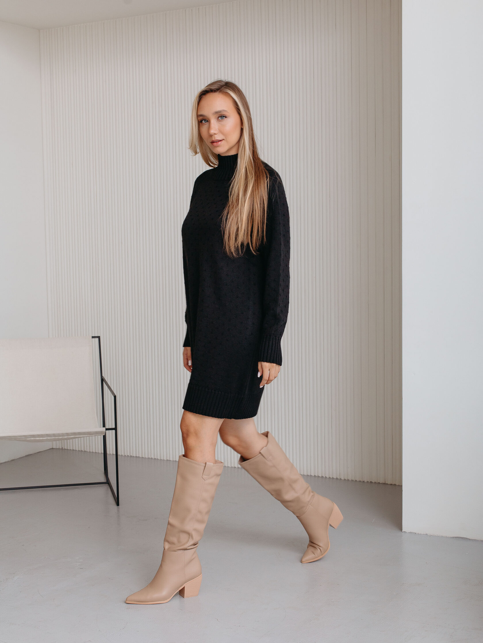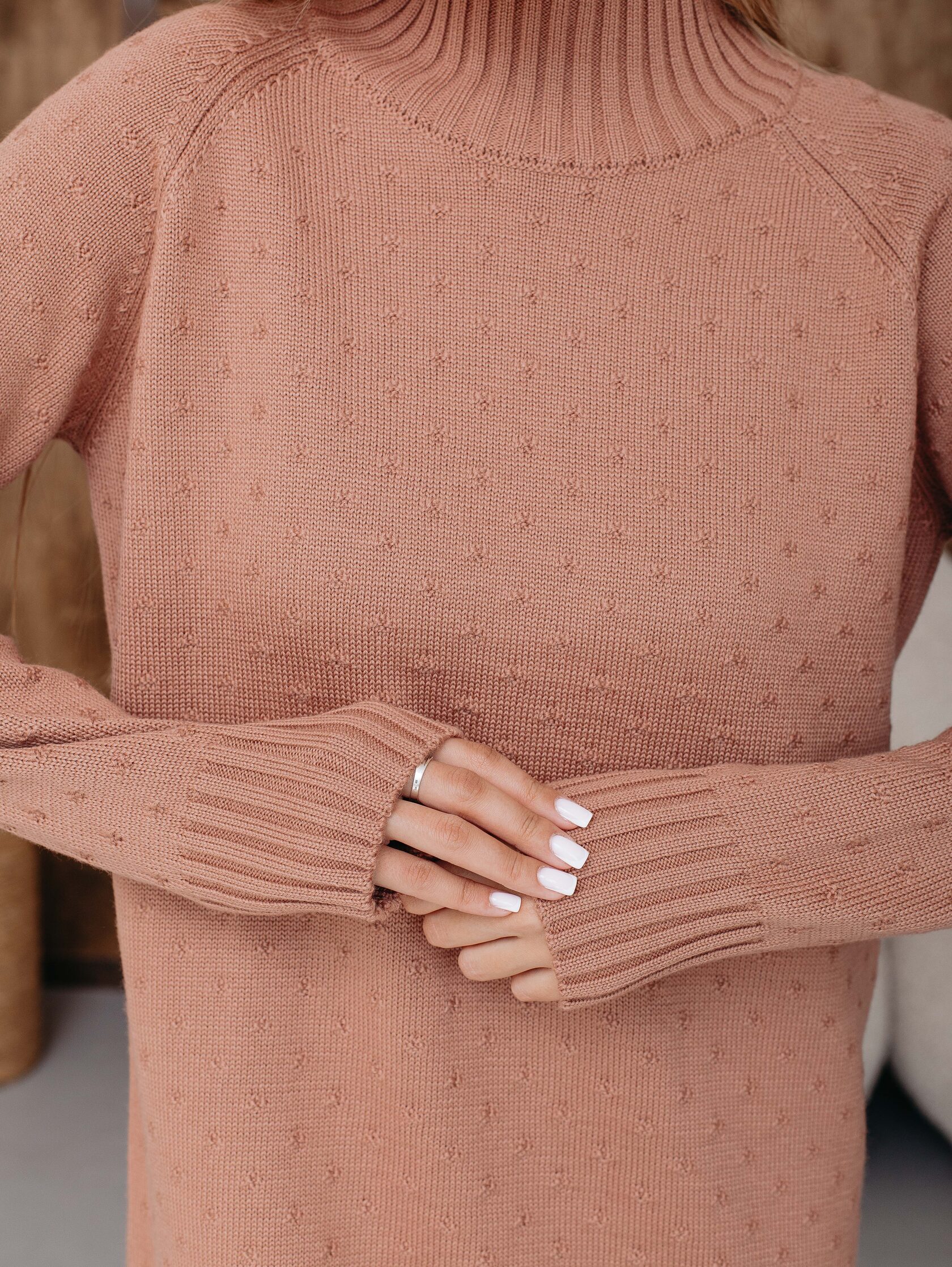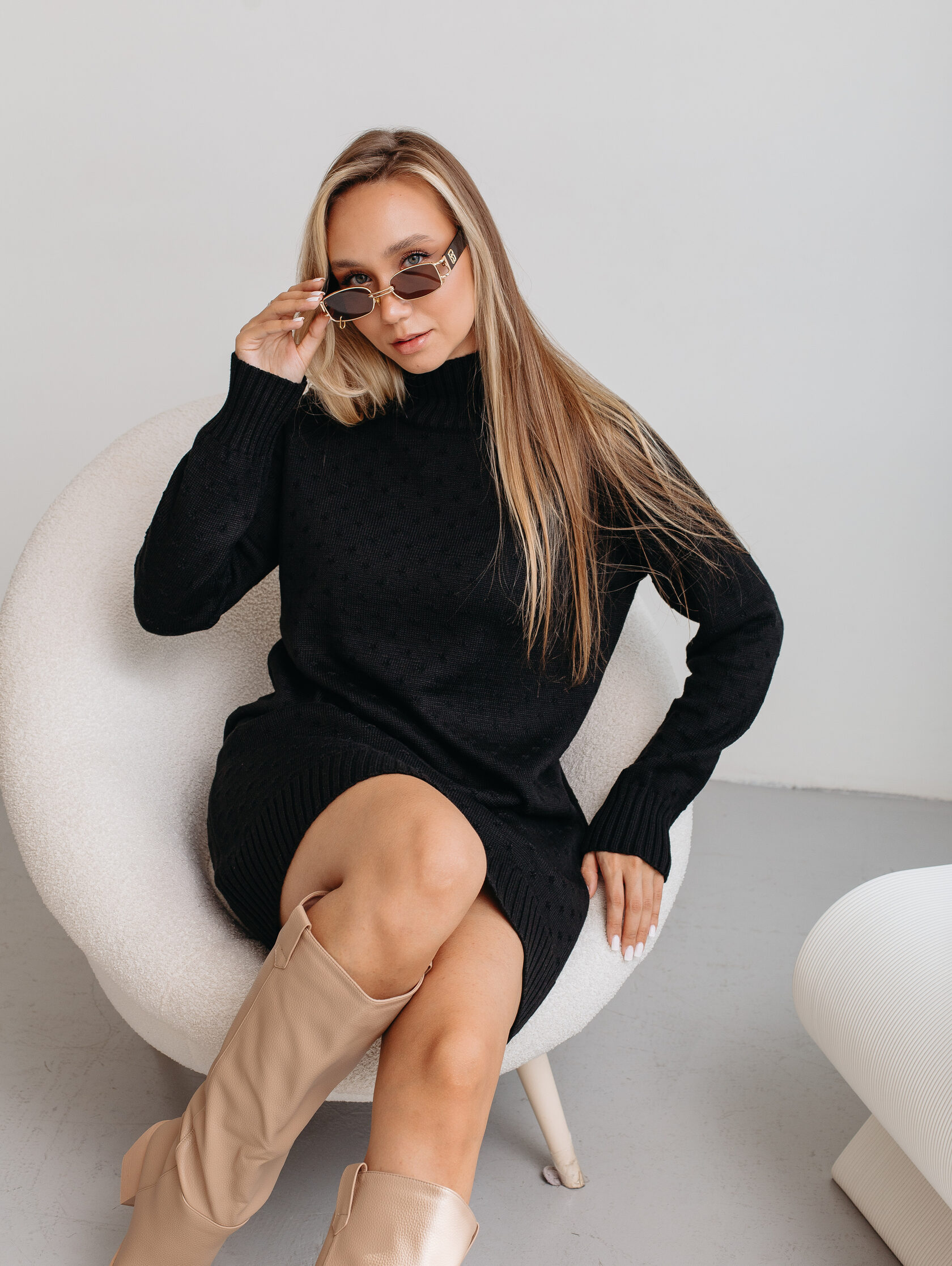 Повседневное женское платье свободного силуэта средней длины,с длинным рукавом покроя реглан. Воротник-стойка оптимальной высоты, выполнен резинкой. Фактурная вязка по всему изделию ярко выражена и добавляет модели особую женственность и привлекательность. Низ изделия и низ рукава завершены резинкой.