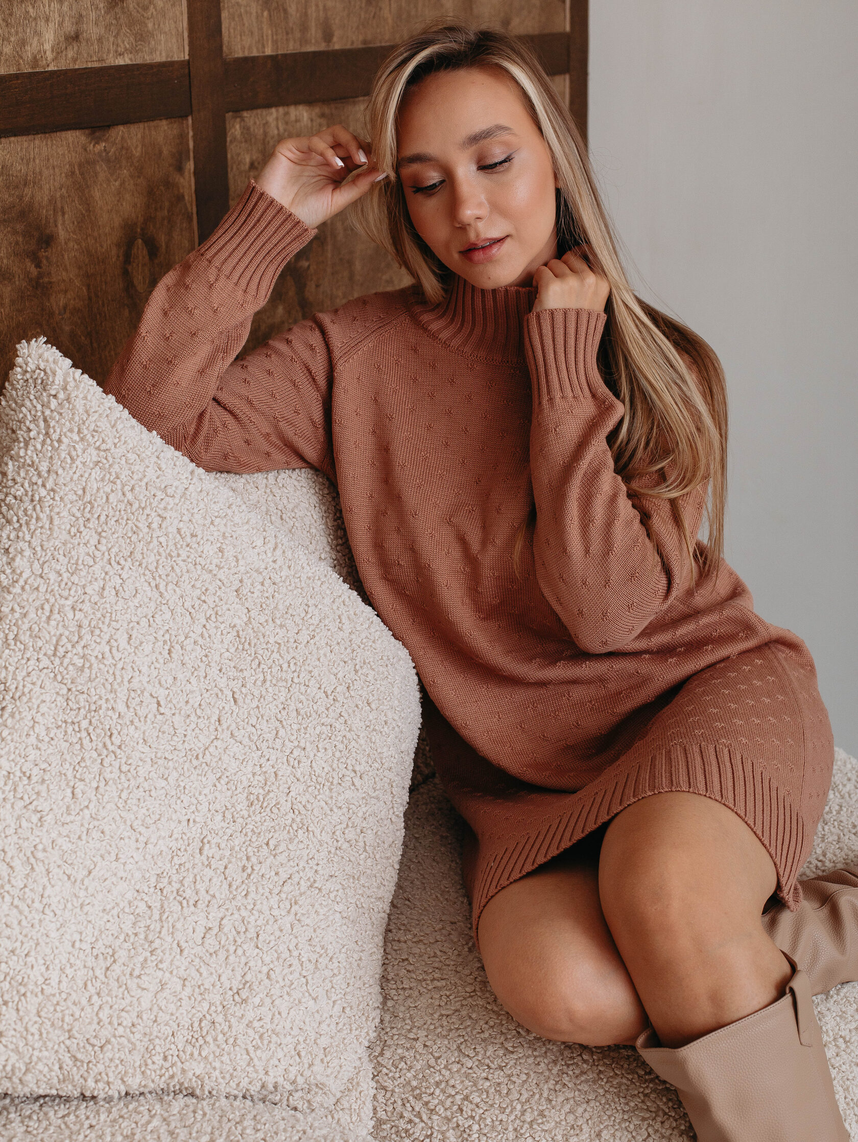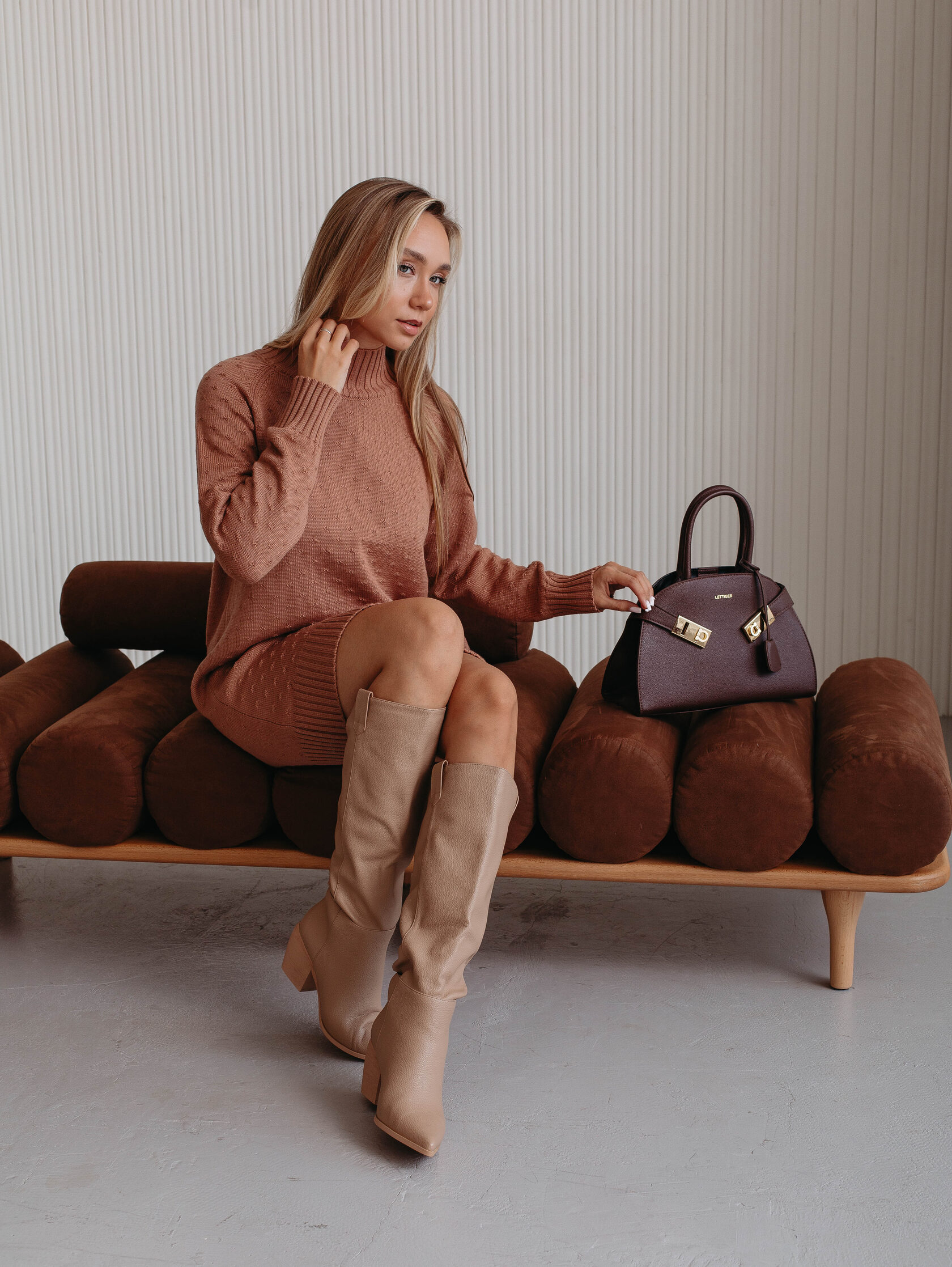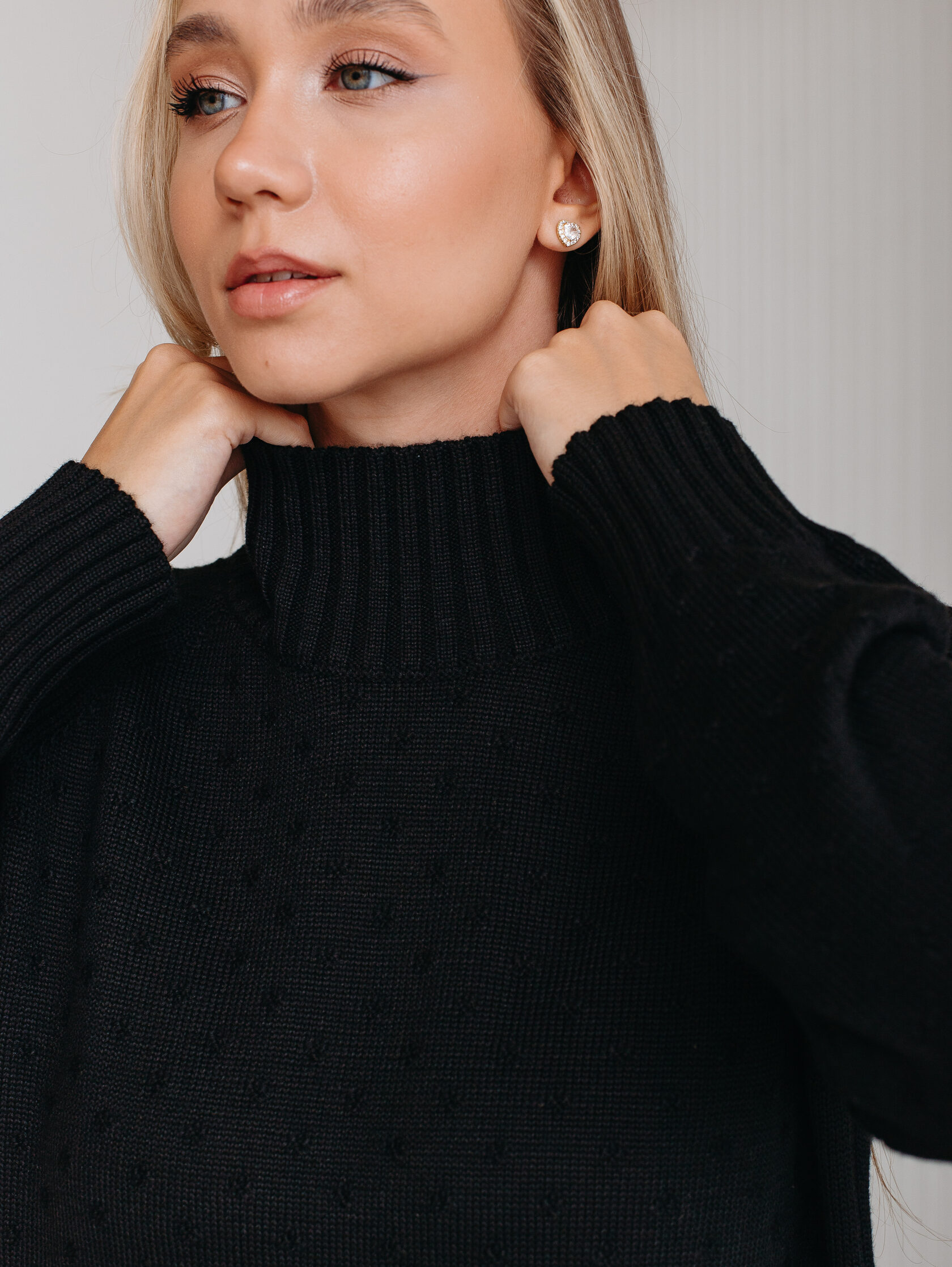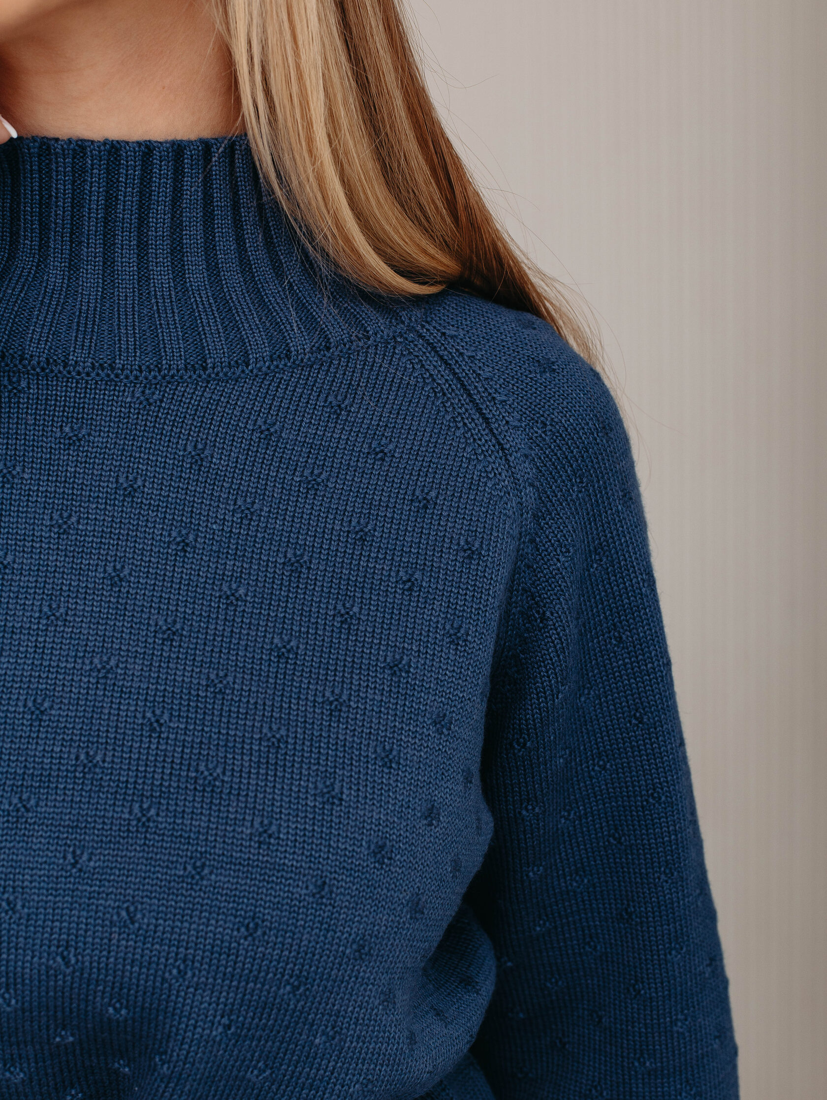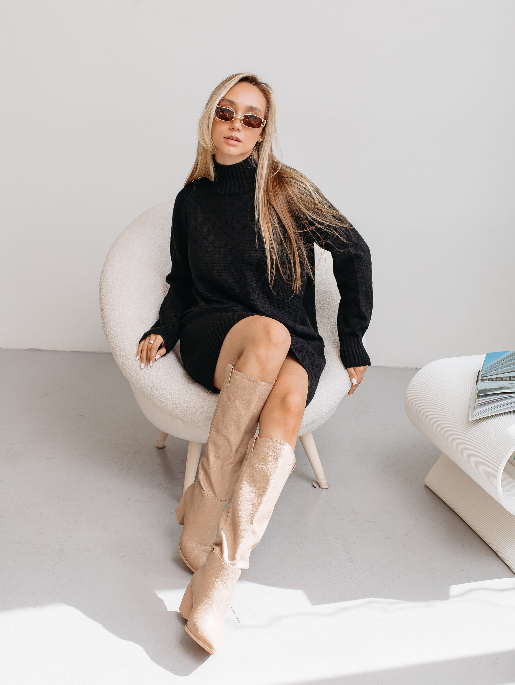 Повседневное женское платье свободного силуэта средней длины,с длинным рукавом покроя реглан. Воротник-стойка оптимальной высоты, выполнен резинкой. Фактурная вязка по всему изделию ярко выражена и добавляет модели особую женственность и привлекательность. Низ изделия и низ рукава завершены резинкой.